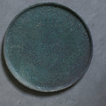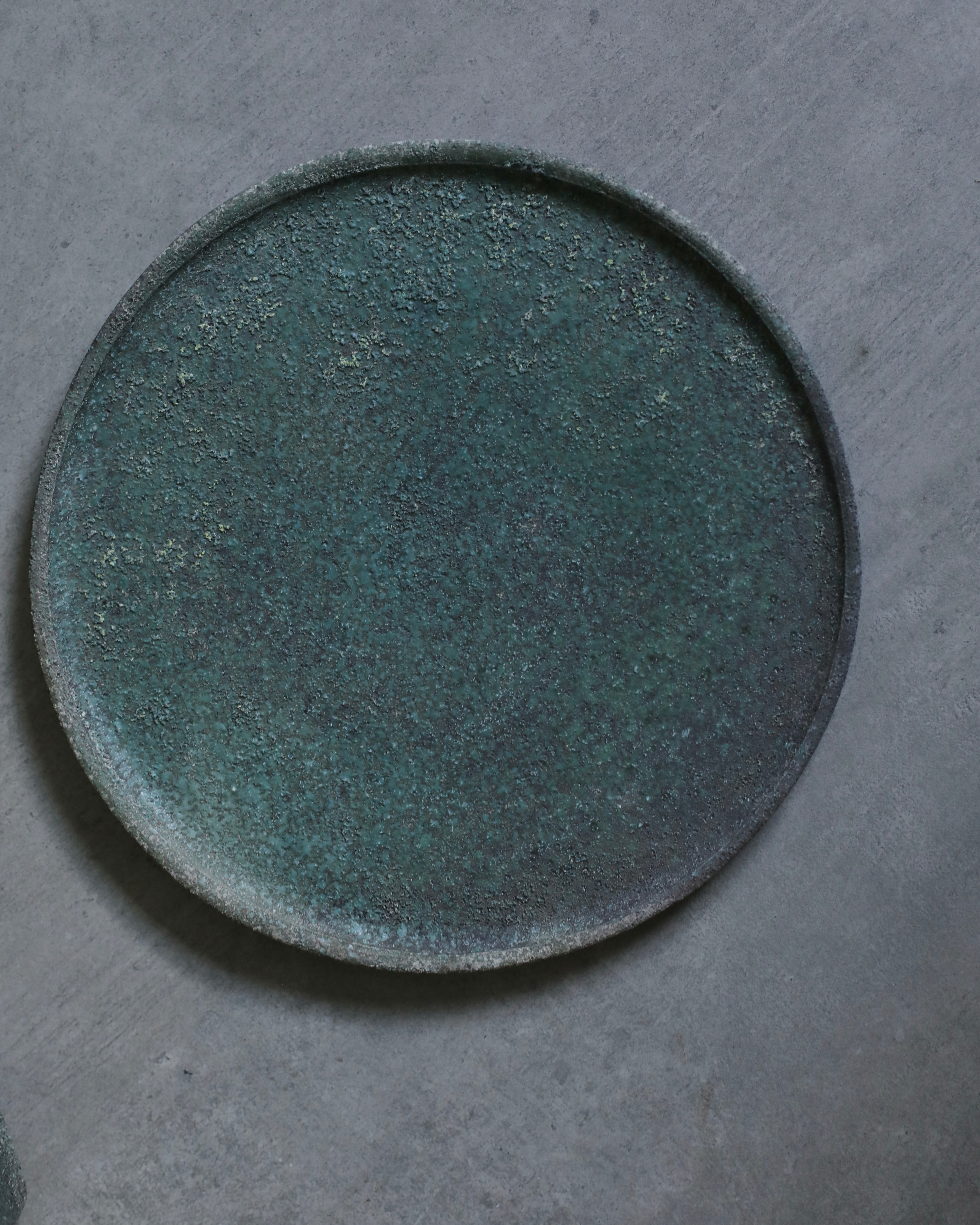 An artisanal small plate hand-crafted by Etsuji Noguchi. This plate is made from naturally sourced materials and has been exquisitely hand-turned before being fired in a textured lichen-like glaze. The plates surface is a rich chroma of dappled blue-green verdigris and moss green with areas of crystallization towards its centre.