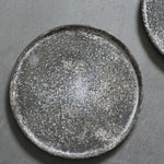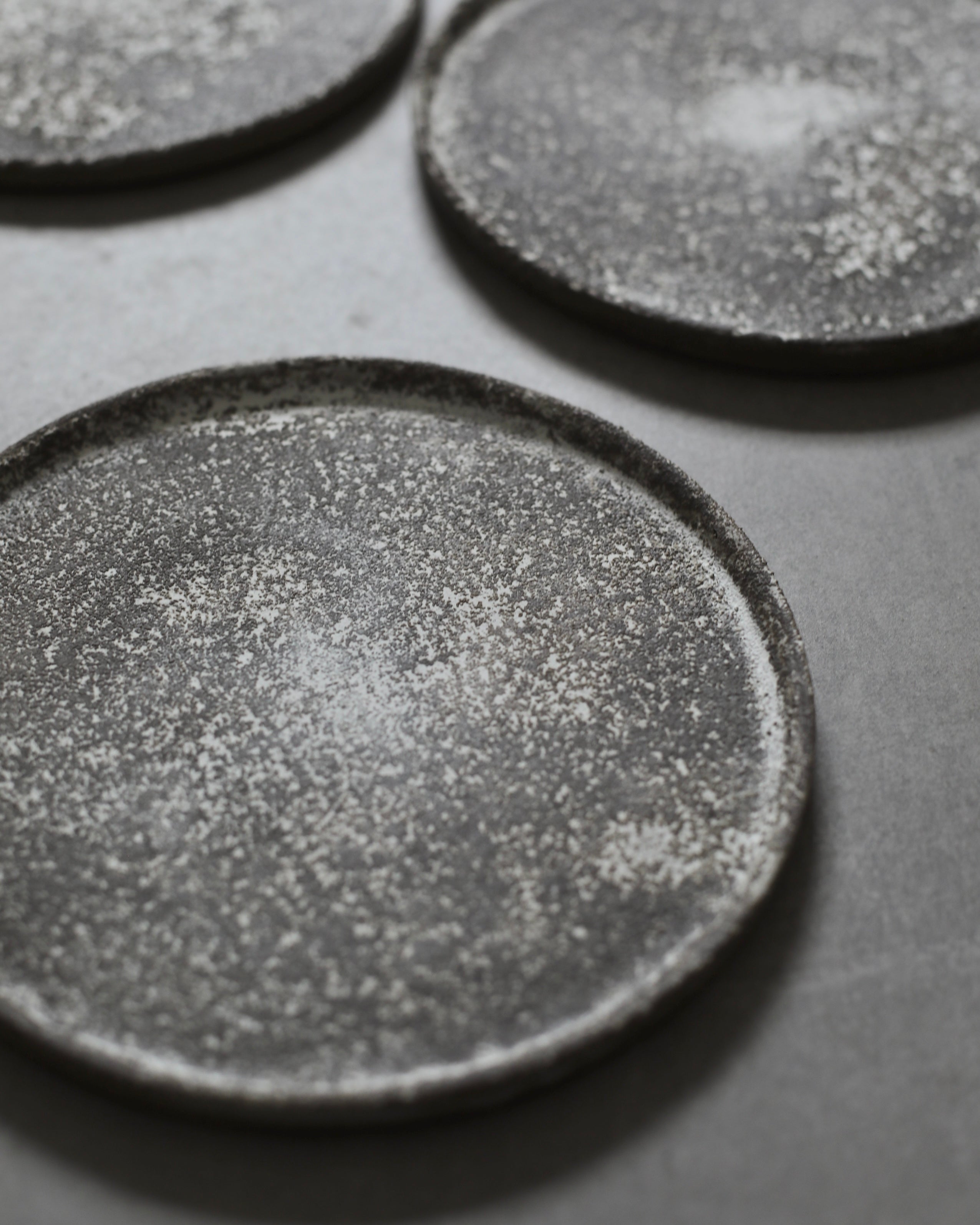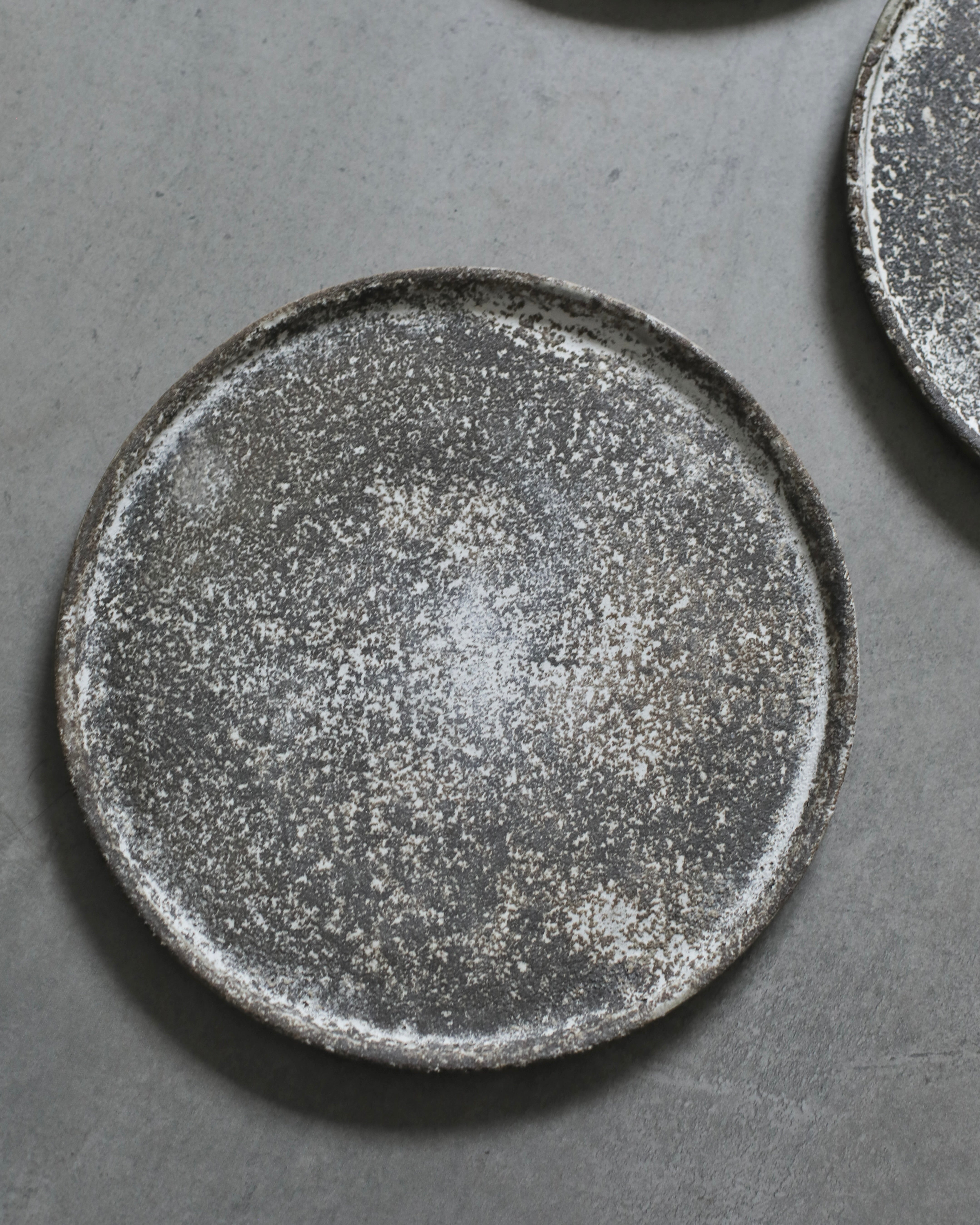 With its low profile and gently textured surface, this flat plate recalls the quiet solidity of cast concrete. Natural tones are accented by scattered white flecks, giving the piece a grounded, architectural presence while retaining a sense of quiet refinement.