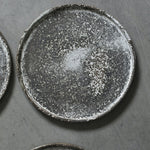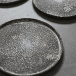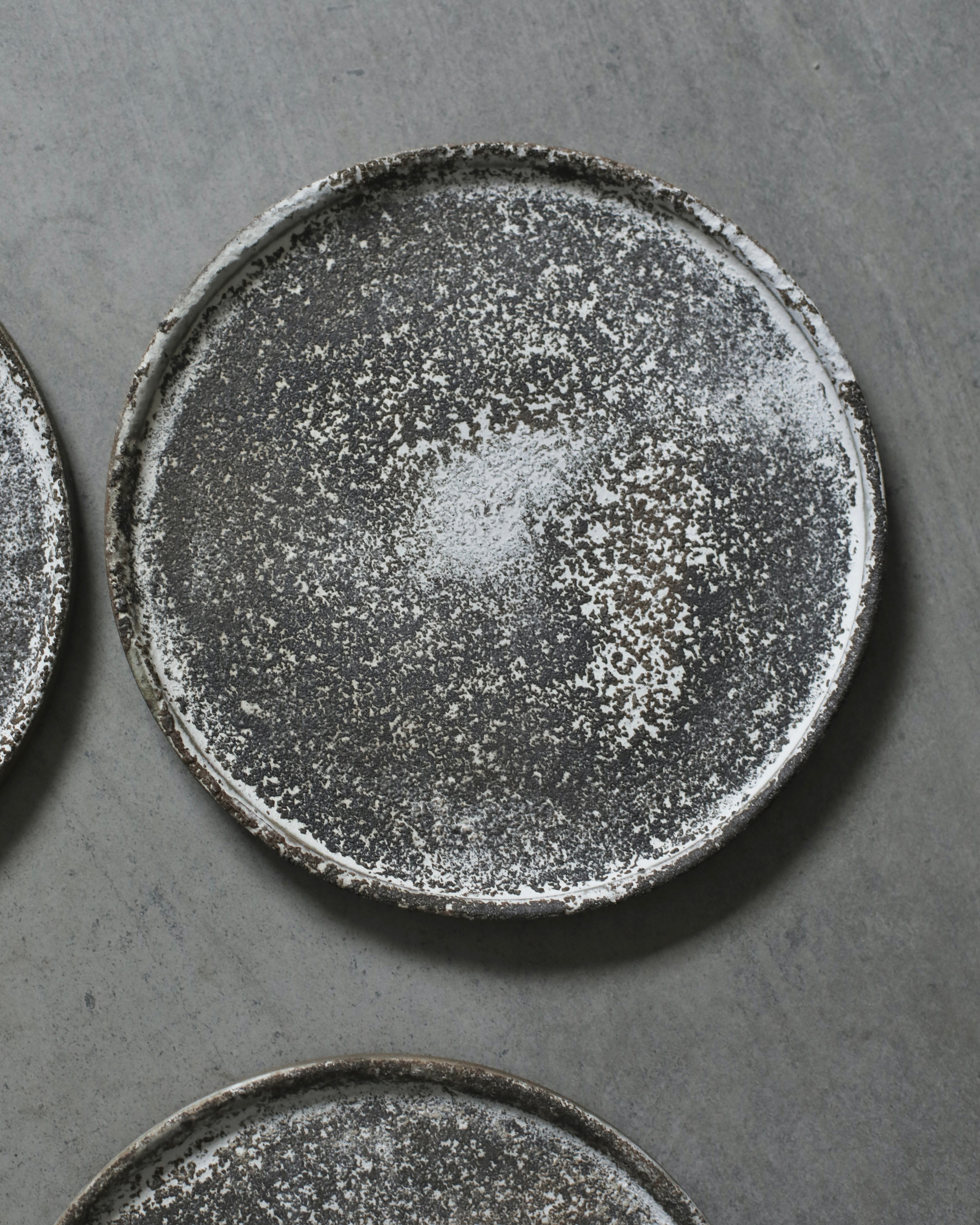 With its low profile and gently textured surface, this flat plate recalls the quiet solidity of cast concrete. Natural tones are accented by scattered white flecks, giving the piece a grounded, architectural presence while retaining a sense of quiet refinement.