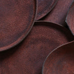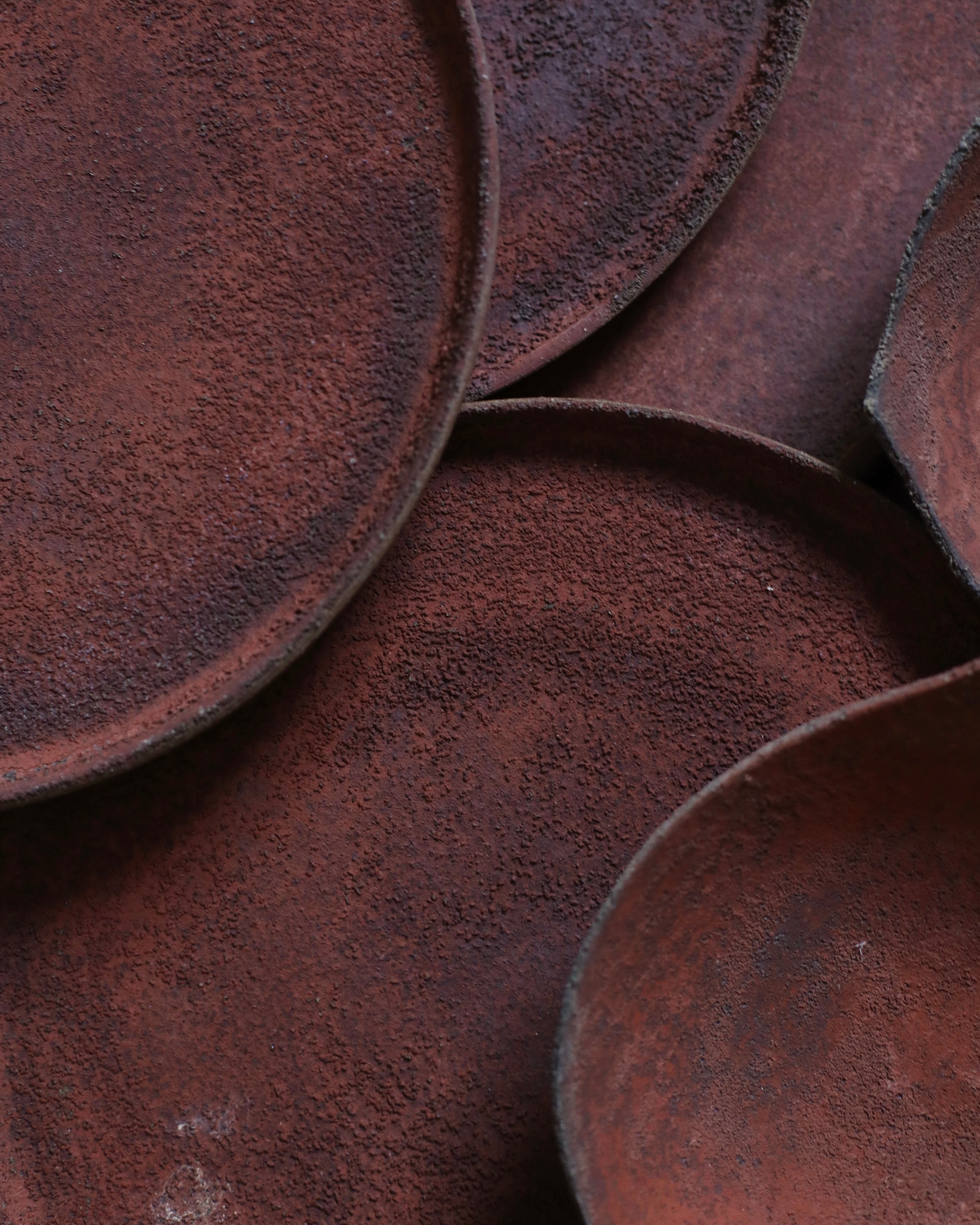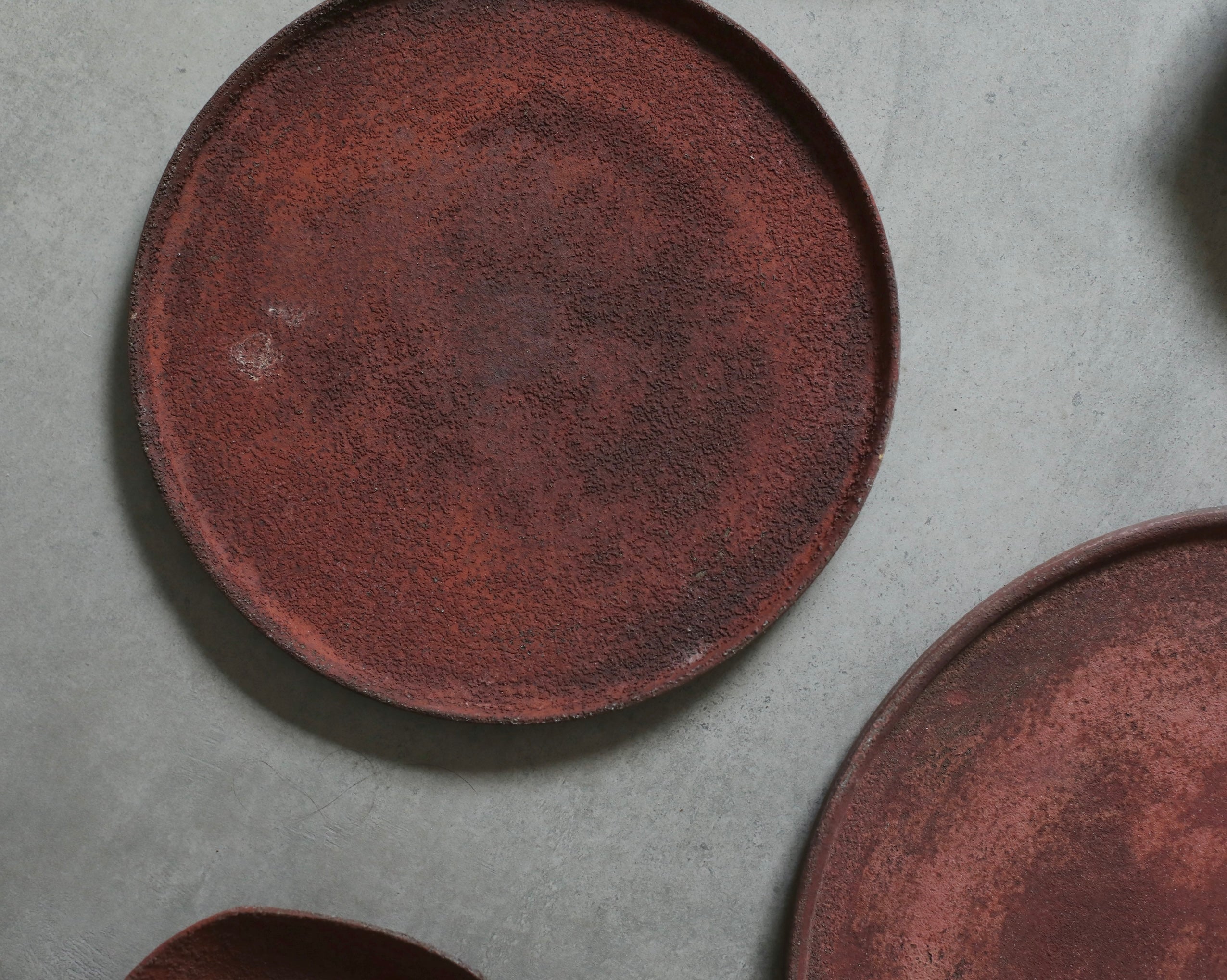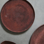 Simple in form, this flat round plate is grounded by its wide, open surface. Its surface carries a crystalline texture, enriched by a layered blend of red, ochre, and deep natural browns—evoking the earthiness of mineral surfaces and the softness of organic form.