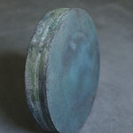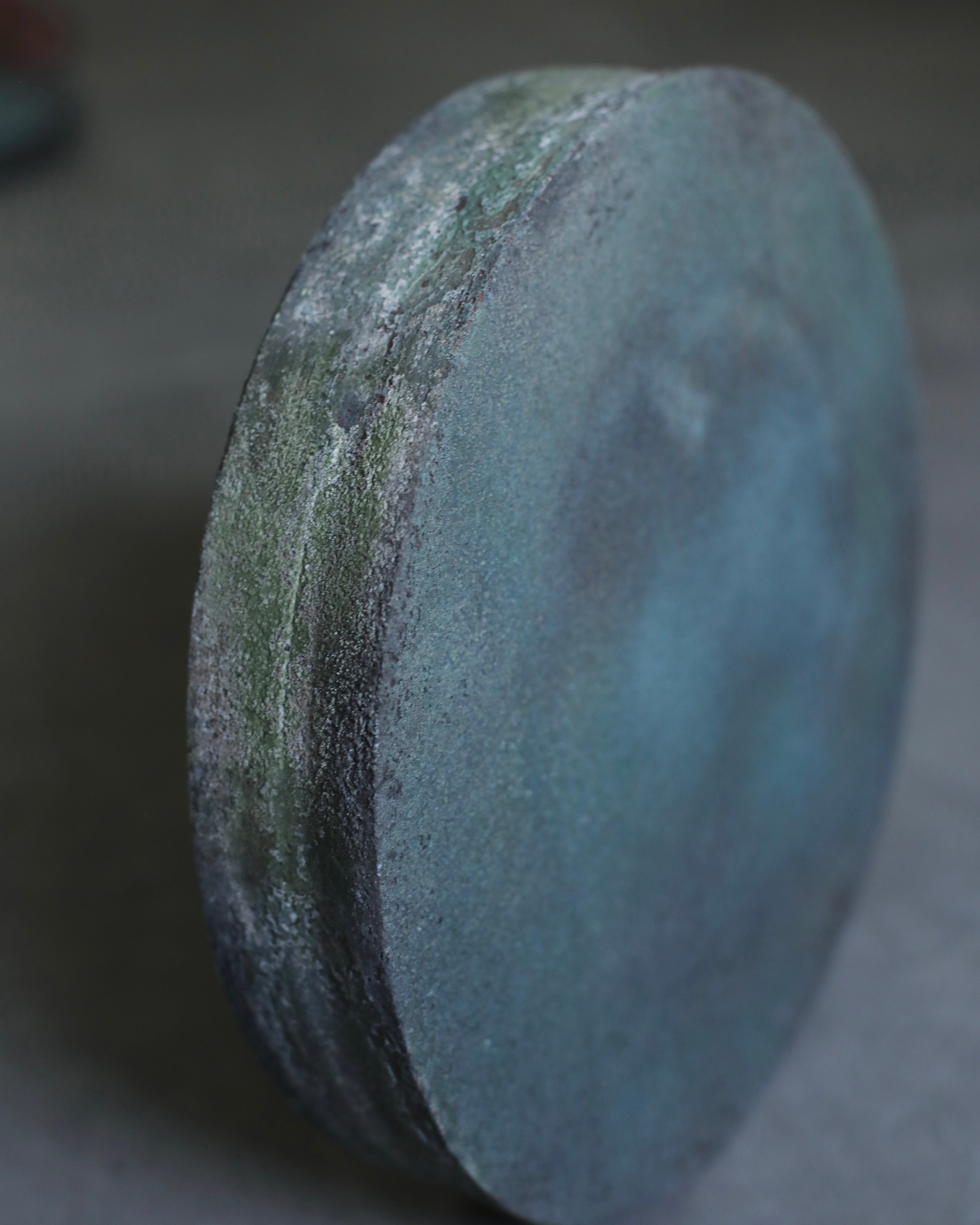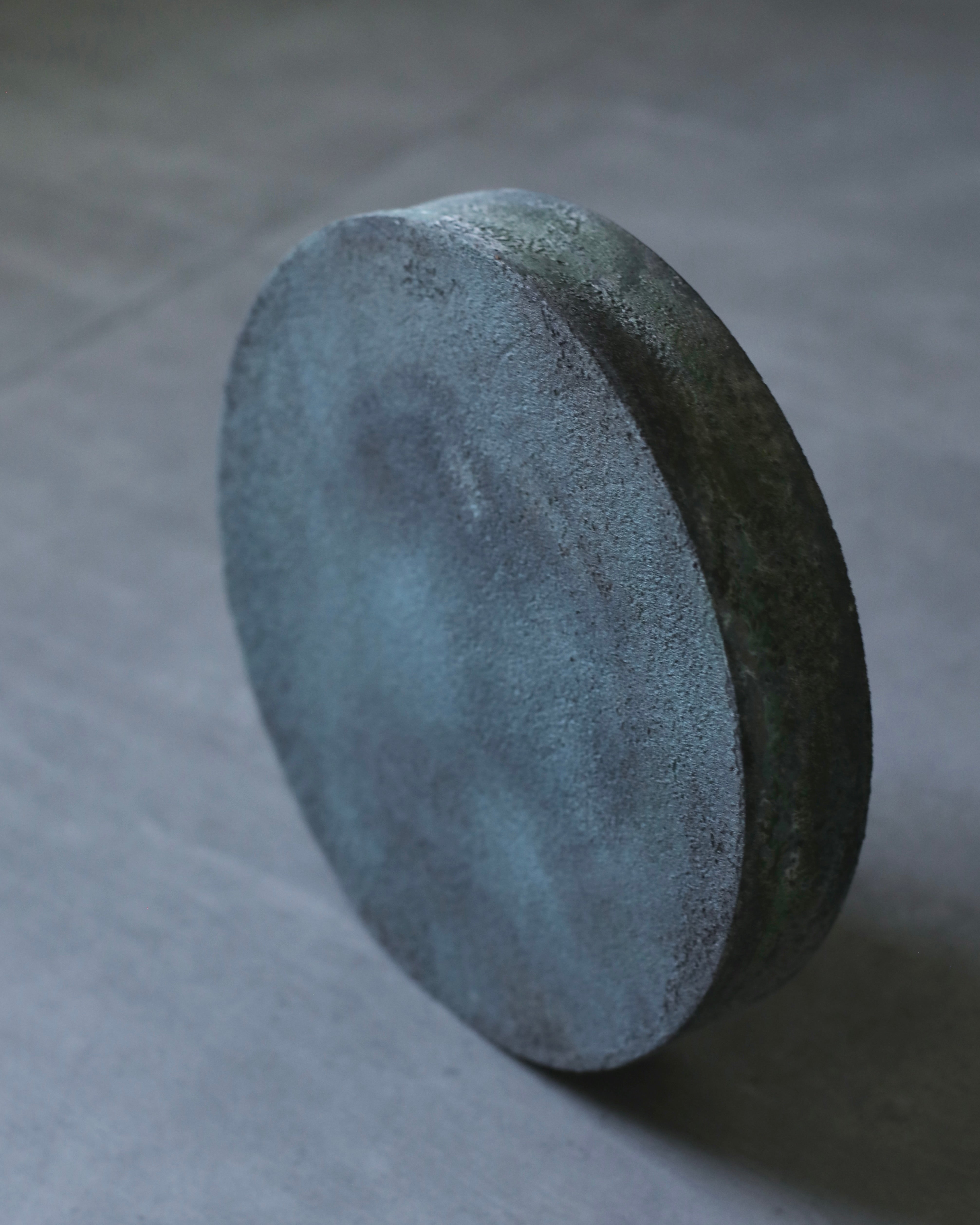 This object is a double-sided pedestal form, balanced between function and abstraction. One side is flat and grounded, while the other curves gently upward into a shallow, dish-like surface, suggesting quiet potential for holding or display. Its surface is richly textured, with layered tones of moss and verdigris green, evoking the slow transformation of metal, stone, and time. At once sculptural and adaptable, it invites shifting perspectives and use.
