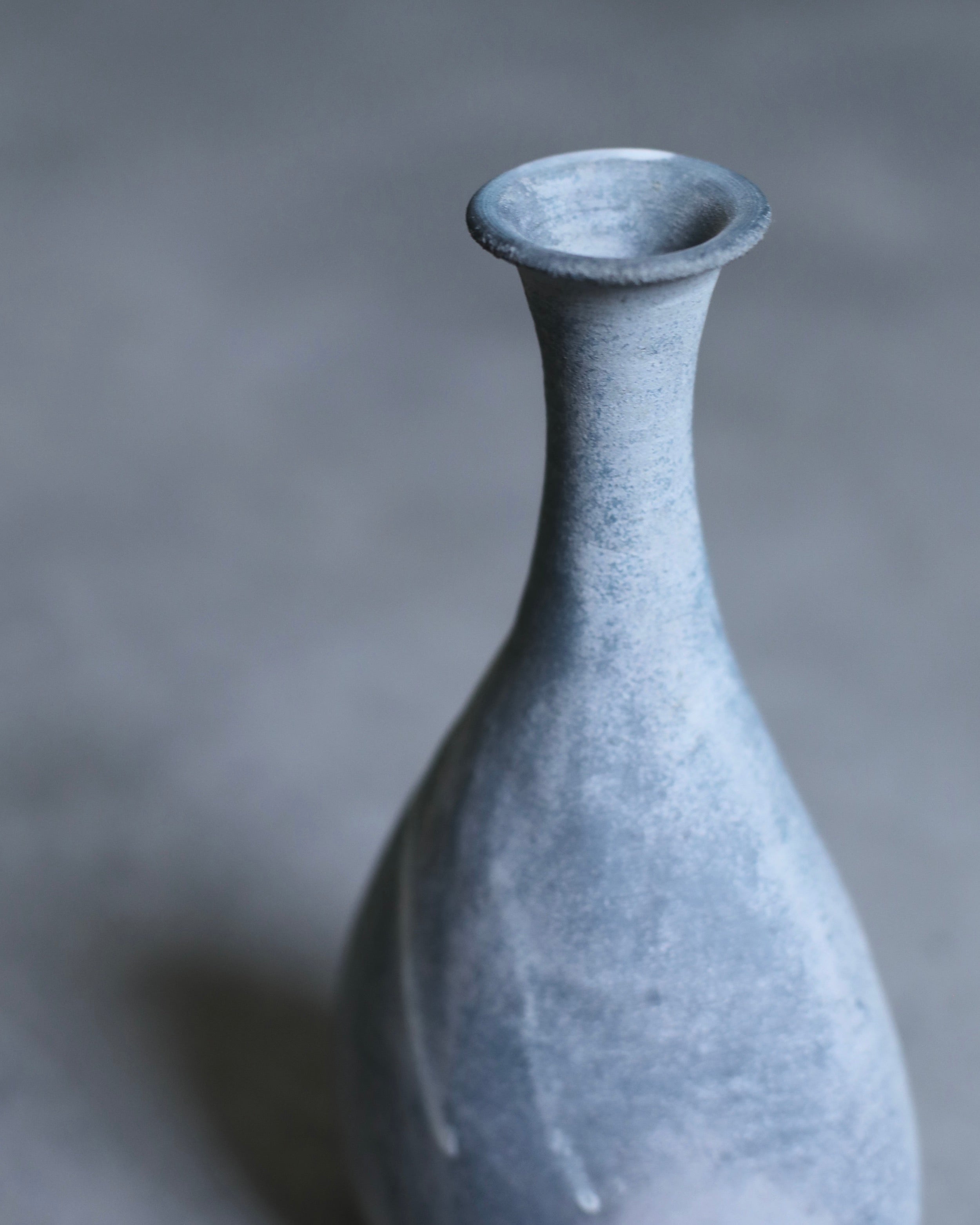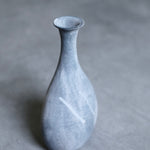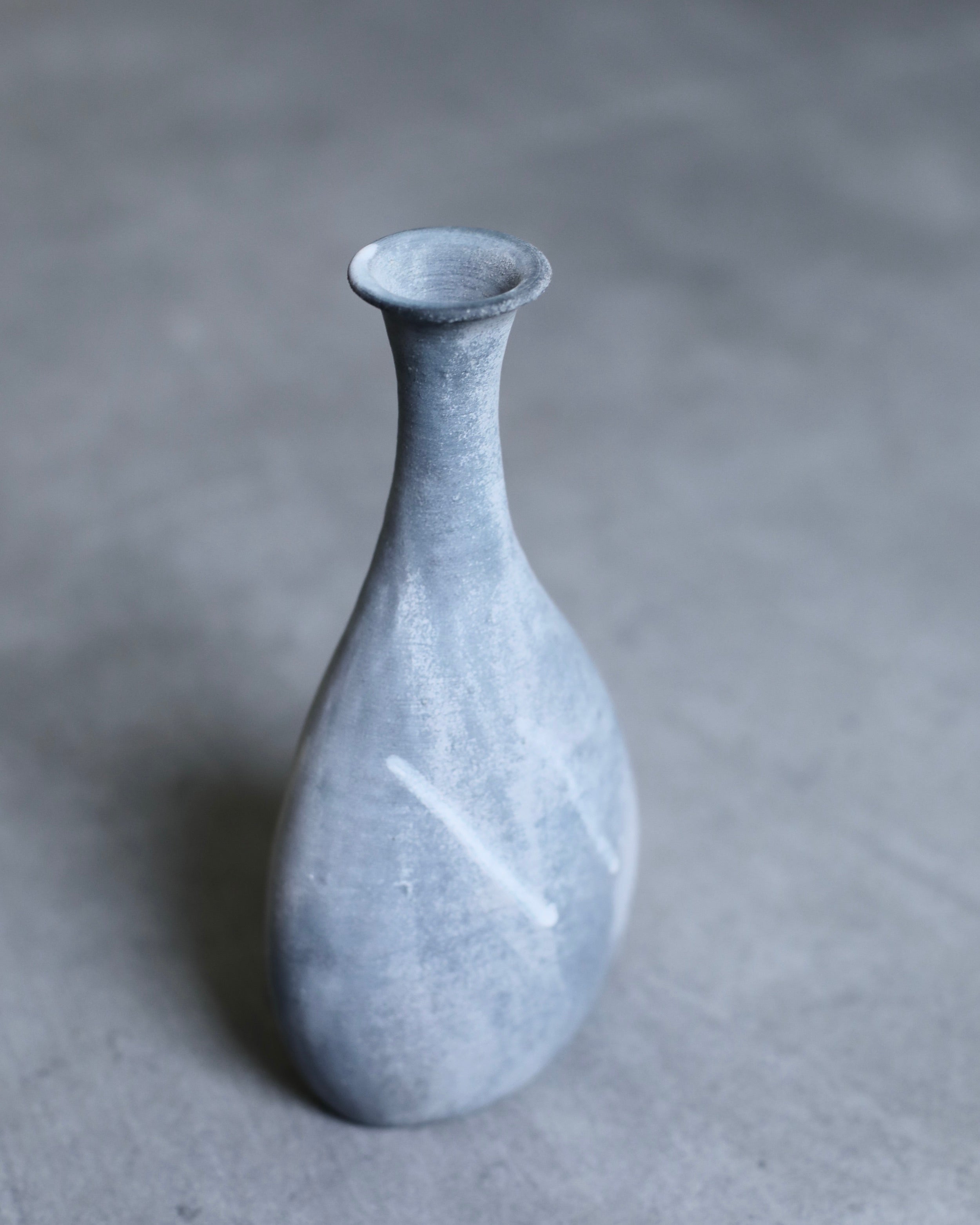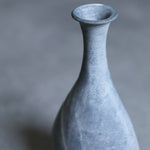 This vessel presents a form that shifts with perspective, rising from a broad base to a tall, slender neck. Finished in soft, smooth matte grey, it bears subtle marks of the maker’s hand, veiled in natural greys that drift in vertical sweeps across the form.