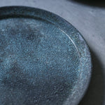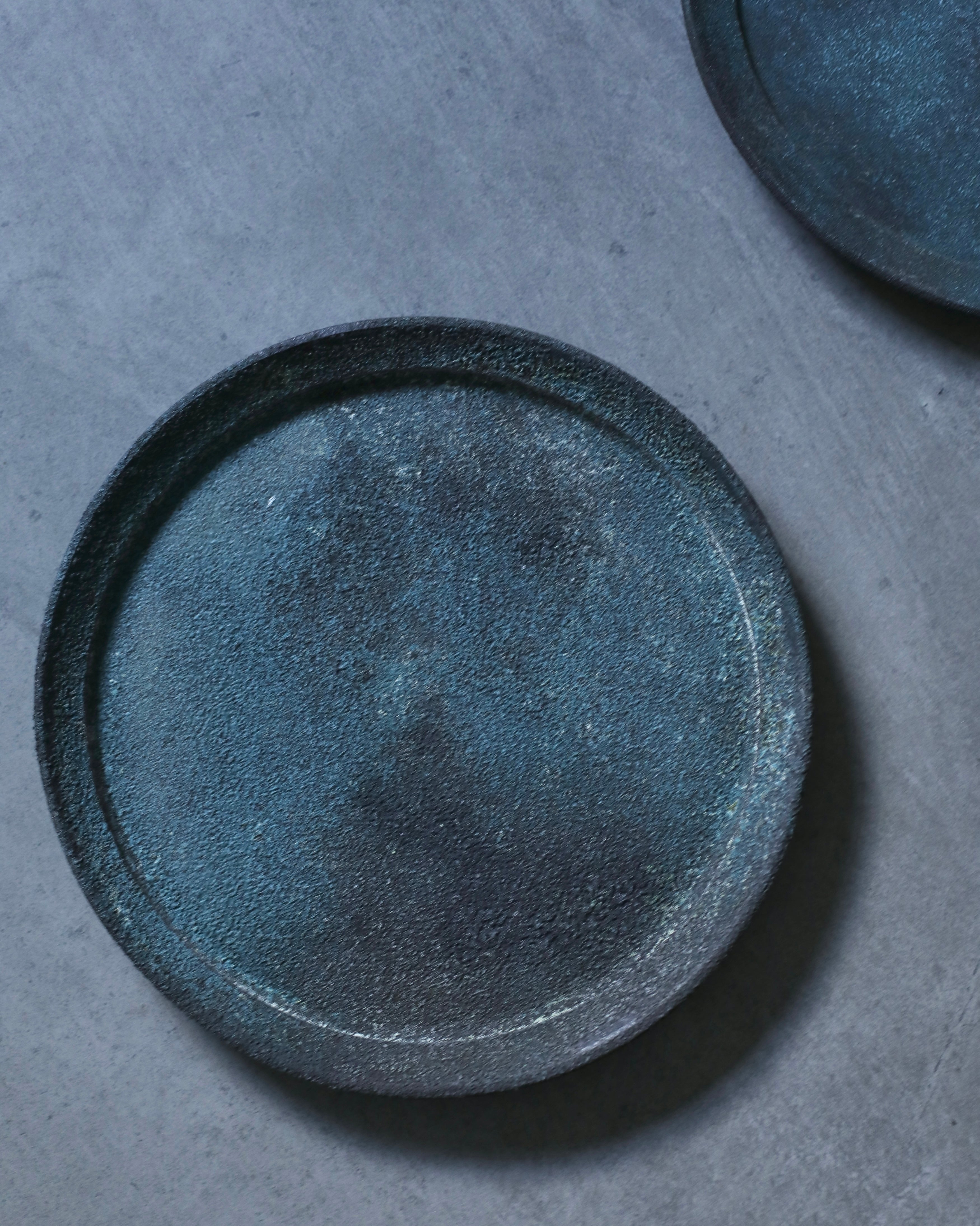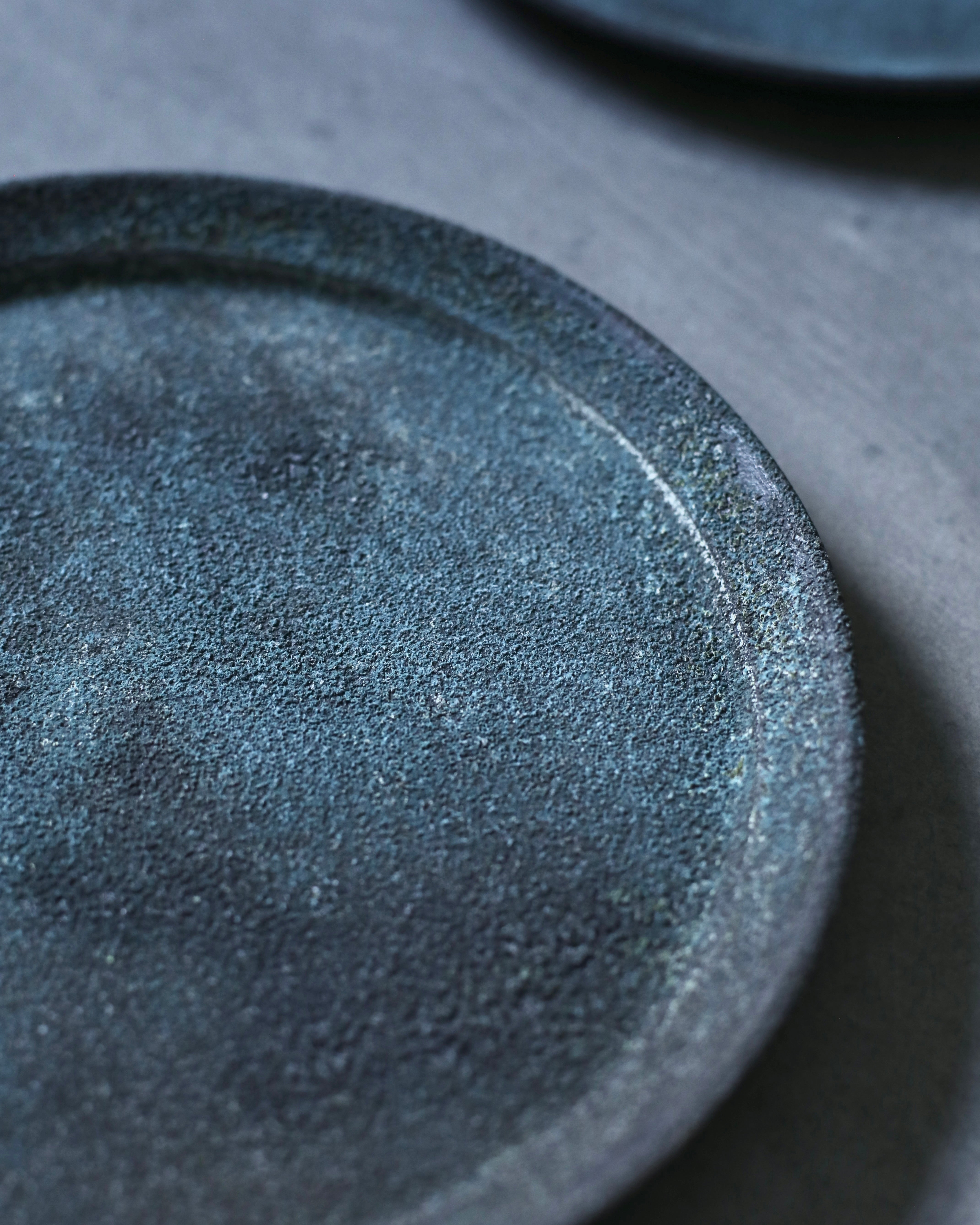 An artisanal small plate hand-crafted by Etsuji Noguchi. This plate is made from naturally sourced materials and has been exquisitely hand-turned before being fired in a textured lichen-like glaze. The plates surface is a rich chroma of dappled blue-green verdigris and moss green with areas of crystallization towards its centre. A small step at the plate’s lip exposes the deep chard-red clay beneath, accentuating its sophisticated forms.