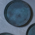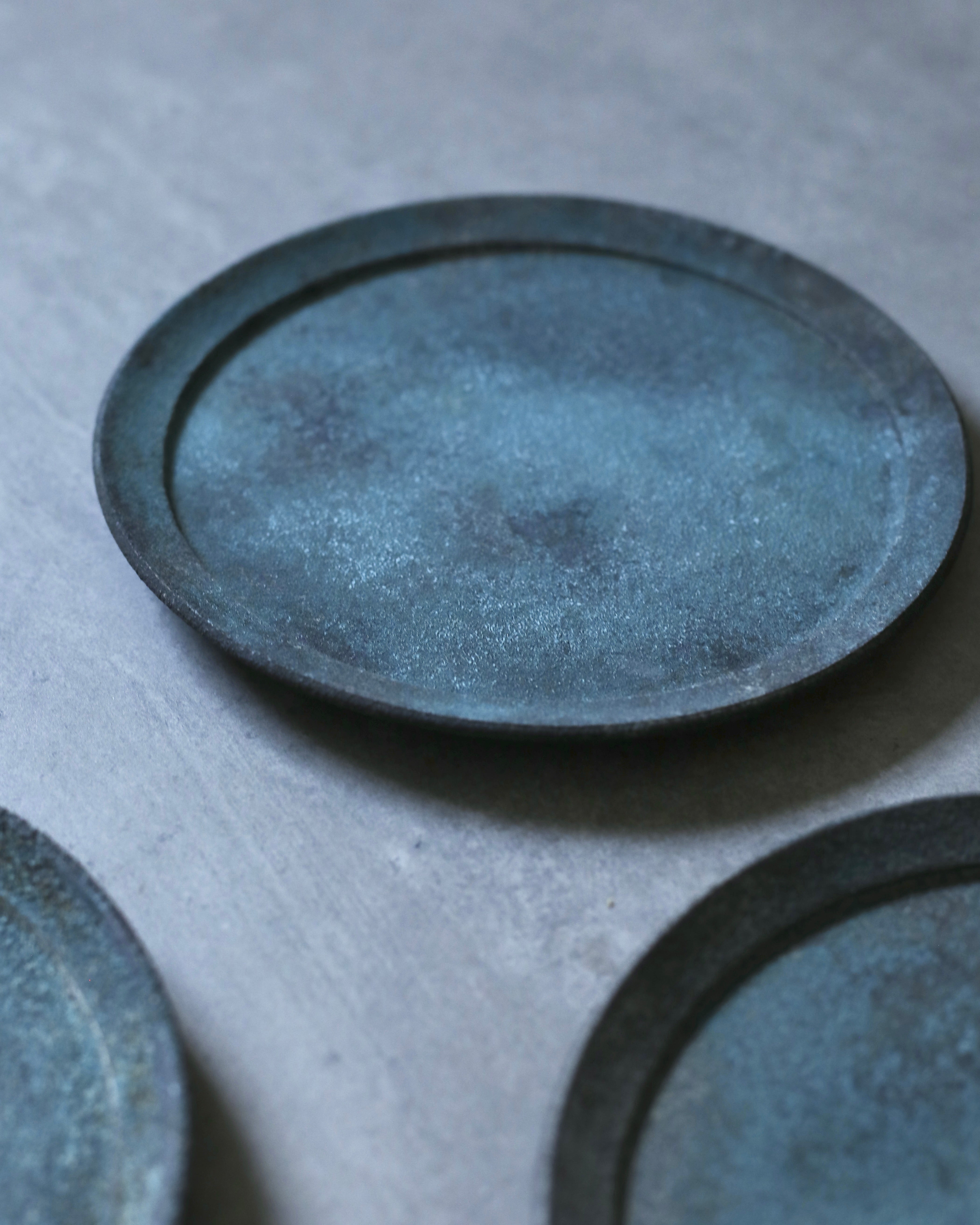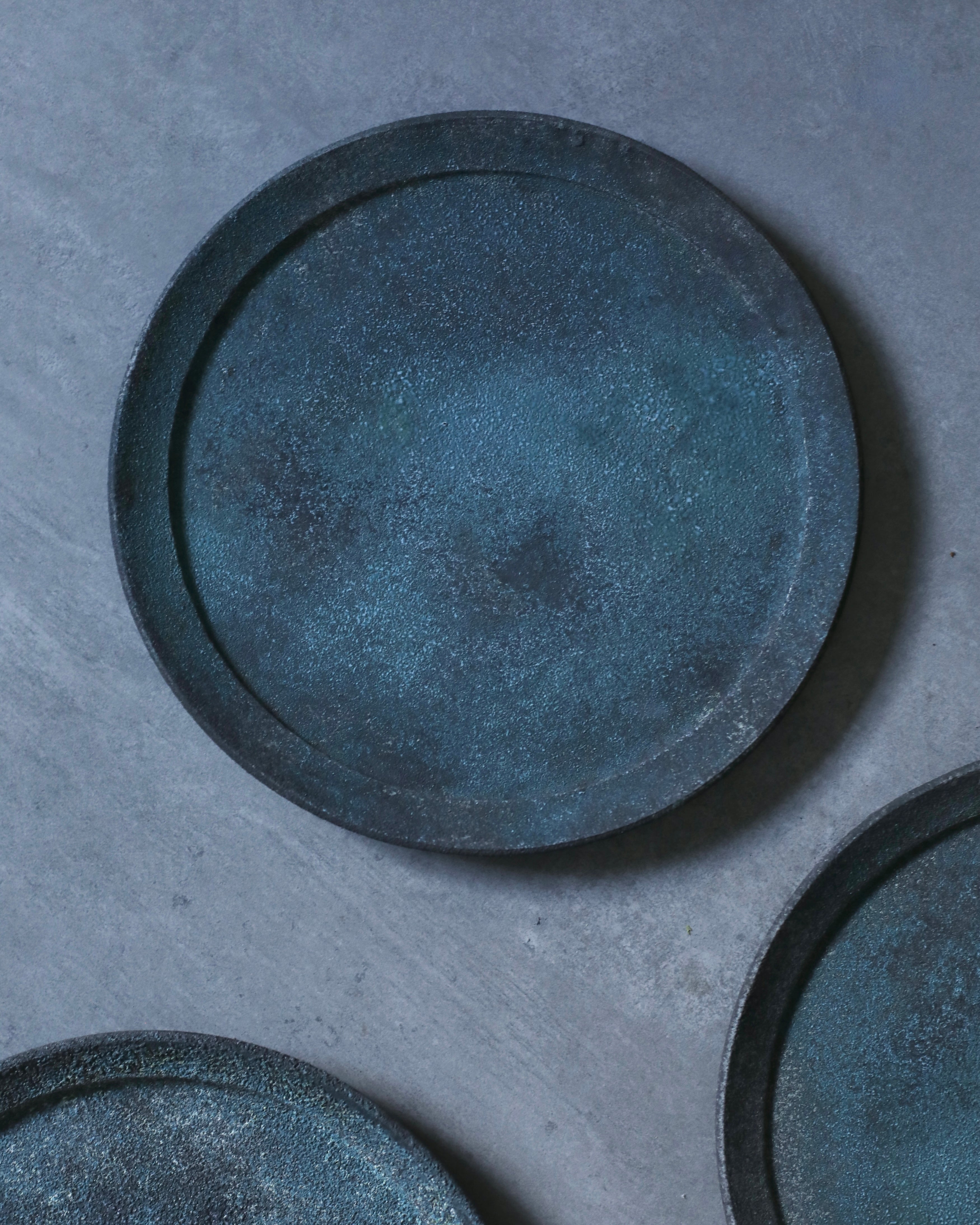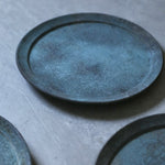 An artisanal small plate hand-crafted by Etsuji Noguchi. This plate is made from naturally sourced materials and has been exquisitely hand-turned before being fired in a textured lichen-like glaze. The plates surface is a rich chroma of dappled blue-green verdigris and moss green with areas of crystallization towards its centre. A small step at the plate’s lip exposes the deep chard-red clay beneath, accentuating its sophisticated forms.