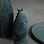 Resting on a flat circular base, this compact form expands into a softly faceted, oval silhouette; somewhere between a diamond and a droplet. This vessel is made from naturally sourced materials and has been exquisitely hand-turned before being fired in a textured lichen-like glaze. The bottle’s surface bears a crystalline texture, enriched by a deep chromatic blend of verdigris and moss green.