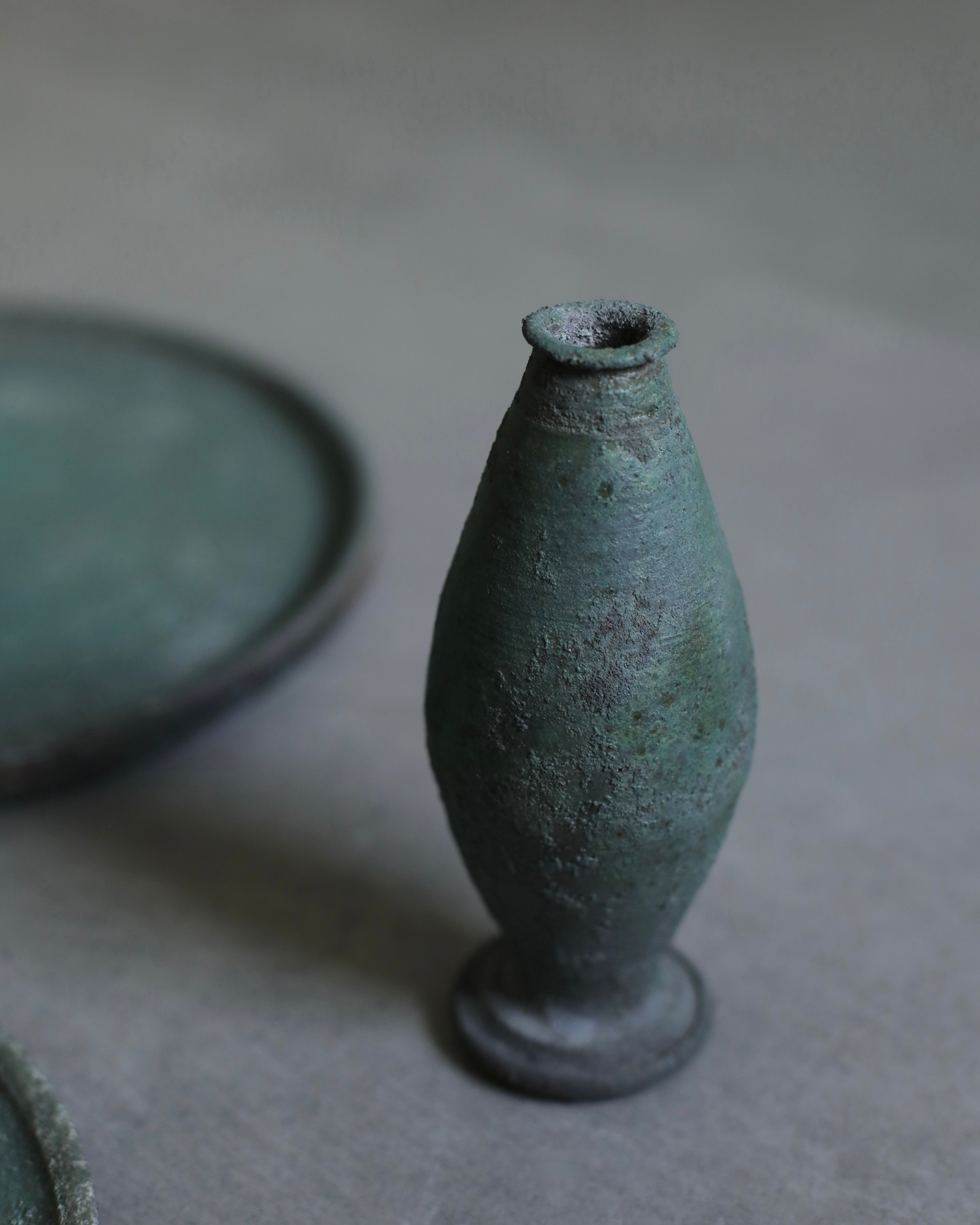 Noguchi's mastery of firewood kilns is particularly evident in his latest series, Verdigris Green. These dynamic, finely made pieces murmur through hues of chromium oxide to rich copper green. This hum of colour is echoed in the tactile moss-like surfaces he achieves by adding an accumulation of ash during the firing processes. The resulting works blur the line between contemporary pottery and historical artefacts, endowing them with an enigmatic beauty that leaves the origins of these pieces unclear, an ideal that Noguchi is seeking within his work.