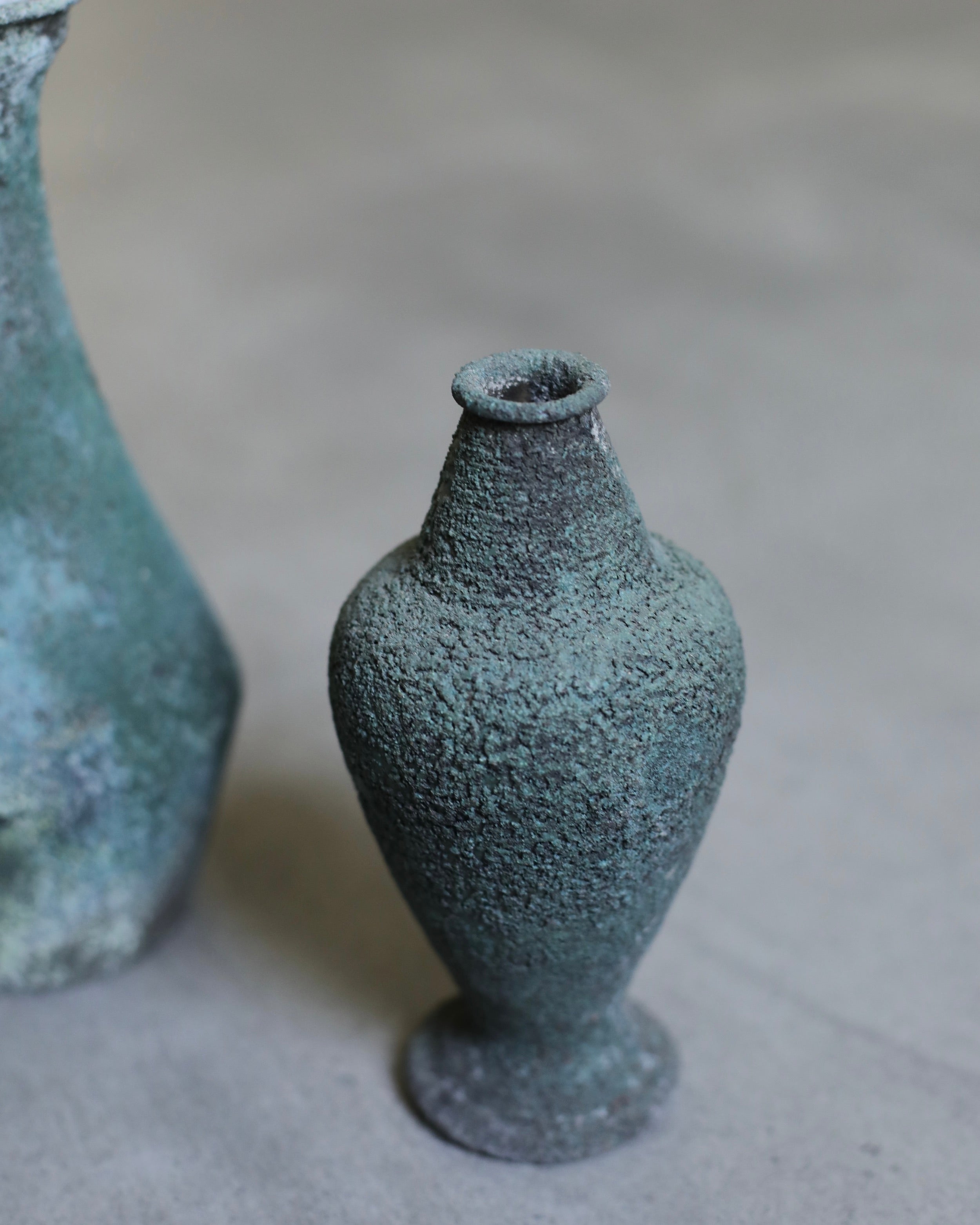 Noguchi's mastery of firewood kilns is particularly evident in his latest series, Verdigris Green. These dynamic, finely made pieces murmur through hues of chromium oxide to rich copper green. This hum of colour is echoed in the tactile moss-like surfaces he achieves by adding an accumulation of ash during the firing processes. The resulting works blur the line between contemporary pottery and historical artefacts, endowing them with an enigmatic beauty that leaves the origins of these pieces unclear, an ideal that Noguchi is seeking within his work.