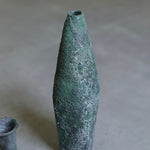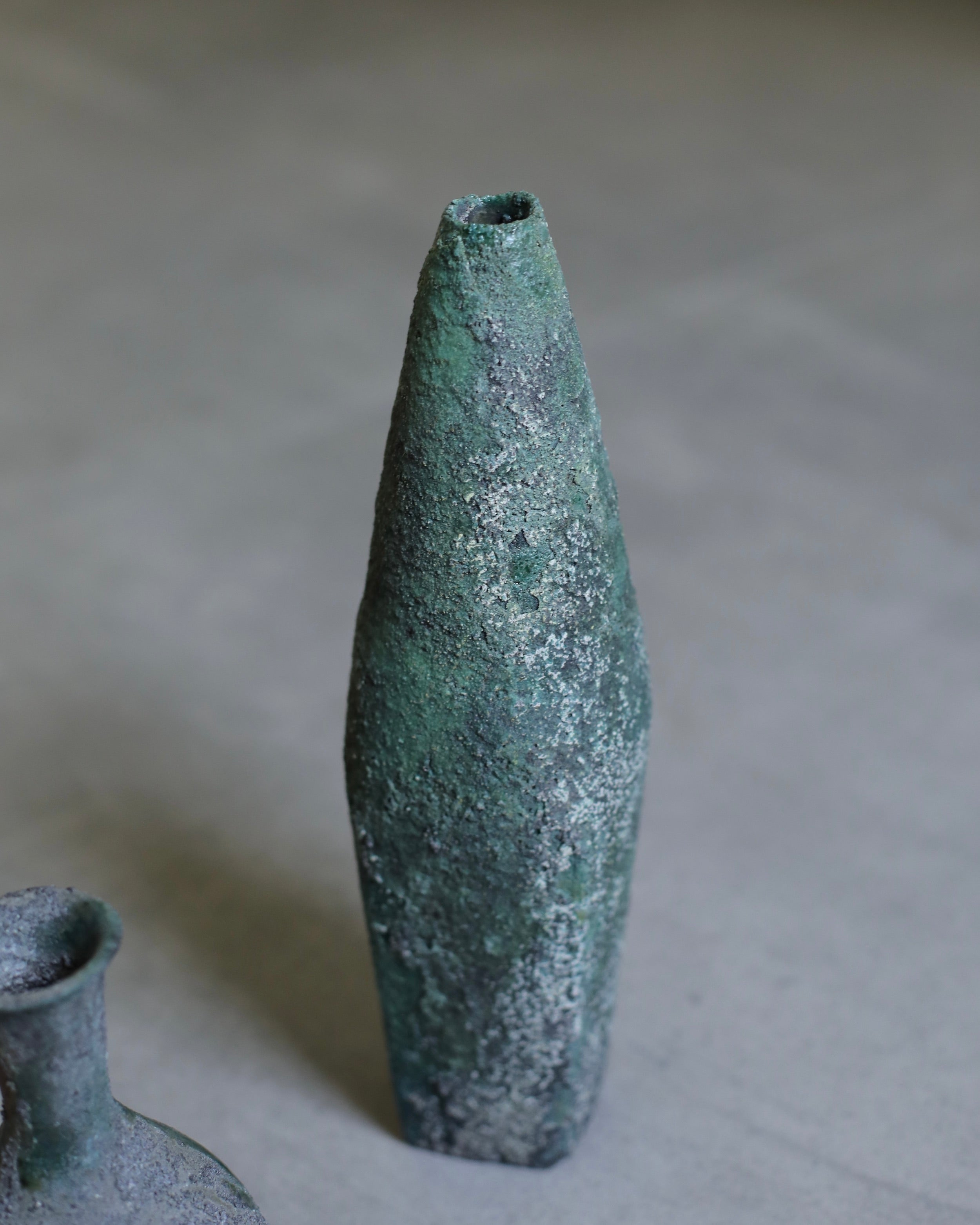 A square-shaped bottle hand-crafted by Etsuji Noguchi. The vase features a unique design, starting with a square-shaped base that gradually transitions into a rounded, slender upper body, culminating in a narrow opening at the top. This vessel is made from naturally sourced materials and has been exquisitely hand-turned before being fired in a textured lichen-like glaze. The bottle’s surface bears a crystalline texture, enriched by a deep chromatic blend of verdigris and moss green.