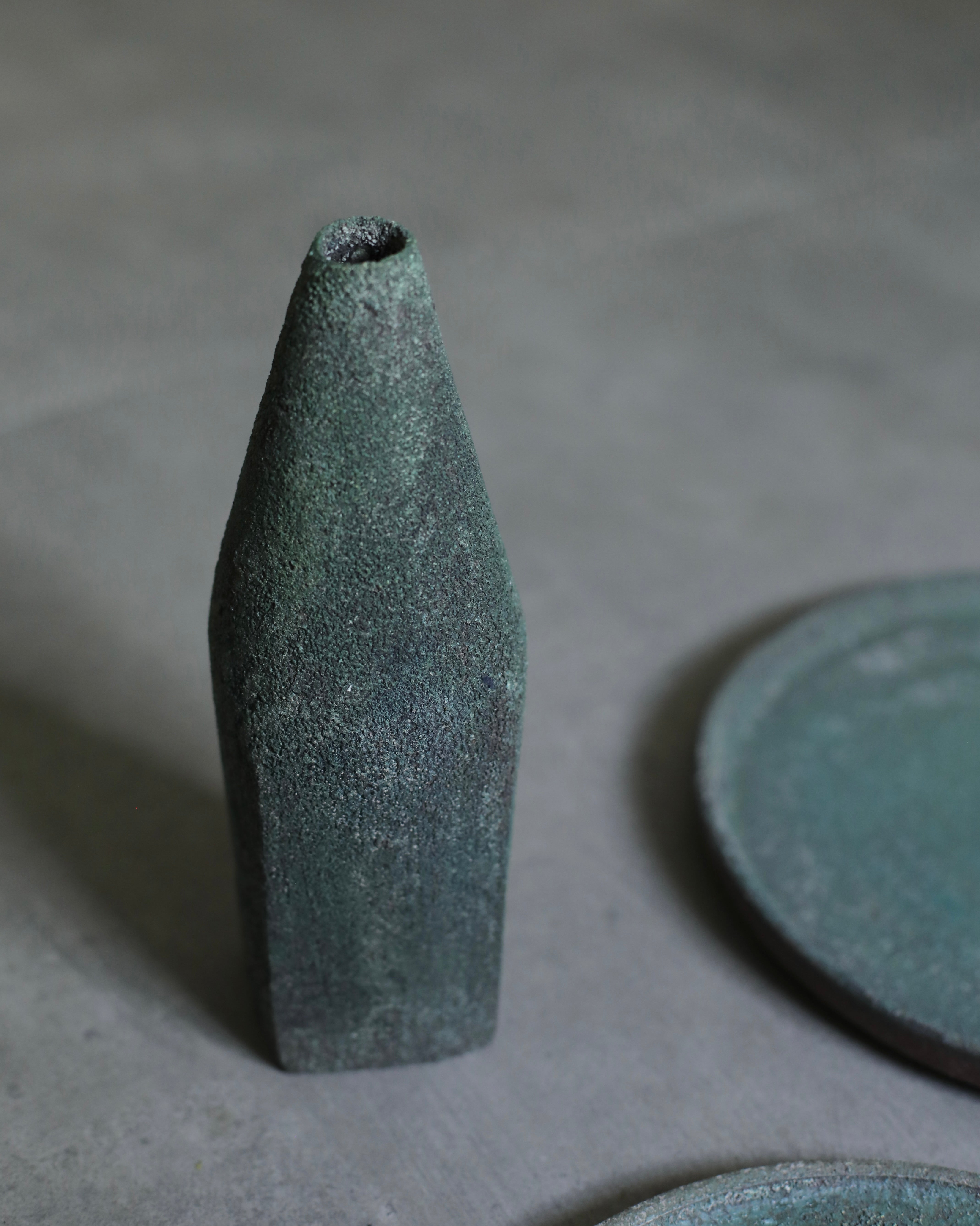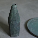 A square-shaped bottle hand-crafted by Etsuji Noguchi. The vase features a unique design, starting with a square-shaped base that gradually transitions into a rounded, slender upper body, culminating in a narrow opening at the top. This vessel is made from naturally sourced materials and has been exquisitely hand-turned before being fired in a textured lichen-like glaze. The bottle’s surface bears a crystalline texture, enriched by a deep chromatic blend of verdigris and moss green.
