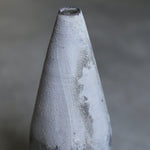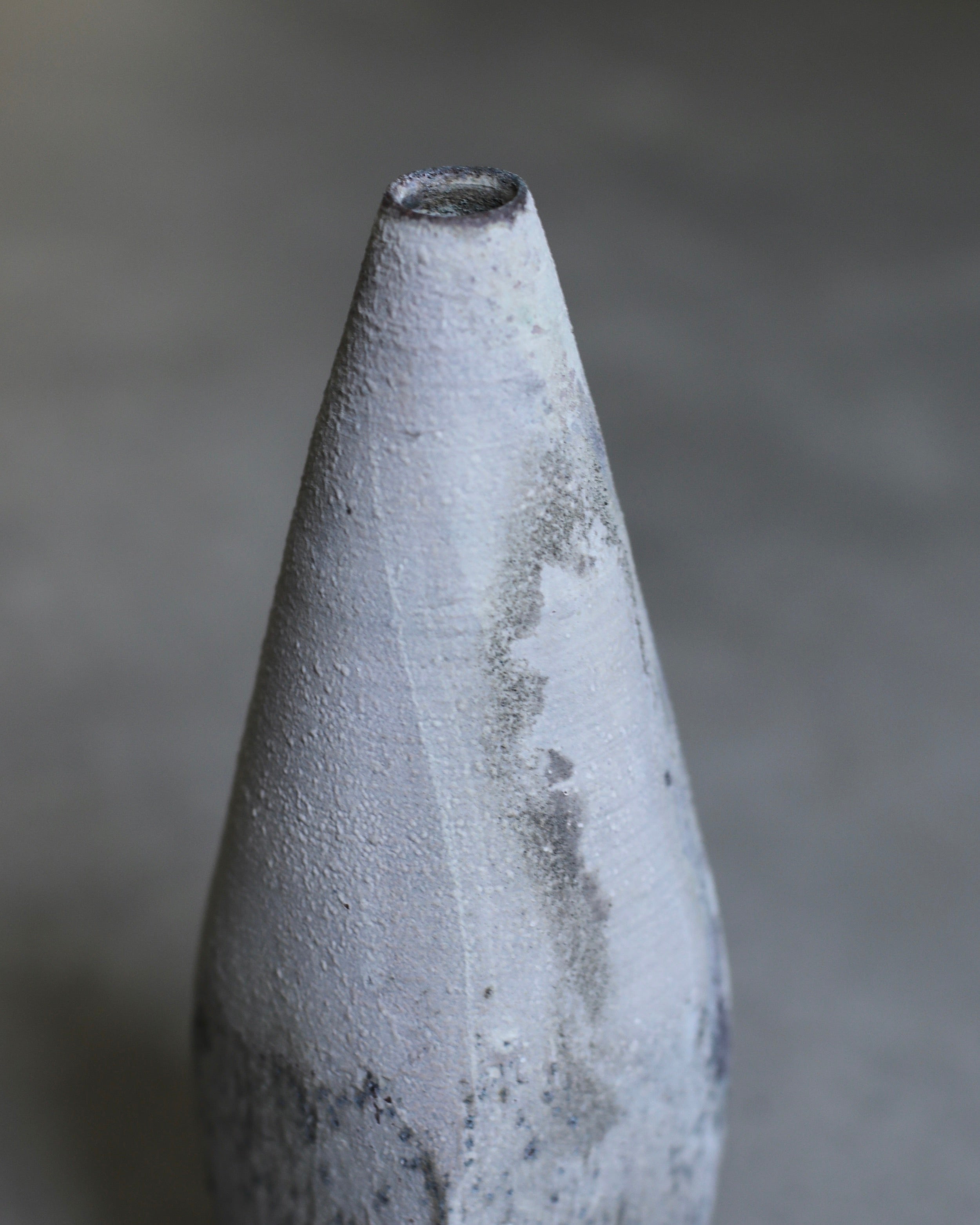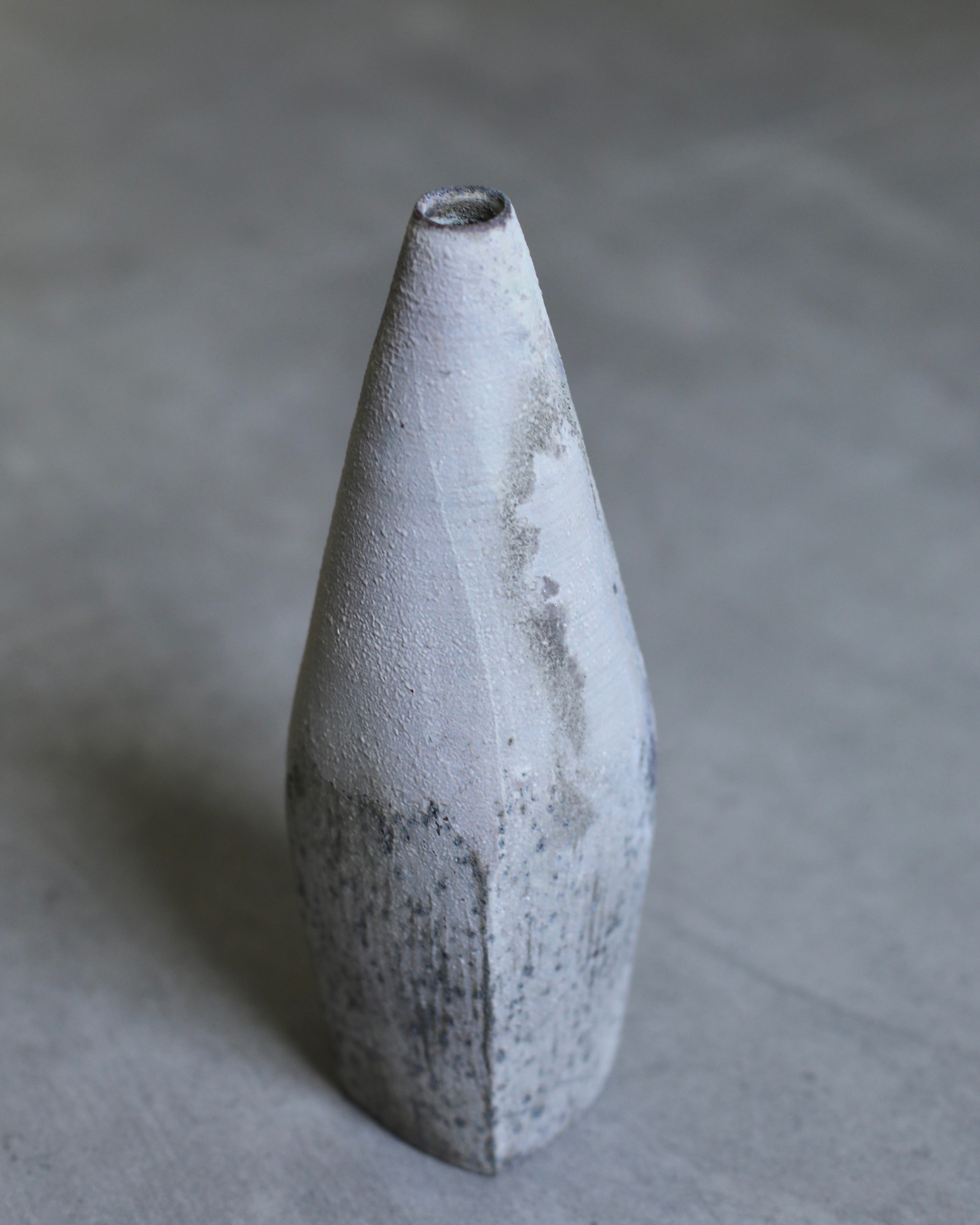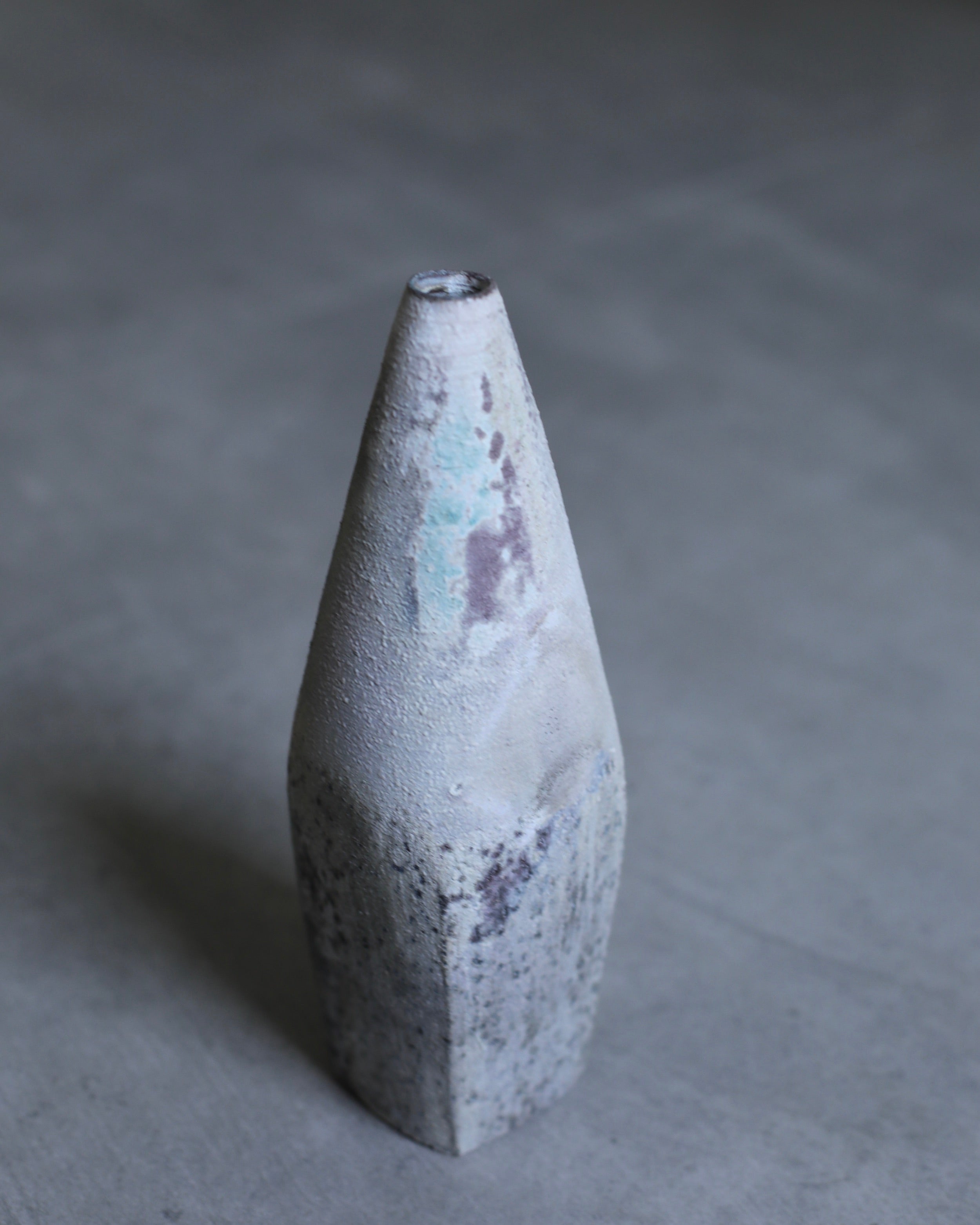 A square-shaped bottle hand-crafted by Etsuji Noguchi. The vase features a unique design, starting with a square-shaped base that gradually transitions into a rounded, slender upper body, culminating in a narrow opening at the top. This vessel is made from naturally sourced materials and has been exquisitely hand-turned before being fired in a textured lichen-like glaze. The bottle’s surface bears a crystalline texture, enriched by a blend of grey, plum, and speckles of verdigris.