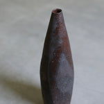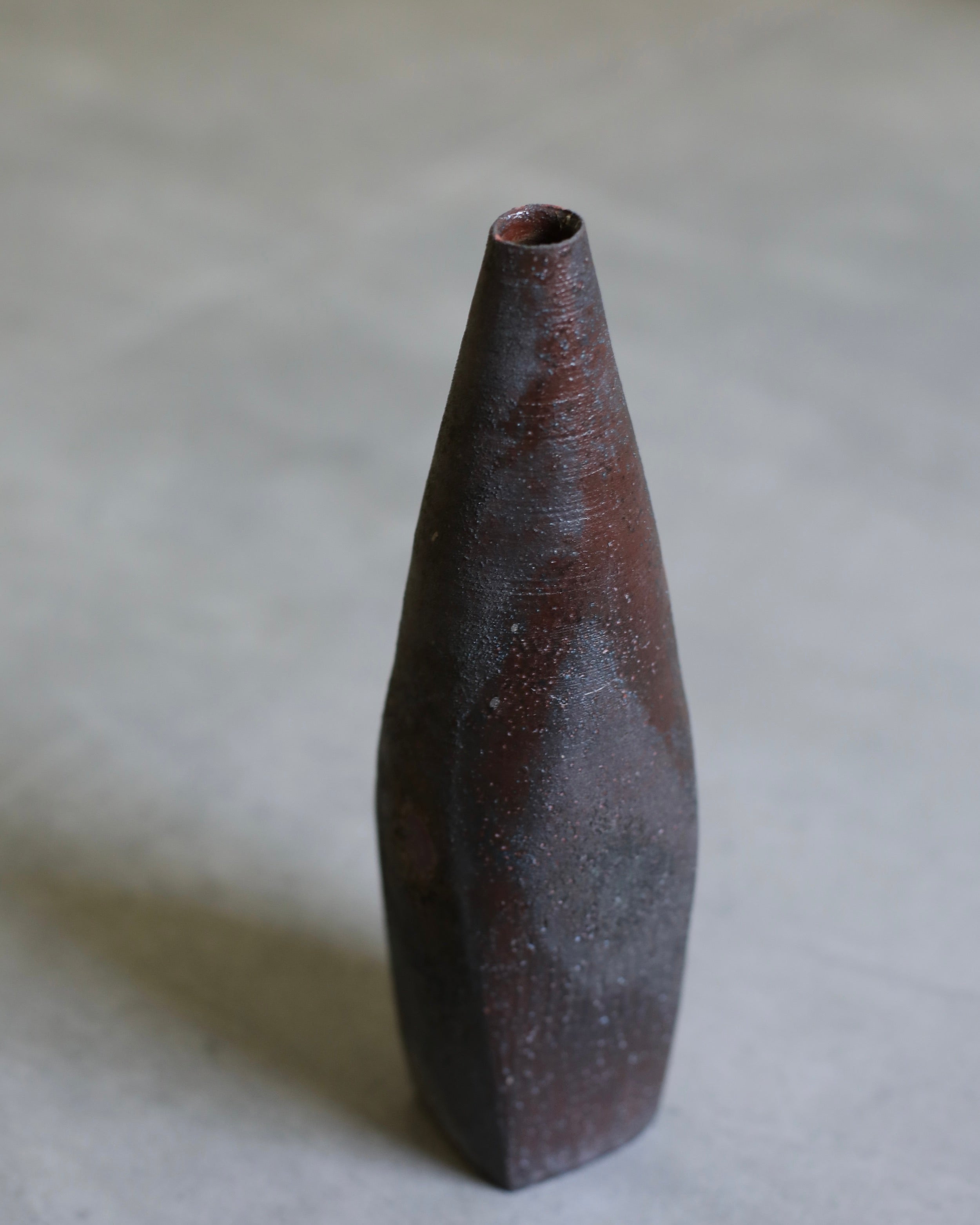 A square-shaped bottle hand-crafted by Etsuji Noguchi. The vase features a unique design, starting with a square-shaped base that gradually transitions into a rounded, slender upper body, culminating in a narrow opening at the top. Made from naturally sourced materials, it has been meticulously hand-turned and fired in a glaze that shifts between lustrous and matte planes. Across the surface, a crystalline texture emerges in plum and burgundy tones, flecked with delicate, pore-like speckles.