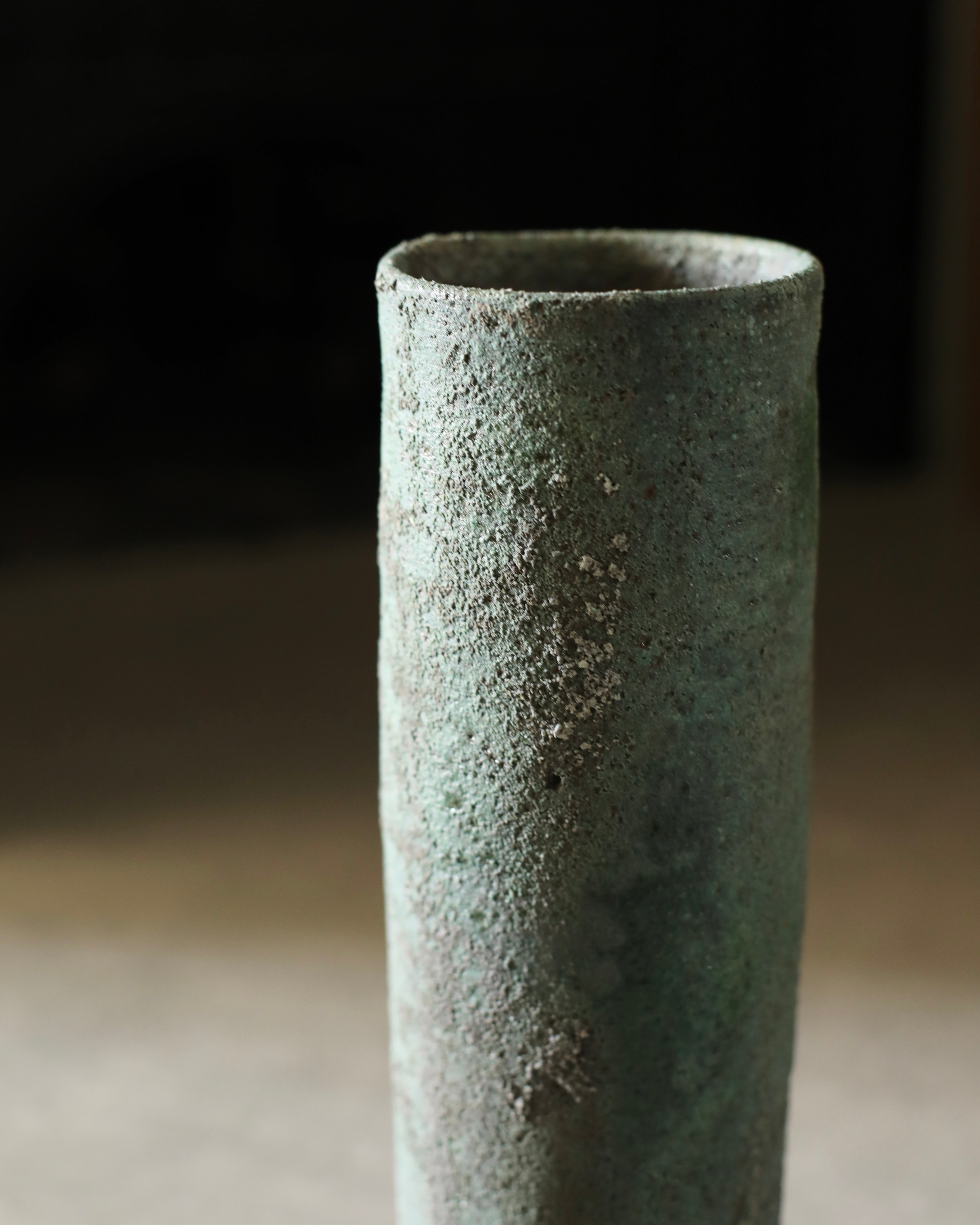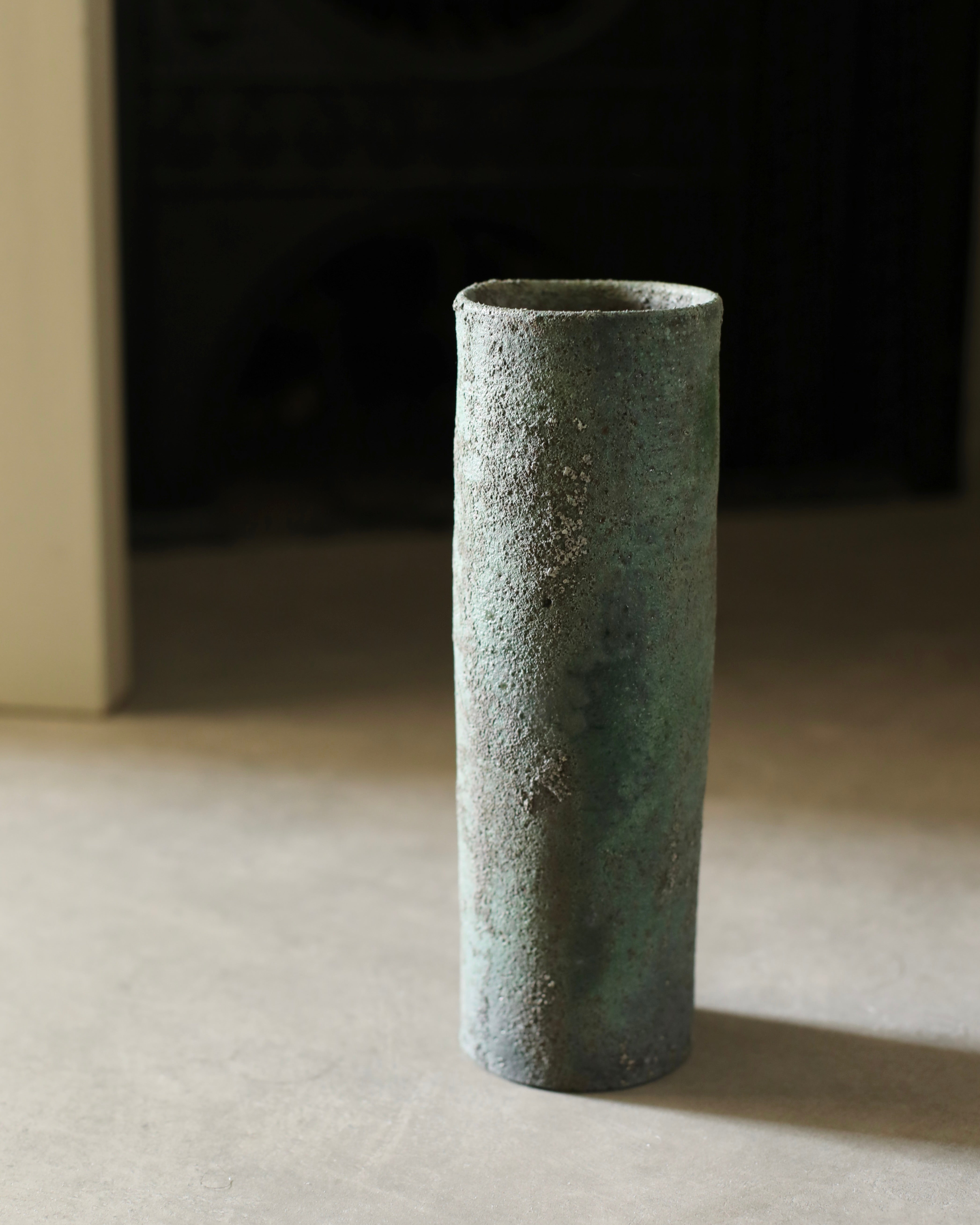 Noguchi's mastery of firewood kilns is particularly evident in his latest series, Verdigris Green. These dynamic, finely made pieces murmur through hues of chromium oxide to rich copper green. This hum of colour is echoed in the tactile moss-like surfaces he achieves by adding an accumulation of ash during the firing processes. The resulting works blur the line between contemporary pottery and historical artefacts, endowing them with an enigmatic beauty that leaves the origins of these pieces unclear, an ideal that Noguchi is seeking within his work.