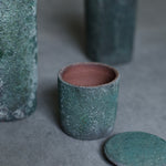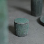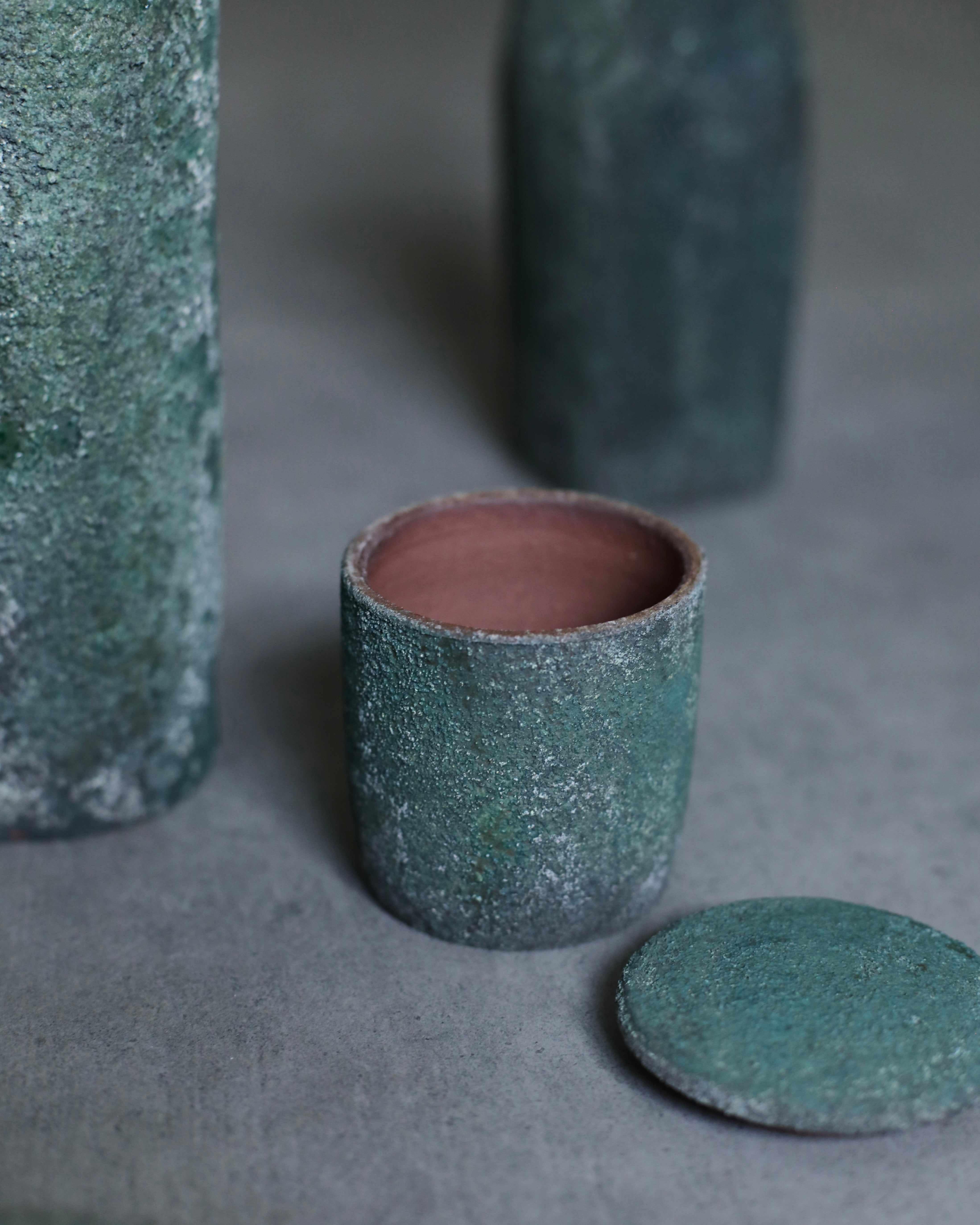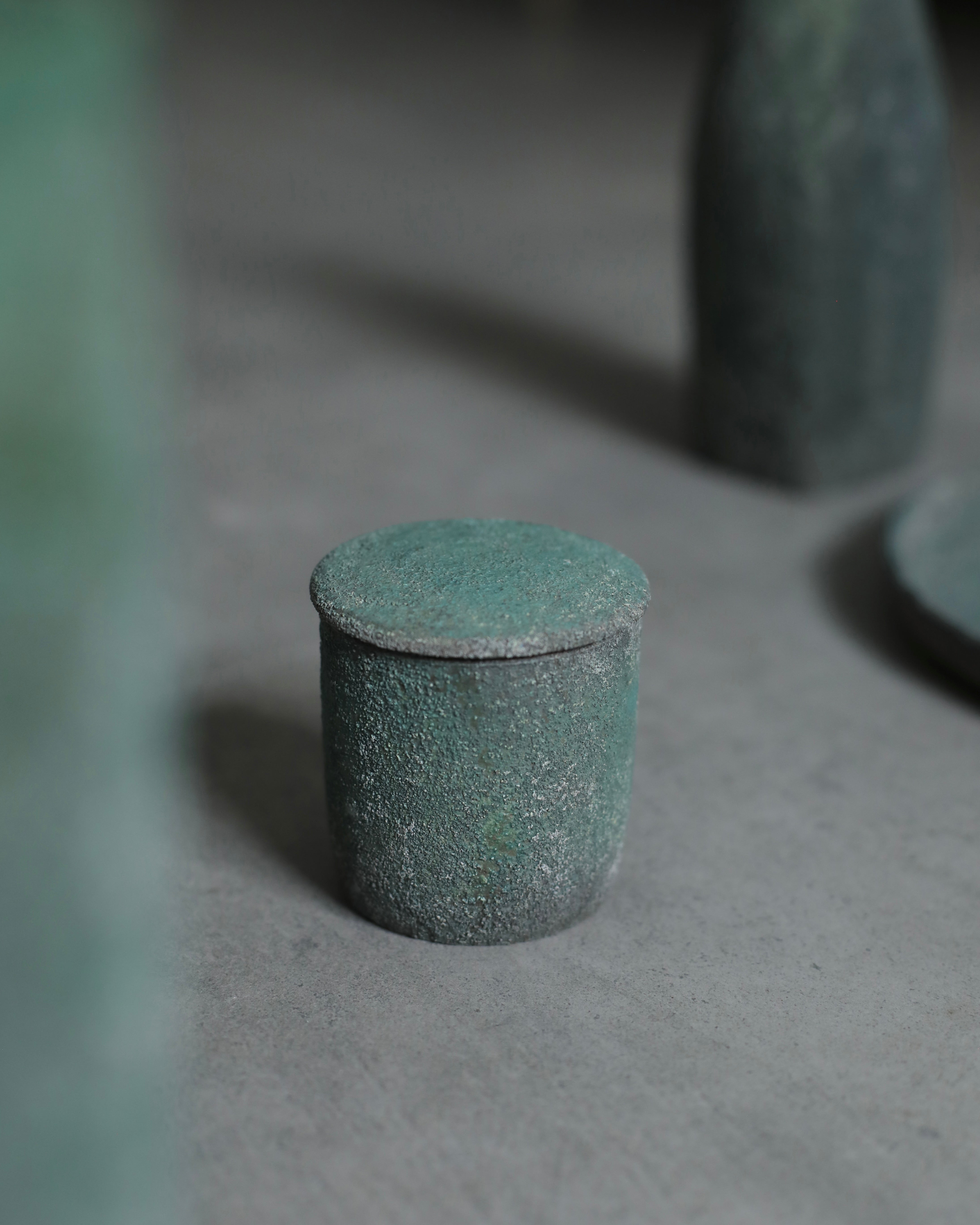 A study in simplicity and proportion, Etsuji’s Tea Container takes the form of a small cylinder, capped with a flat, round lid. Its compact scale evokes a sense of intimacy and ritual, recalling the careful containment of scent, warmth, and time. This vessel is made from naturally sourced materials and has been exquisitely hand-turned before being fired in a textured lichen-like glaze. The bottle’s surface bears a crystalline texture, enriched by a deep chromatic blend of verdigris and moss green.