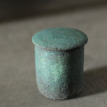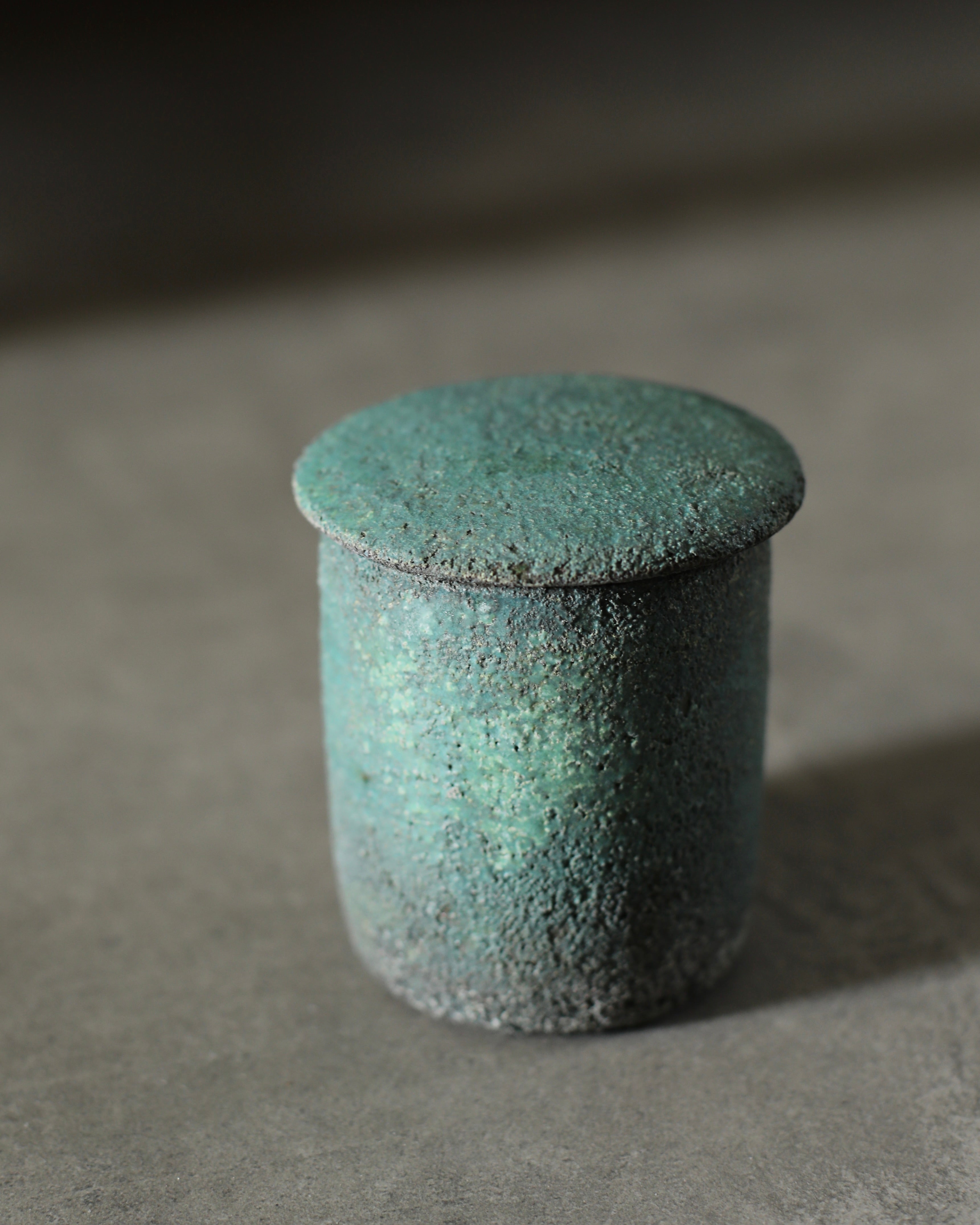 A study in simplicity and proportion, Etsuji’s Tea Container takes the form of a small cylinder, capped with a flat, round lid. Its compact scale evokes a sense of intimacy and ritual, recalling the careful containment of scent, warmth, and time. This vessel is made from naturally sourced materials and has been exquisitely hand-turned before being fired in a textured lichen-like glaze. The bottle’s surface bears a crystalline texture, enriched by a deep chromatic blend of verdigris and moss green.