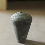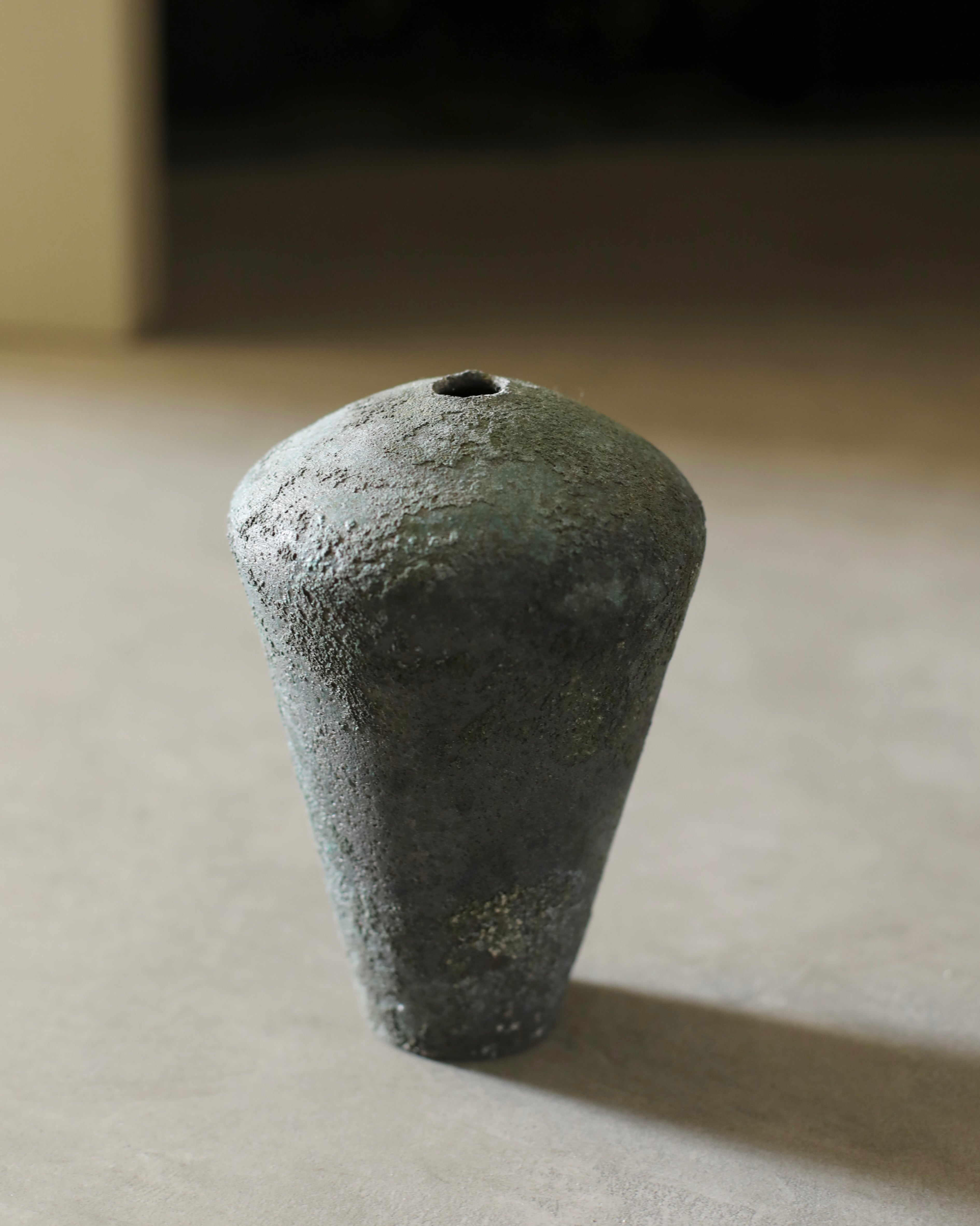 This sculptural vessel rises from a narrow base into a broad, gently rounded top, punctuated only by a small, precise opening at its centre. This vessel is made from naturally sourced materials and has been exquisitely hand-turned before being fired in a textured lichen-like glaze. The bottle’s surface bears a crystalline texture, enriched by a deep chromatic blend of verdigris and moss green.