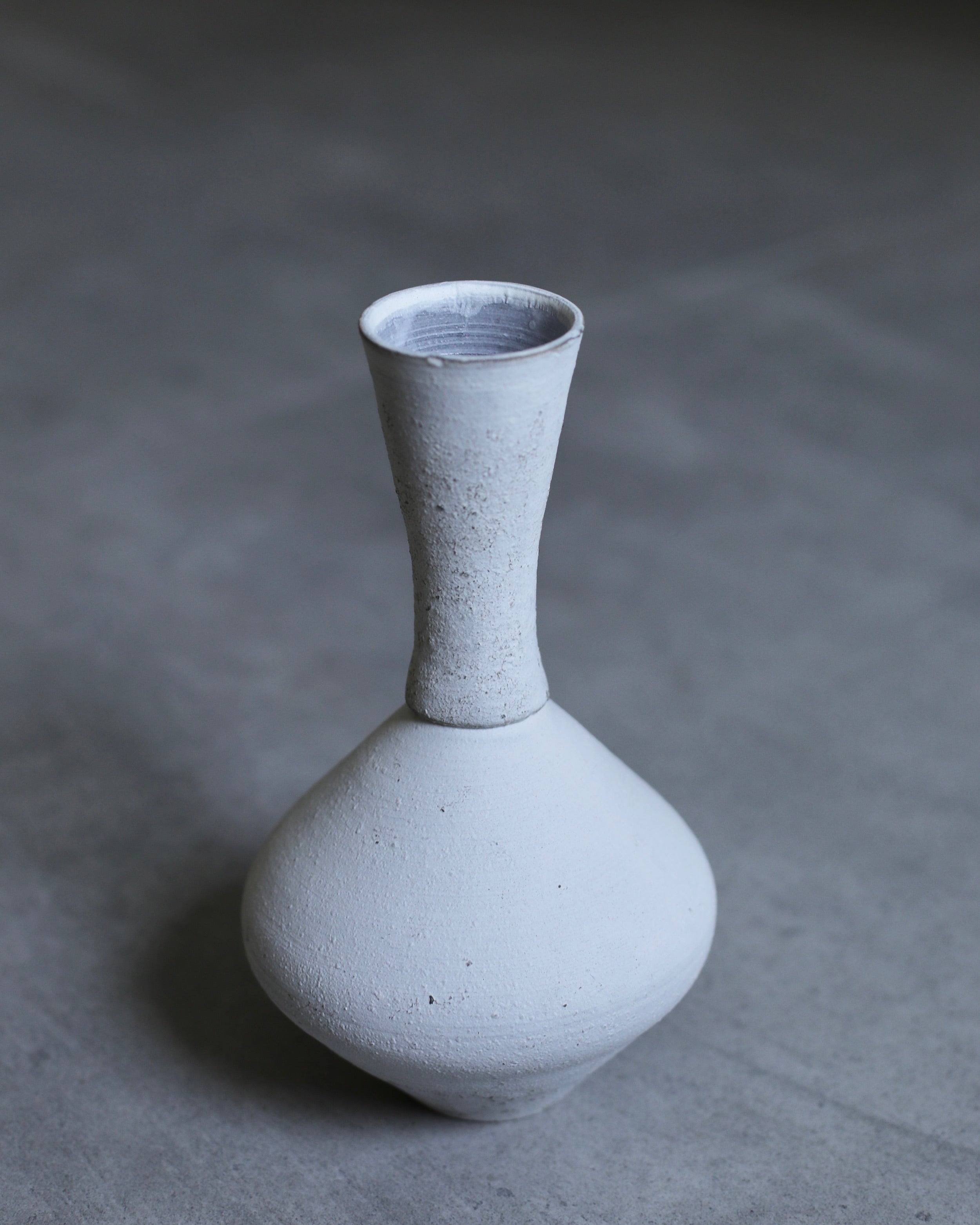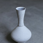 This vessel rises from a narrow base, expanding into a full, rounded body before extending into a tall cylindrical neck that gently flares at the opening. Made from naturally sourced materials, it has been meticulously hand-turned and fired. The surface bears a matte finish, veiled in soft creams and greys that flow across the form.