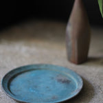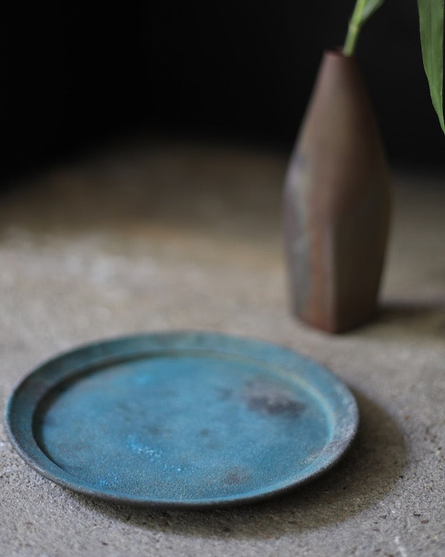 An artisanal small plate hand-crafted by Etsuji Noguchi. This plate is made from naturally sourced materials and has been exquisitely hand-turned before being fired in a textured lichen-like glaze. The plates surface is a rich chroma of dappled blue-green verdigris and moss green with areas of crystallization towards its centre. A small step at the plate’s lip exposes the deep chard-red clay beneath, accentuating its sophisticated forms.