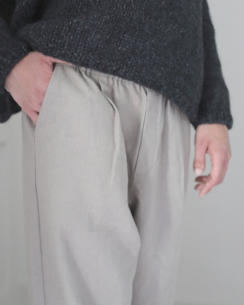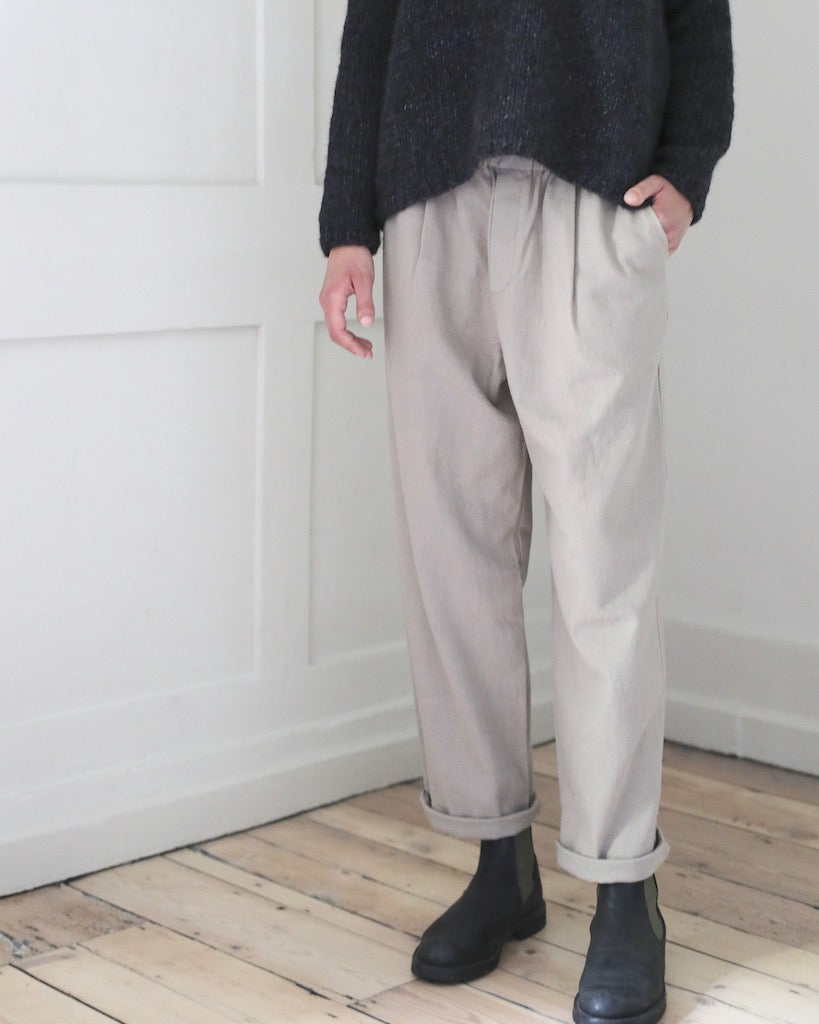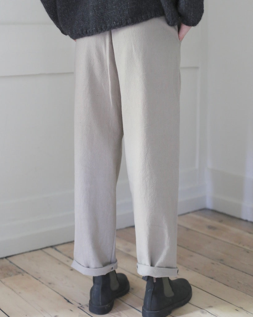 With a loose fit and wide leg, these beautiful trousers blend the durability of cotton together with the softness of silk to combine comfort and practicality. The fabric is both thick and firm, whilst still effortlessly falling against the leg. The elegant simplicity of the design ensures that these trousers are a versatile addition to your wardrobe.
