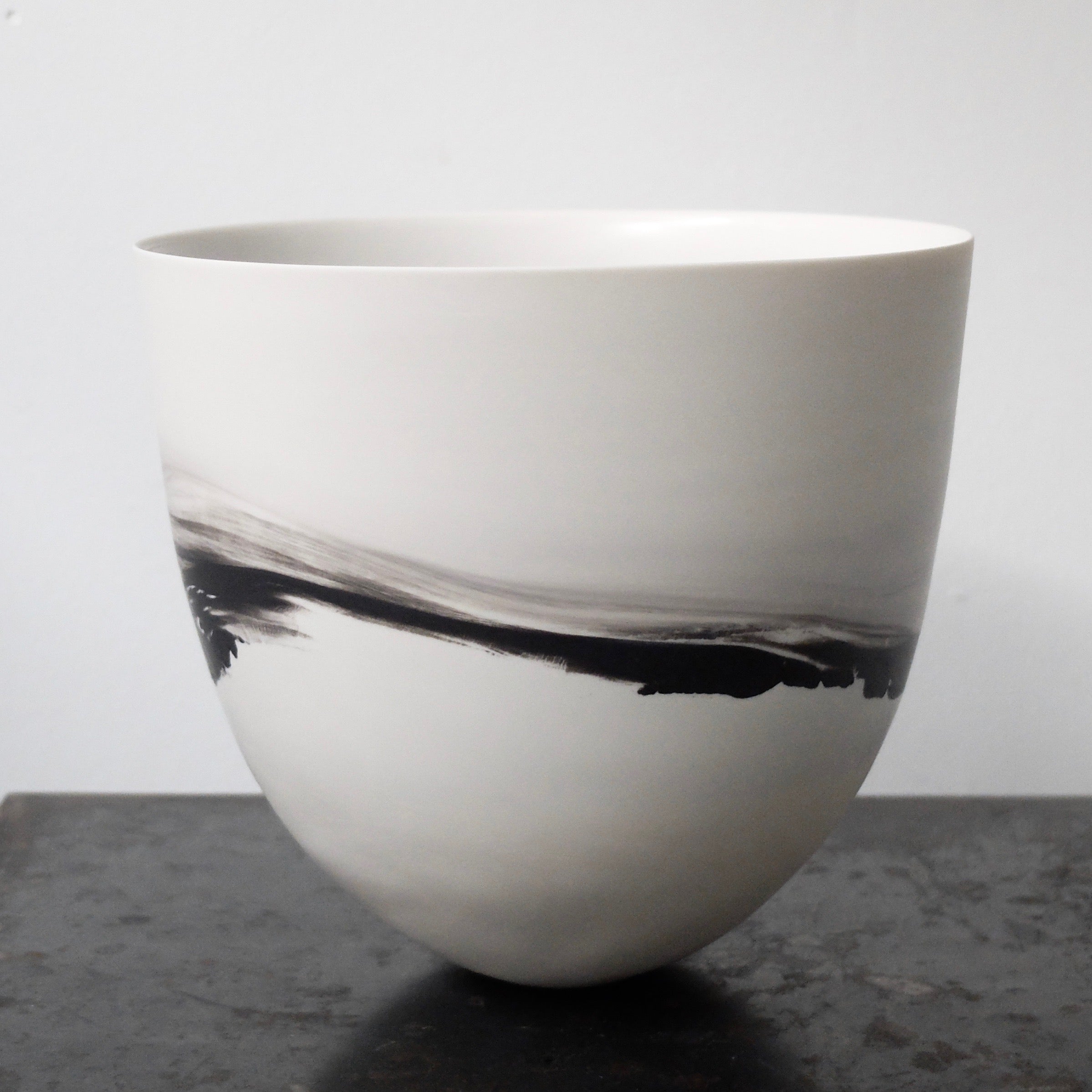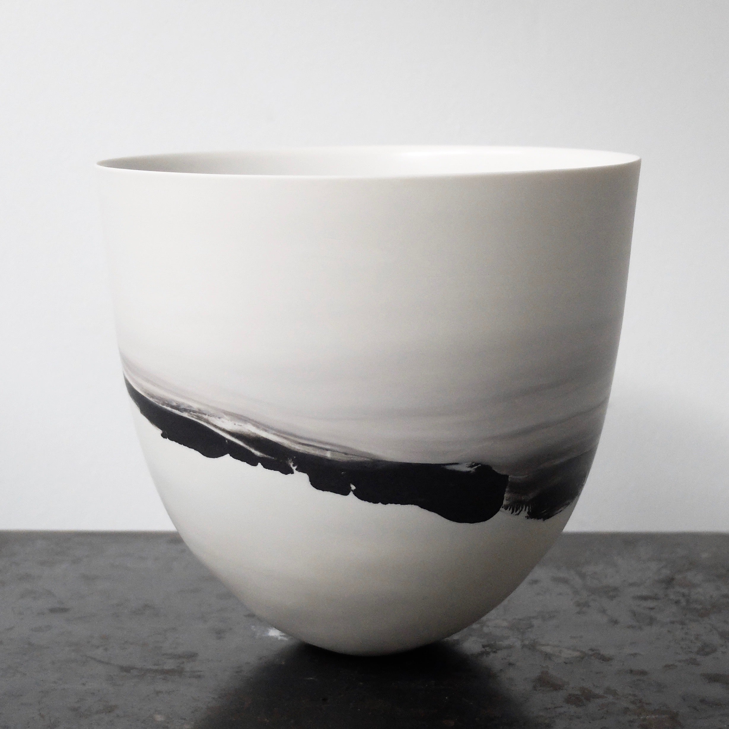 This vessel has a black ‘seascape’ detail in the centre towards the base, with subtle shades blending together on the surface. Dowson’s mark making is influenced by movement in nature and captures continuously evolving landscapes.