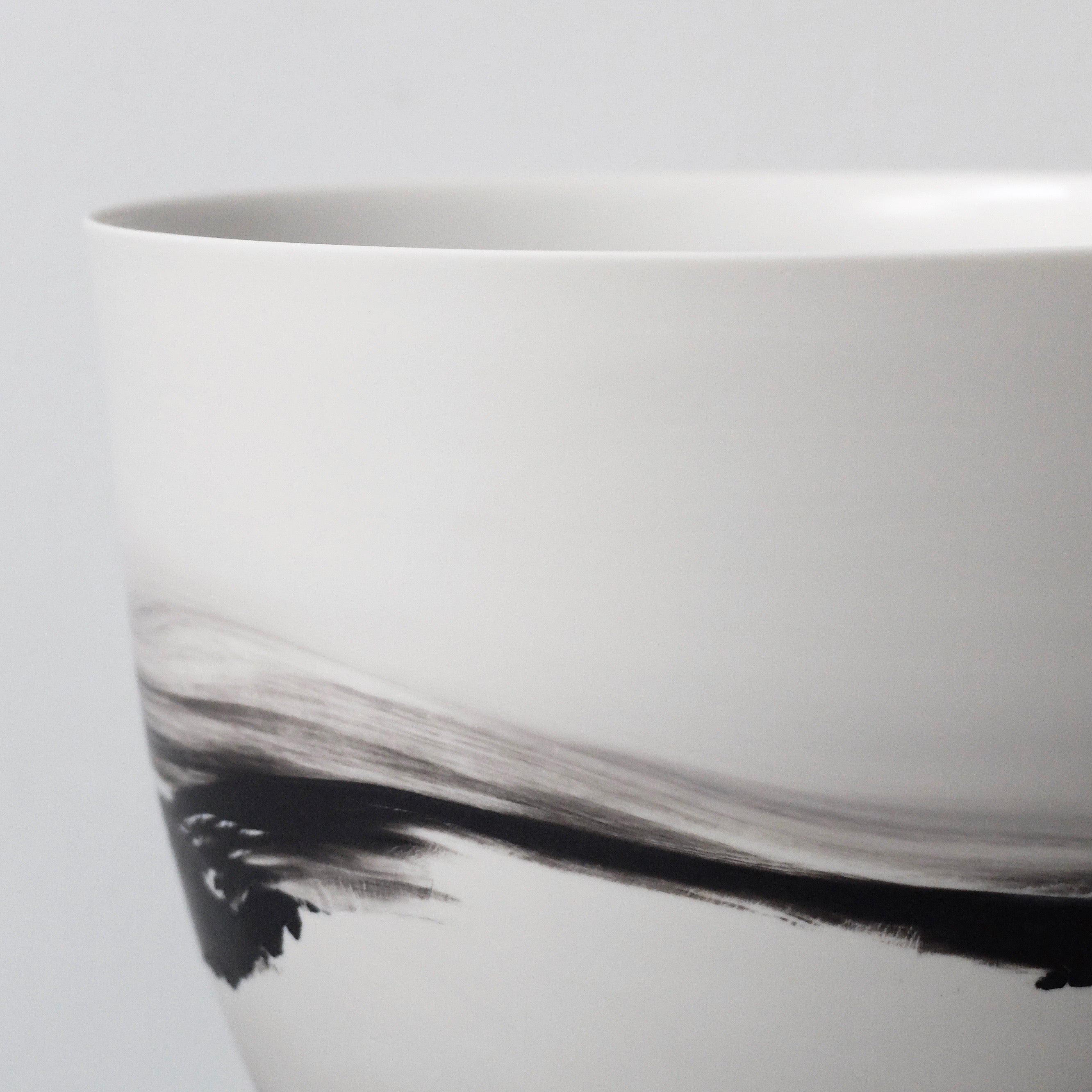 An extra large vessel, hand crafted by artist Celia Dowson. Using black and white porcelain, Dowson fires then sands each vessel to reveal layers of marks and tones. She adds a satin white glaze inside before an additional firing process. The cups are then polished by hand, achieving a soft, silken finish.