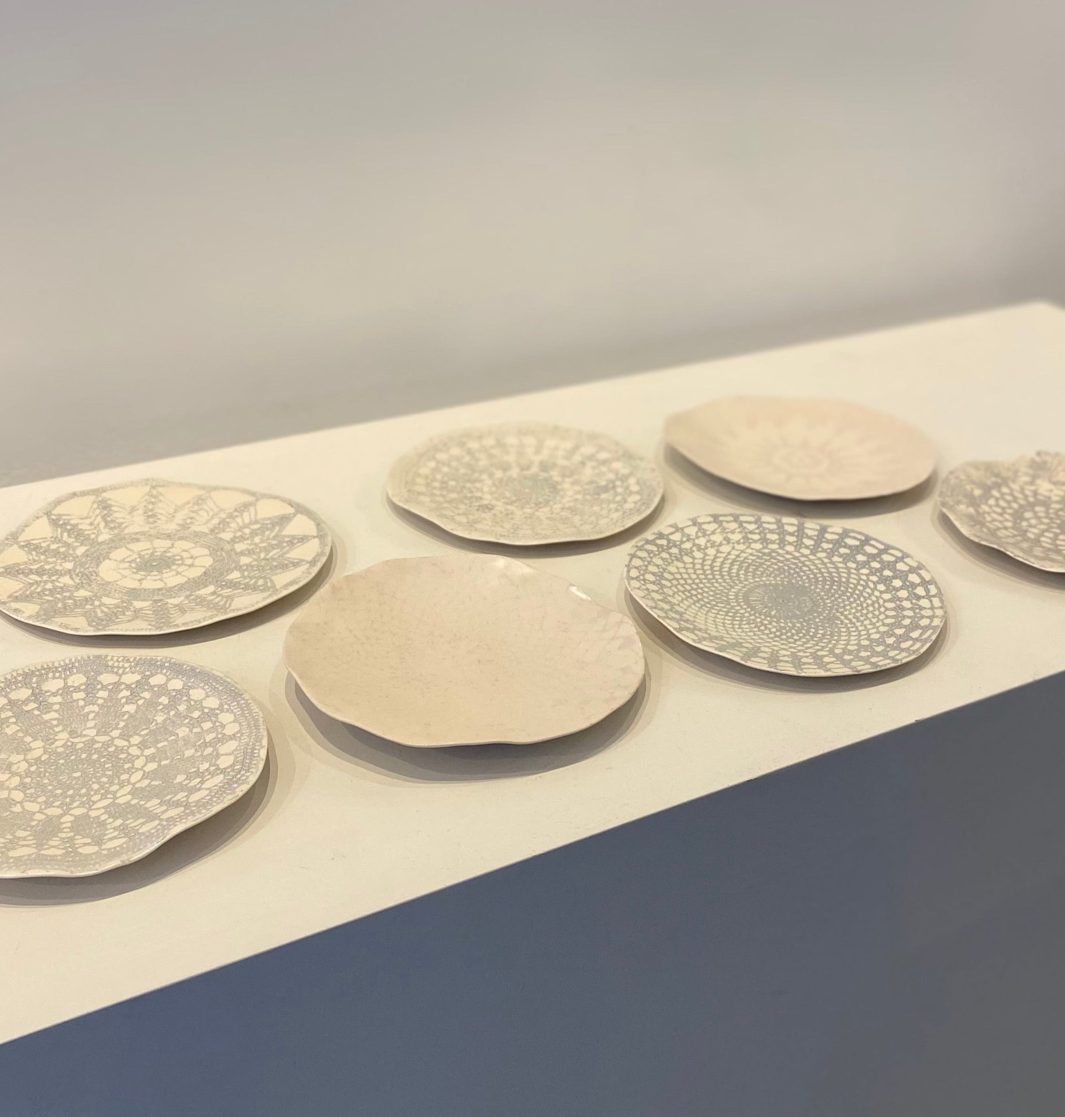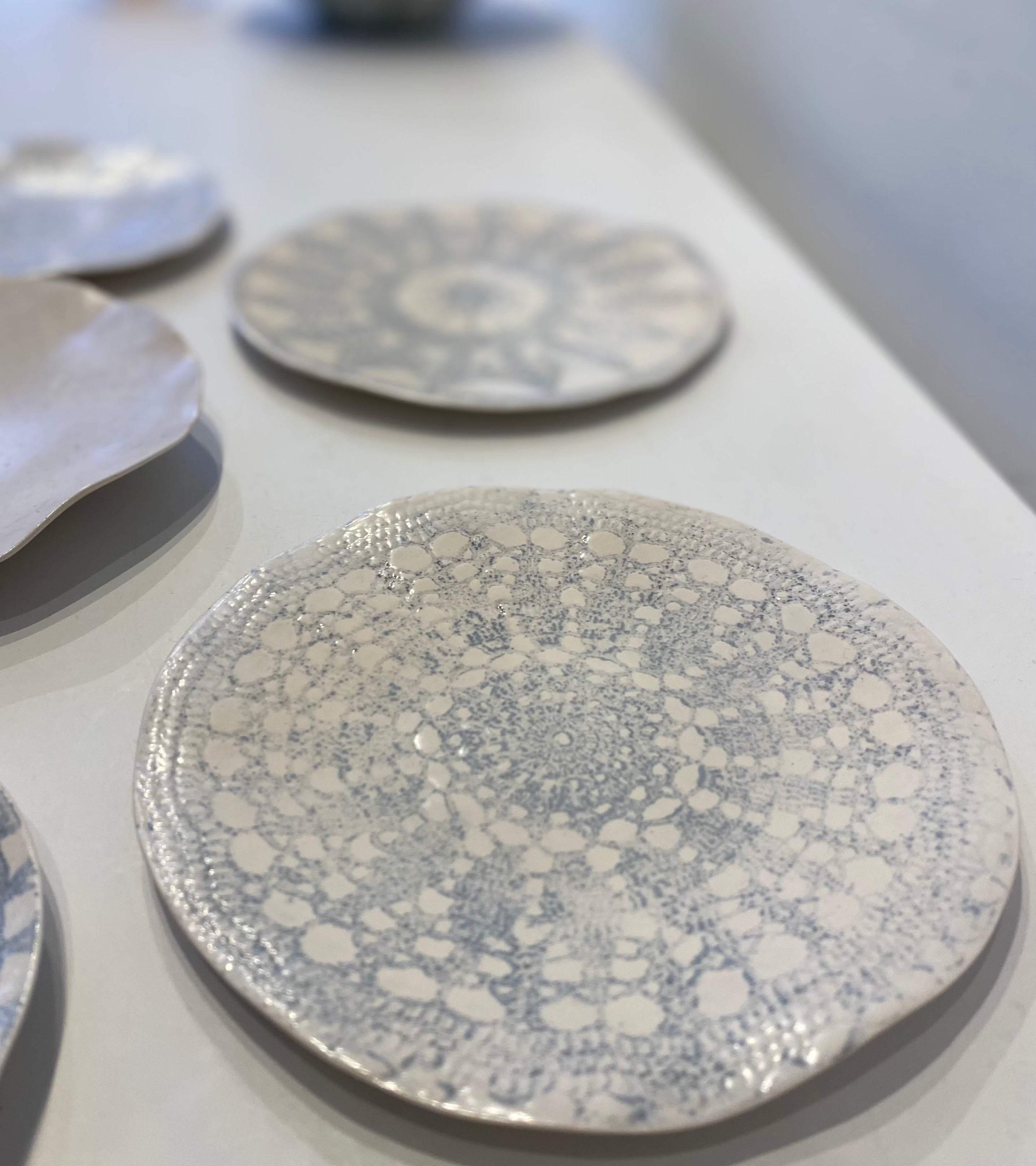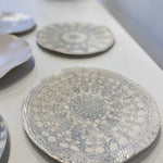 A selection of fine, hand-rolled domestic ware plates. Made from white earthenware clay, a soft palette, opaque vellum or transparent glaze over coloured slips and underglazes. Each piece is unique, whether in form or detail. The plates would make any tea party a delight or as wall display.