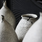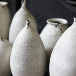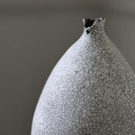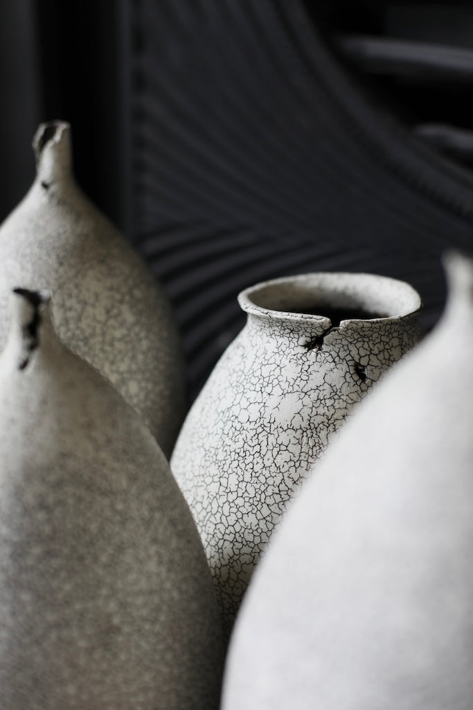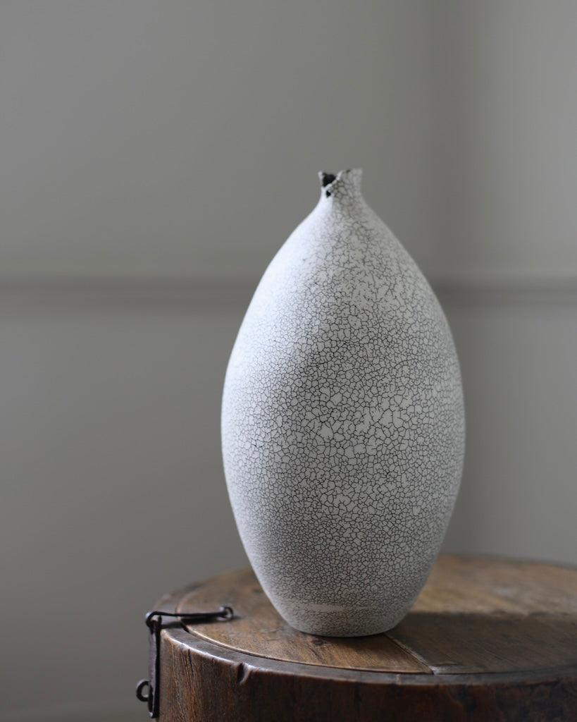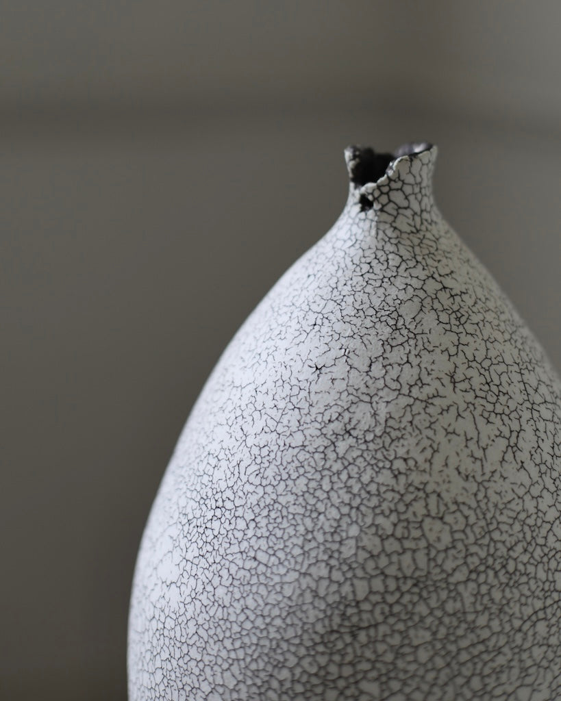 This elegant vase utilises the artist’s signature crackled technique, achieved by layering two types of clay. When asked to describe his muse, the artist stated that it is ‘definitely nature’. This is reflected in the black veinlike markings evoke a cracked eggshell, or rivulets of water.