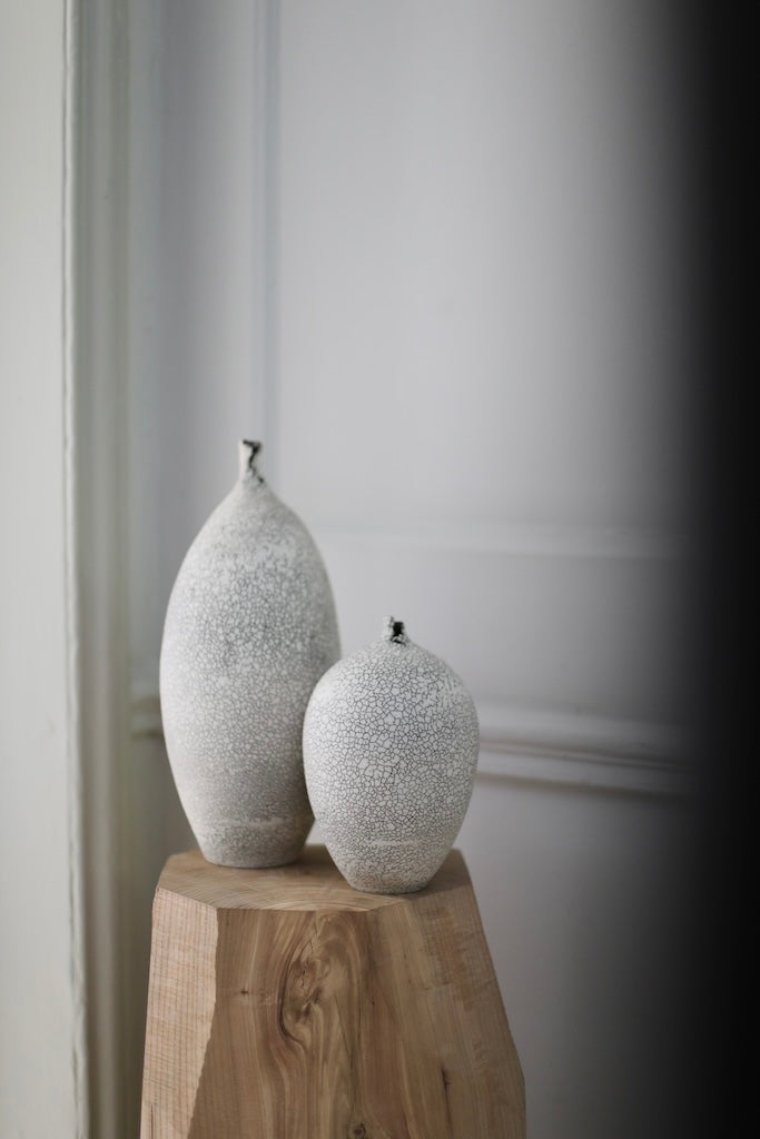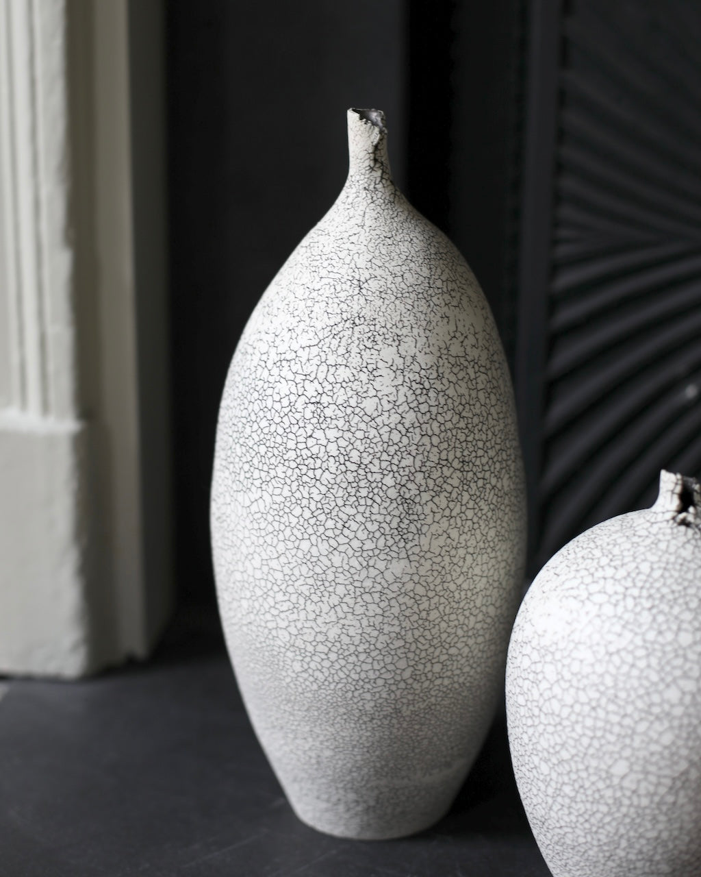This elegant vase utilises the artist’s signature crackled technique, achieved by layering two types of clay. When asked to describe his muse, the artist stated that it is ‘definitely nature’. This is reflected in the black veinlike markings evoke a cracked eggshell, or rivulets of water.