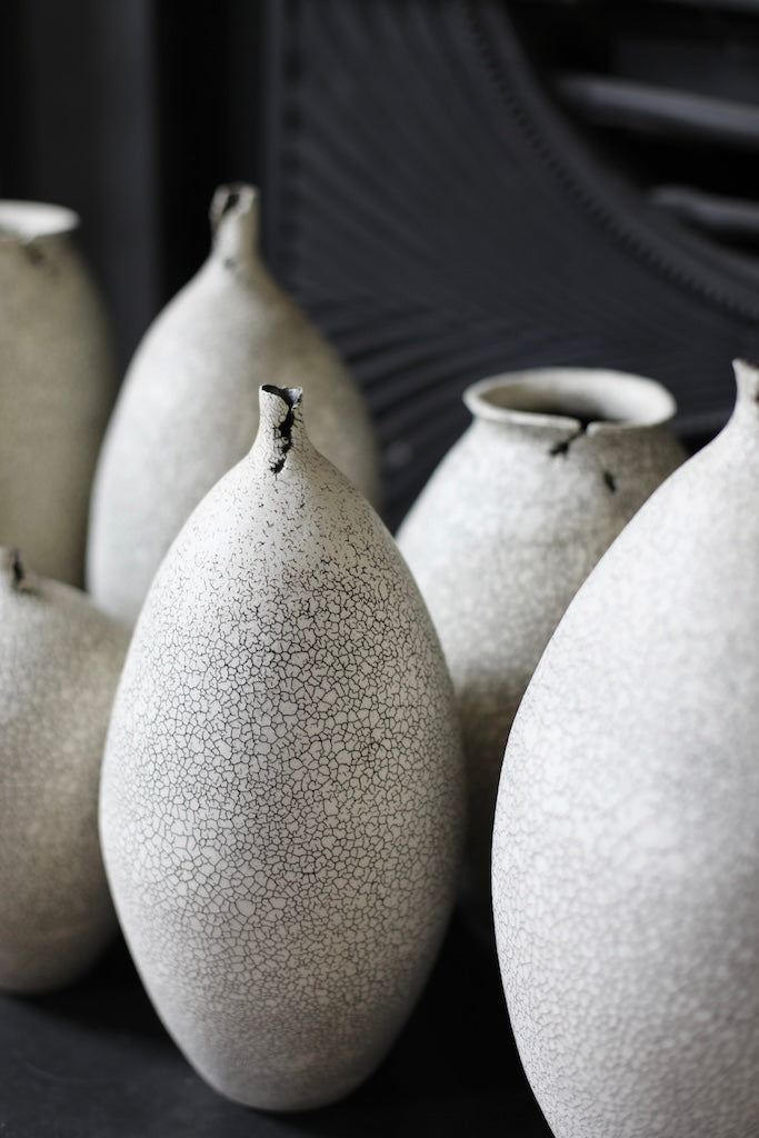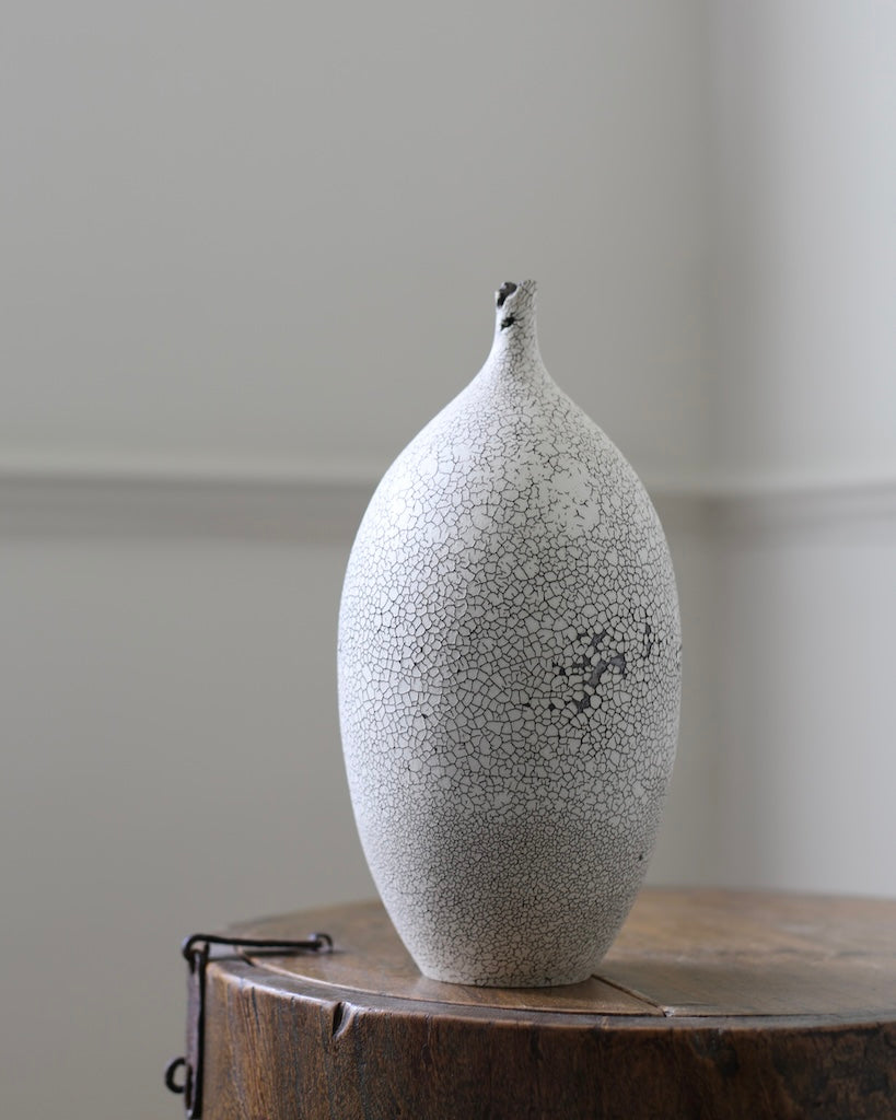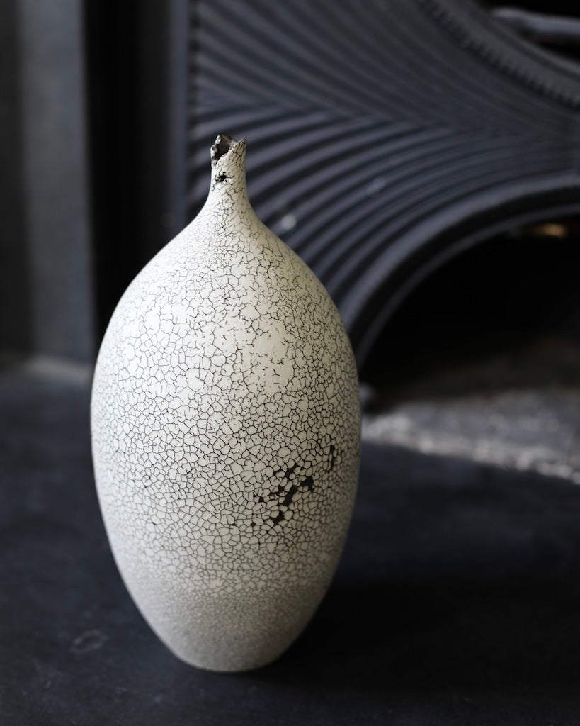 This elegant vase utilises the artist’s signature crackled technique, achieved by layering two types of clay. When asked to describe his muse, the artist stated that it is ‘definitely nature’. This is reflected in the black veinlike markings evoke a cracked eggshell, or rivulets of water.