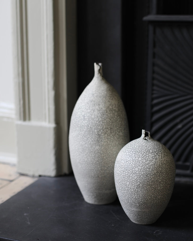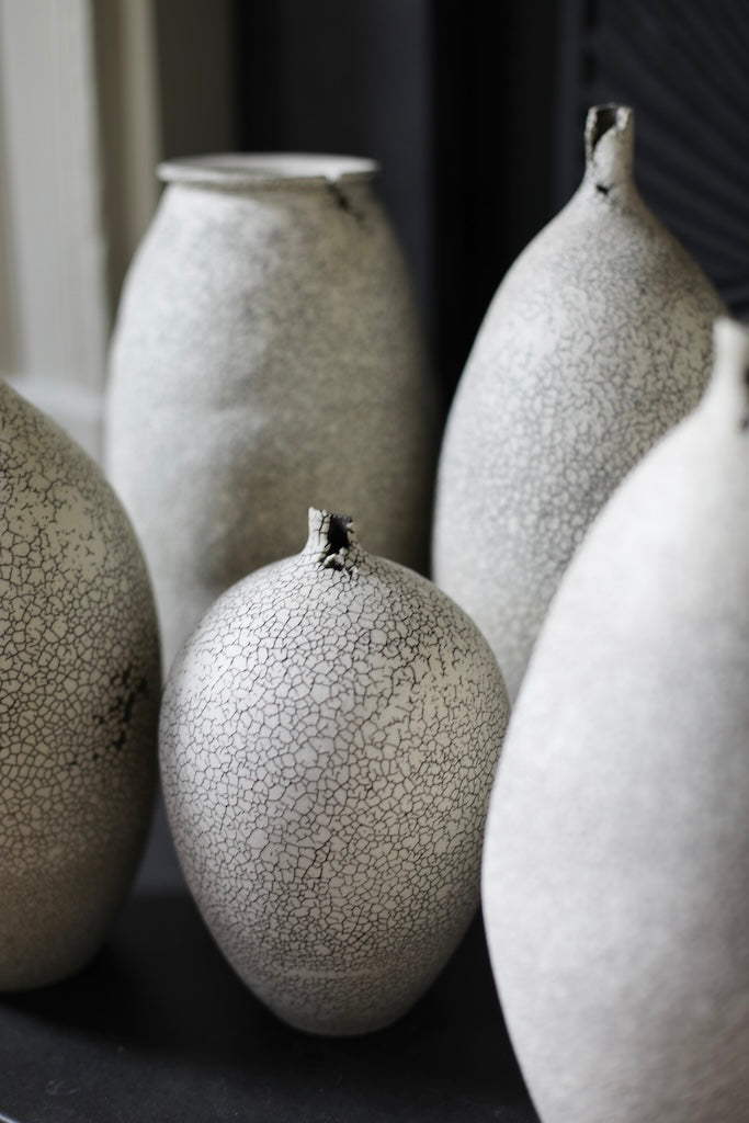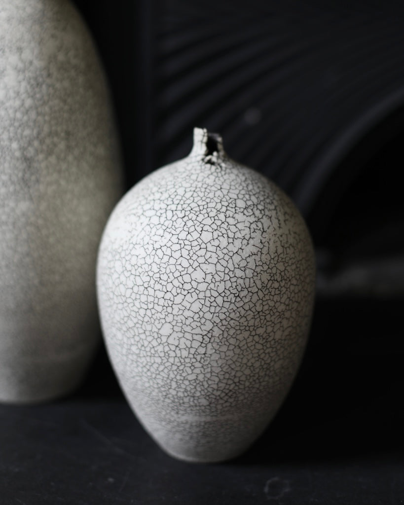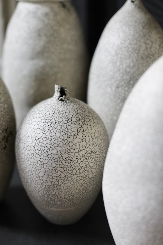 This elegant vase utilises the artist’s signature crackled technique, achieved by layering two types of clay. When asked to describe his muse, the artist stated that it is ‘definitely nature’. This is reflected in the black veinlike markings evoke a cracked eggshell, or rivulets of water.