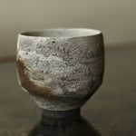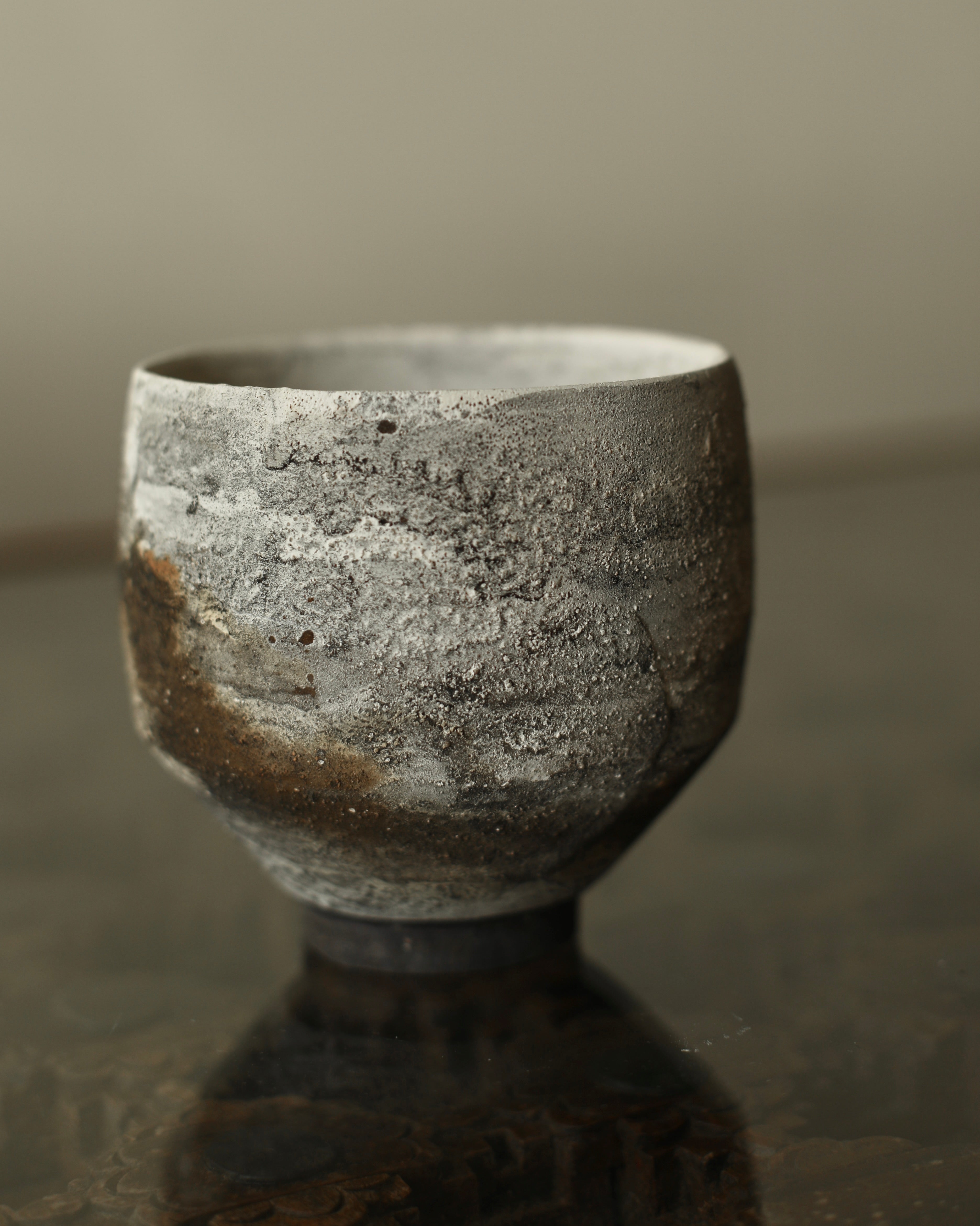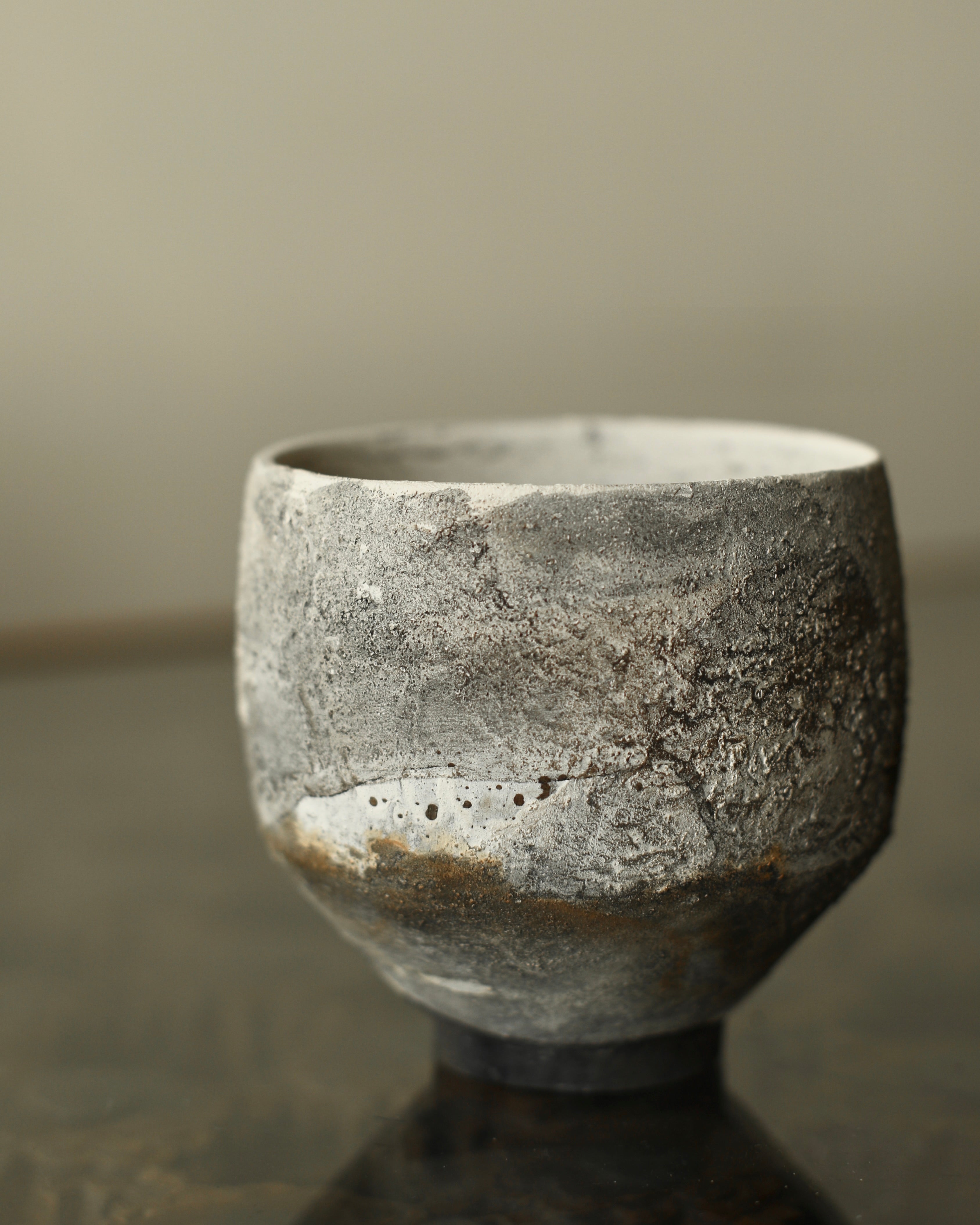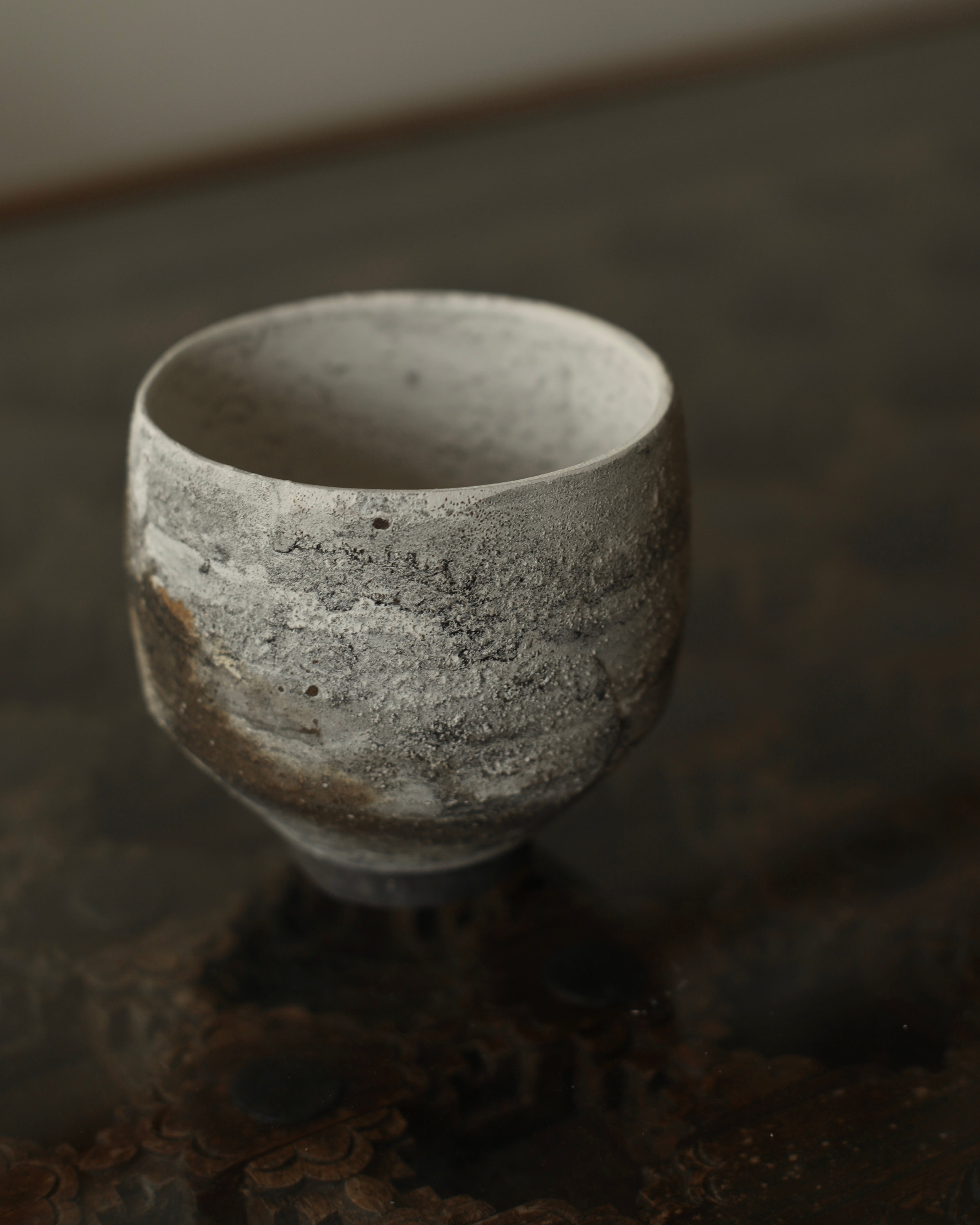 Hollowed from sustainably sourced maple, this cup rests on a base, expanding outward into a rounded form. Finished with oak gall and walnut botanical dyes alongside local earth pigments, the surface carries a range of soft creams, browns, and umbers applied in light washes. These tones settle into the wood’s grain and crevices, creating a dry textured surface with a subtle granular feel. The interior is finished in a chalk white pigment, offering a contrast to the exterior.