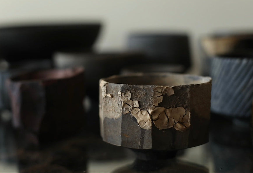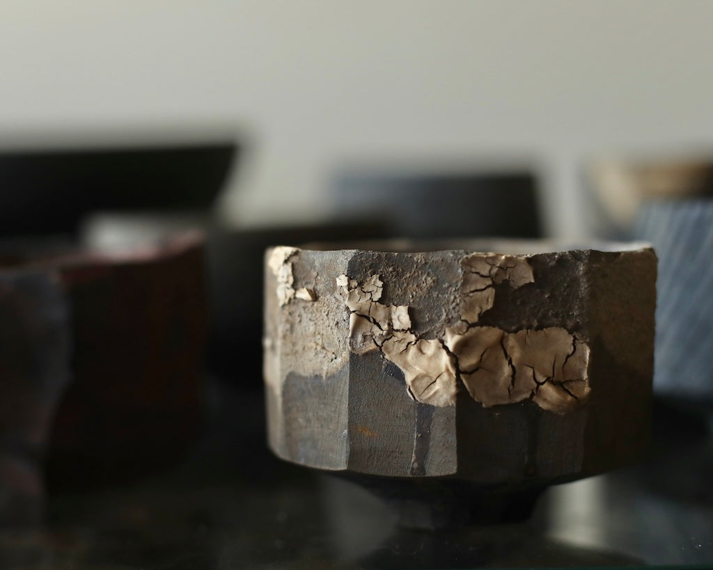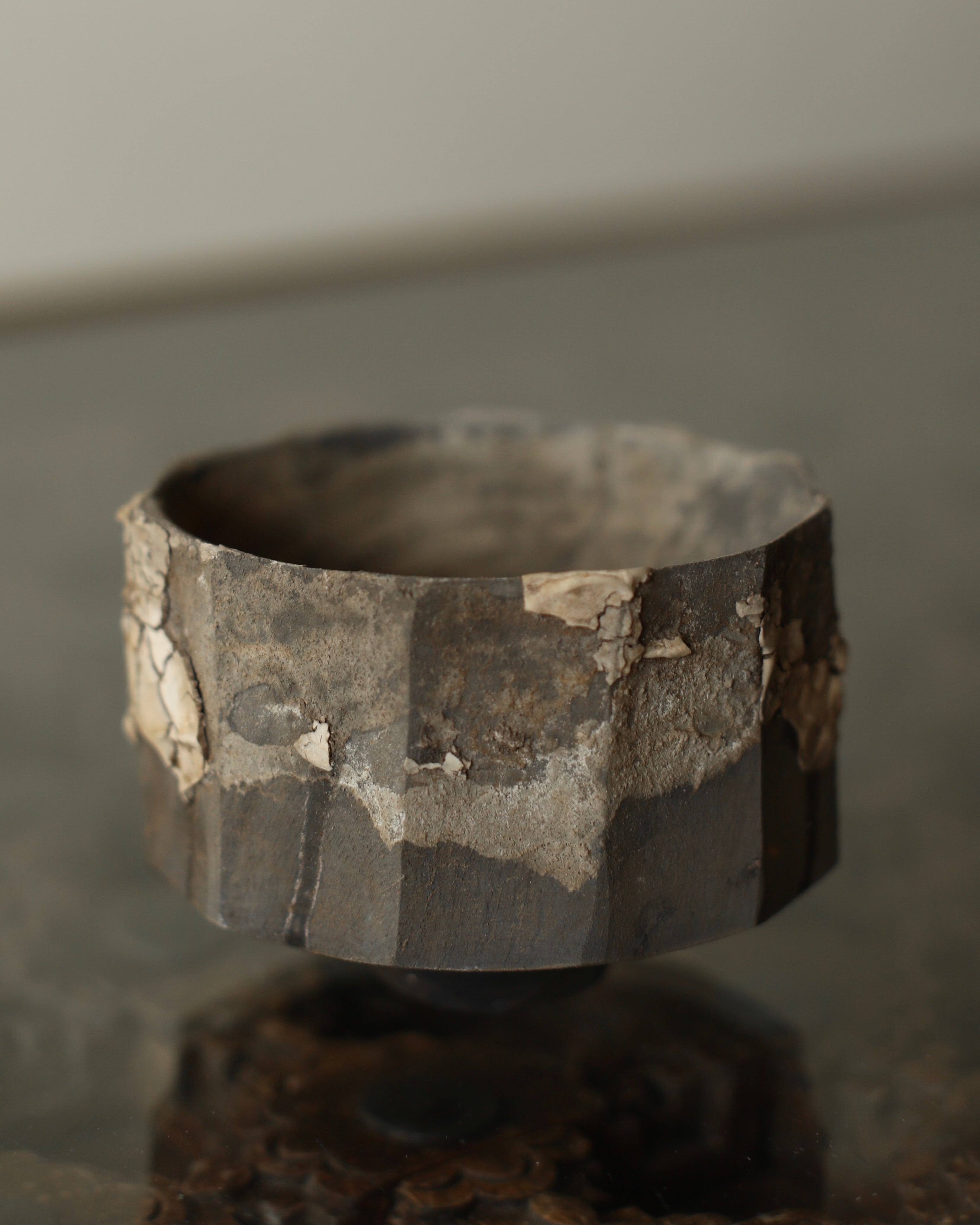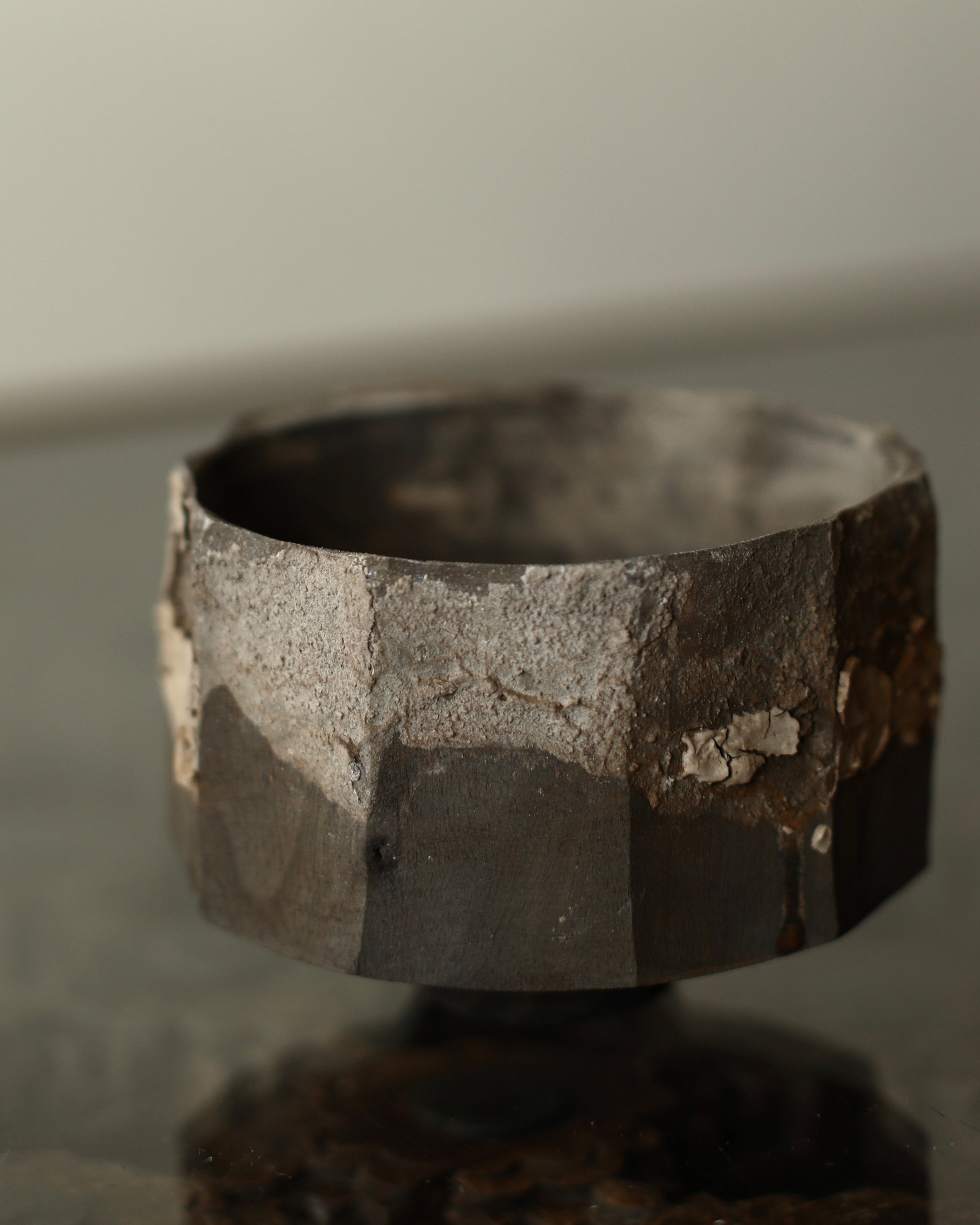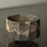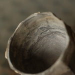 This wide cup is made from sustainably sourced maple, with hand-carved facets and a small base. The surface combines tea and iron dyes with a contrasting cream-coloured crackle effect applied in areas, creating subtle variation. A dry finish extends across the exterior and interior, giving the cup a tactile, understated quality.