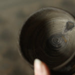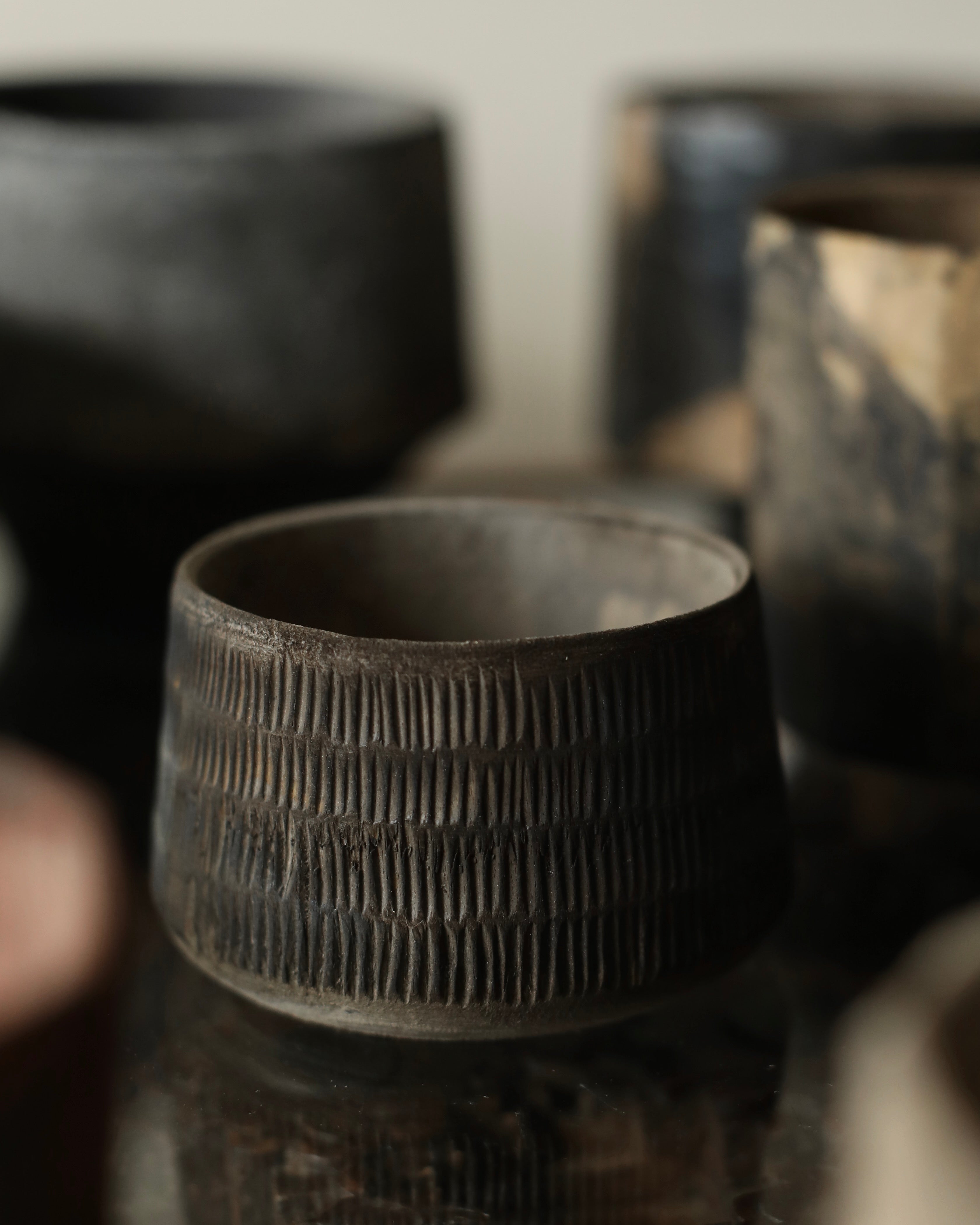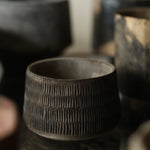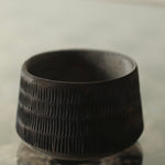 Hollowed from sustainably sourced ash, this short cup features hand-carved vertical etching lines arranged in four subtle bands around the form. Natural cutting marks create a swirling wood pattern at the centre and base of the cup. A dark, dry wash of locally foraged oak gall and rust settles into the surface, enhancing the grain and carved texture.