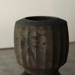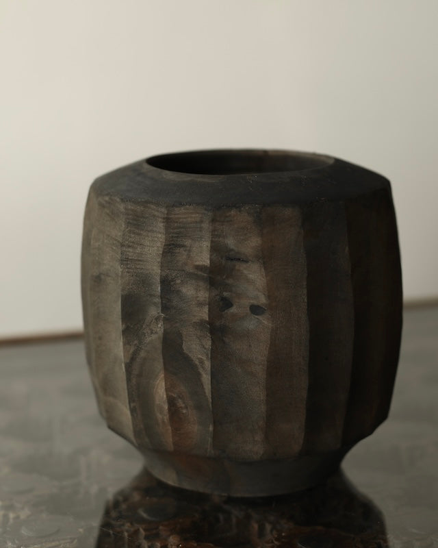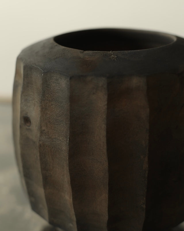 This vessel is made from sustainably sourced silver birch, resting securely on its base. Vertical hand-carved facets run along the body, leading to a softly rounded top with a hollowed opening. Locally foraged botanical dyes give the surface a dark surfaces that moves softly through brown, red and soft silver like grey tones, while details of knots and natural wood markings remain visible.