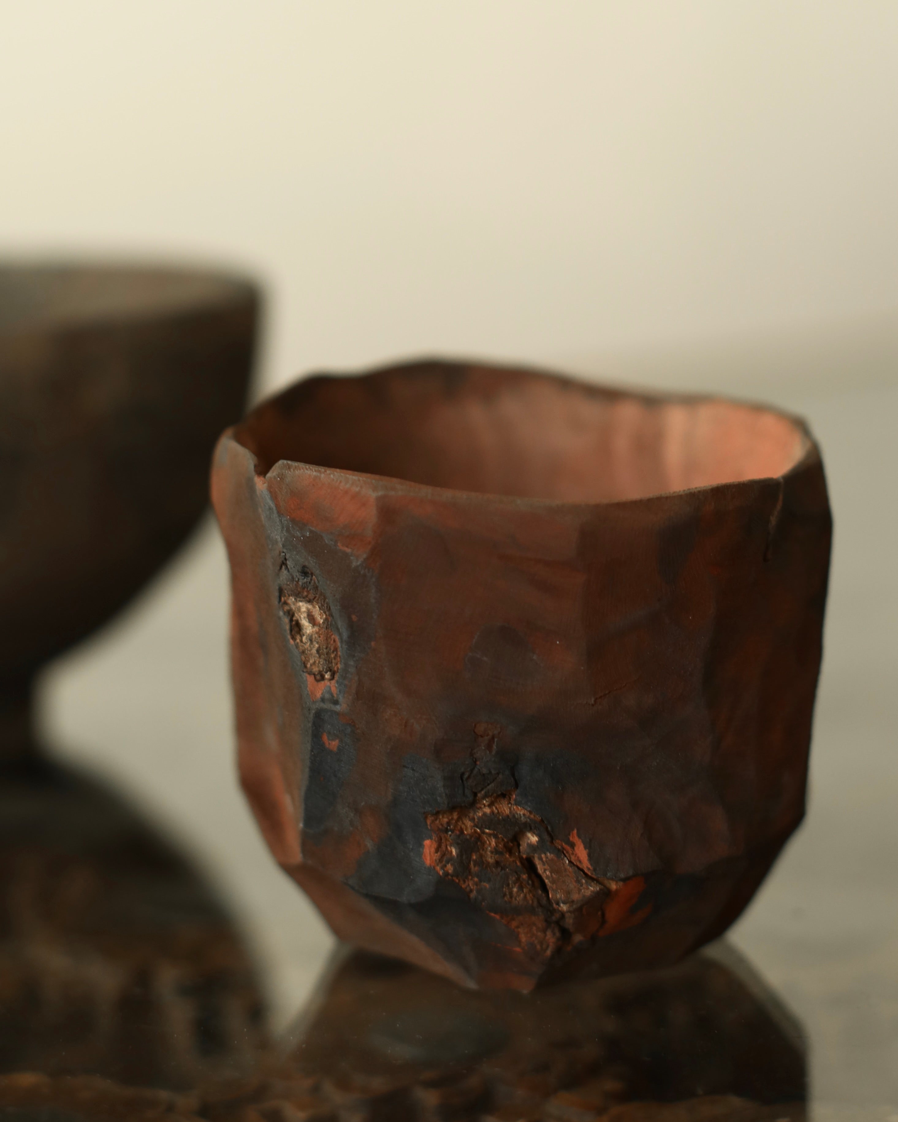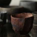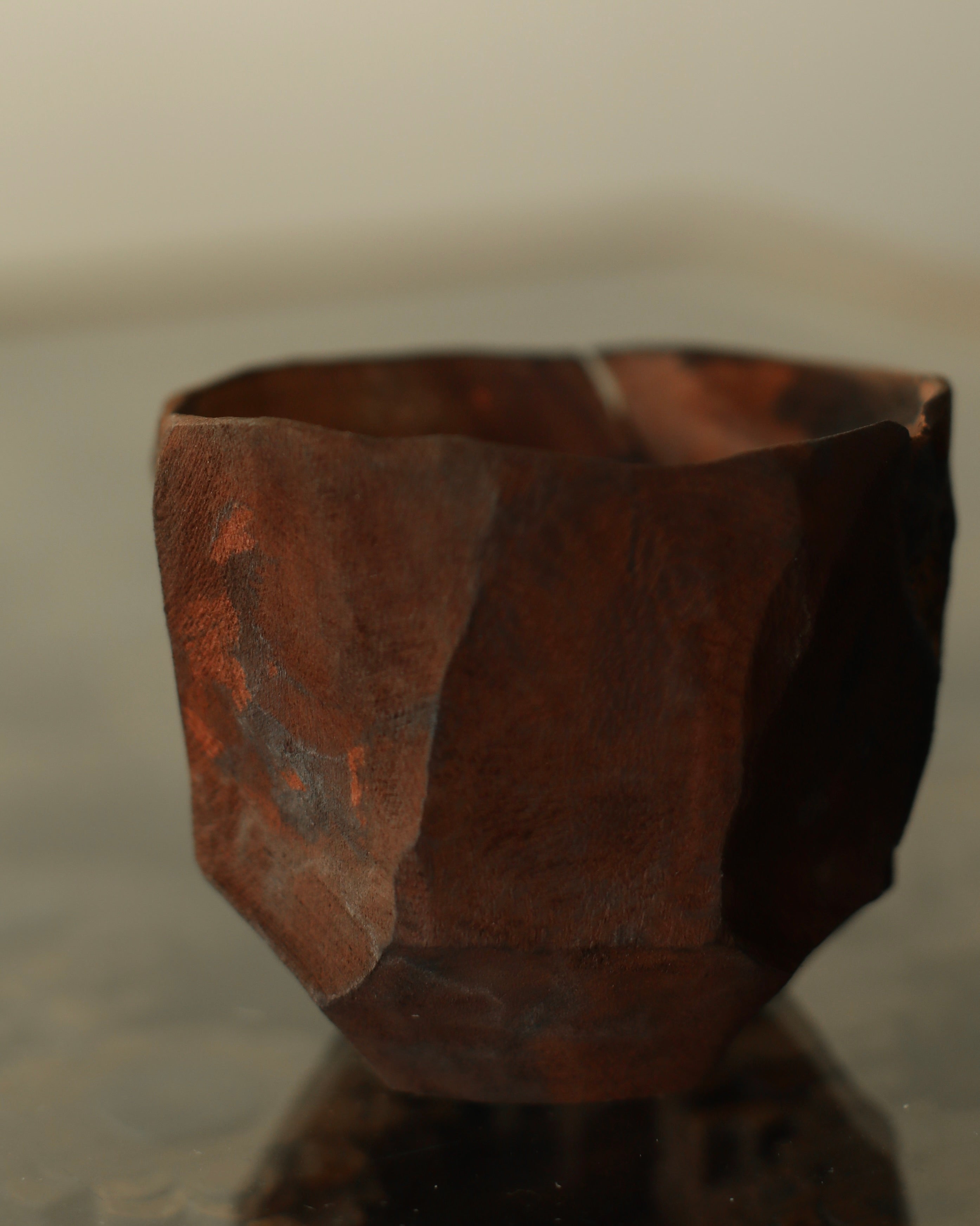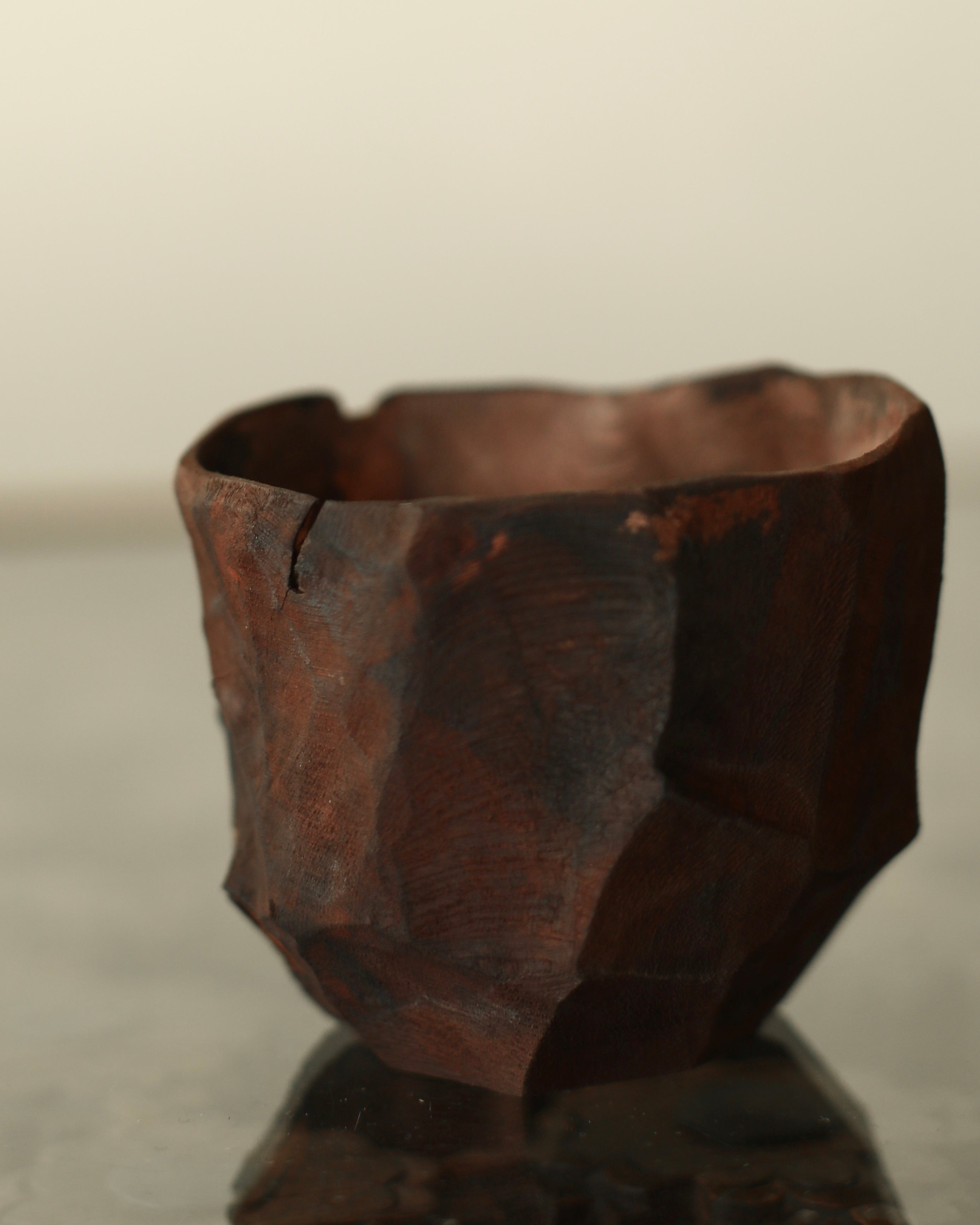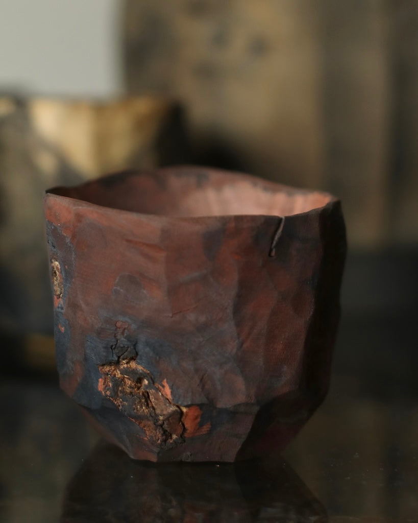 An organic cup form carved from sustainably sourced maple, with natural cracks and knots revealing the character of the wood. A dry finish of layered iron oxide and earth pigments gives an irregular dark undertone, accented with a deep red-pink. The organic silhouette, and soft, deep tone draw attention to subtle cracks, gaps and knots, fully embracing the thoughtfully selected material.