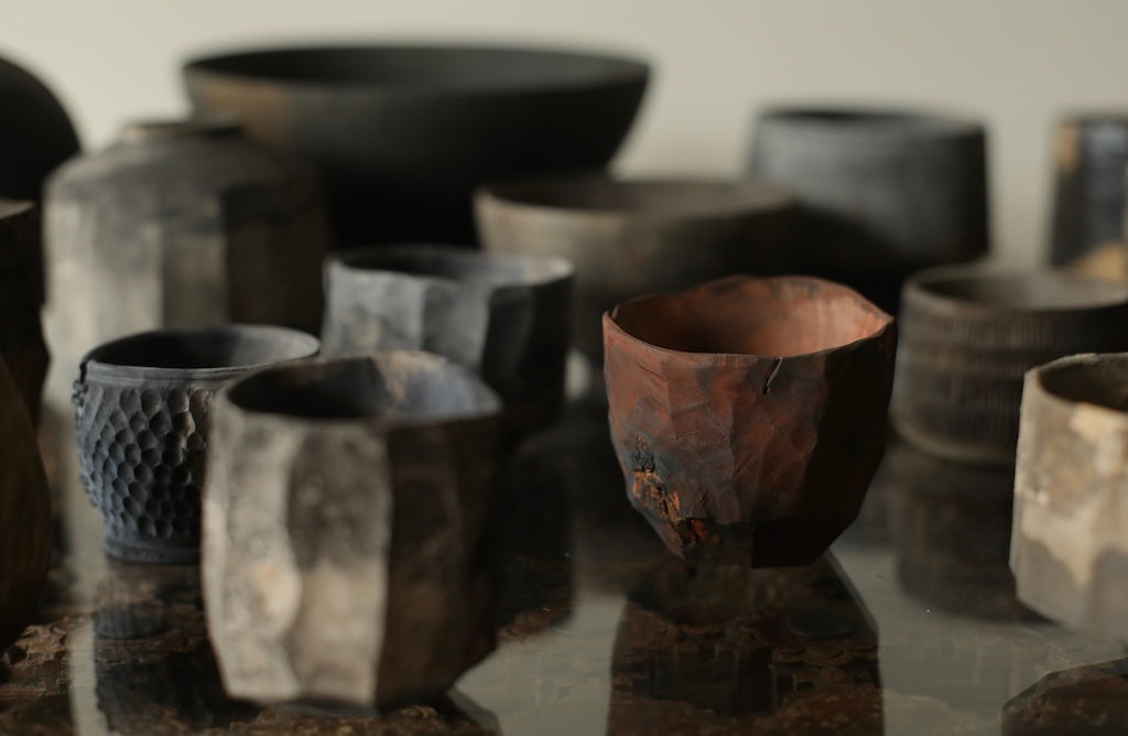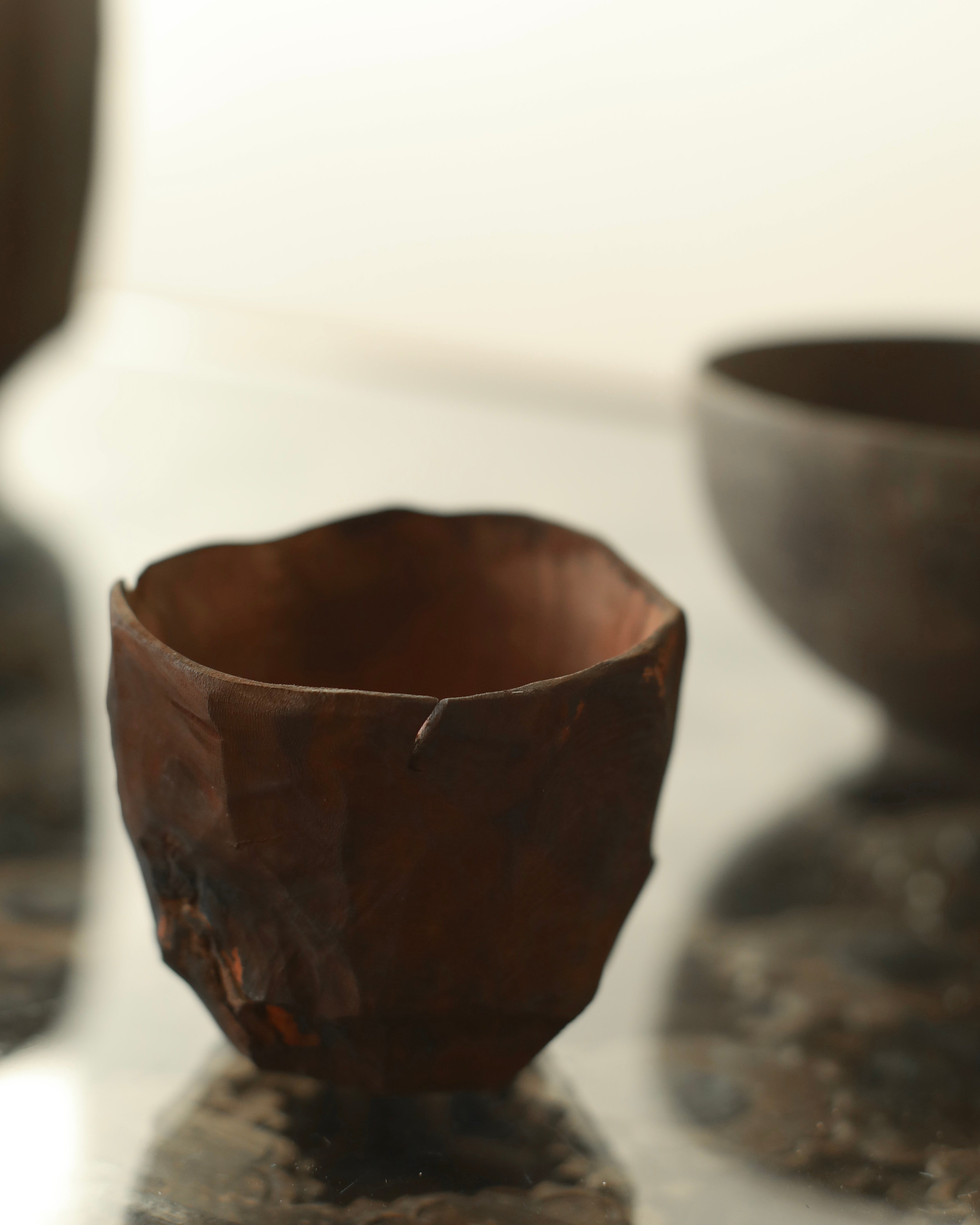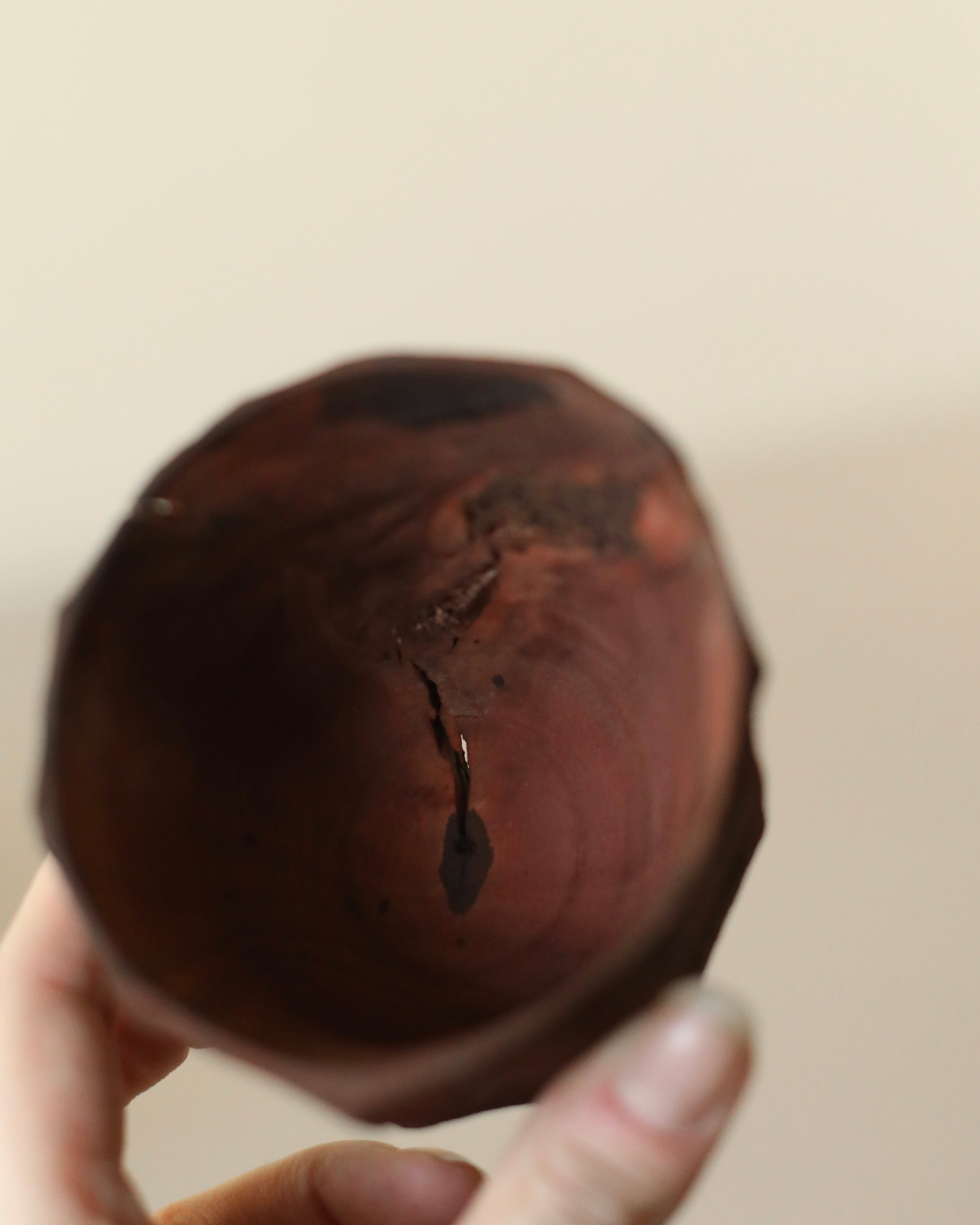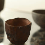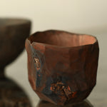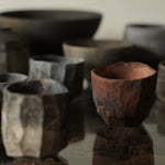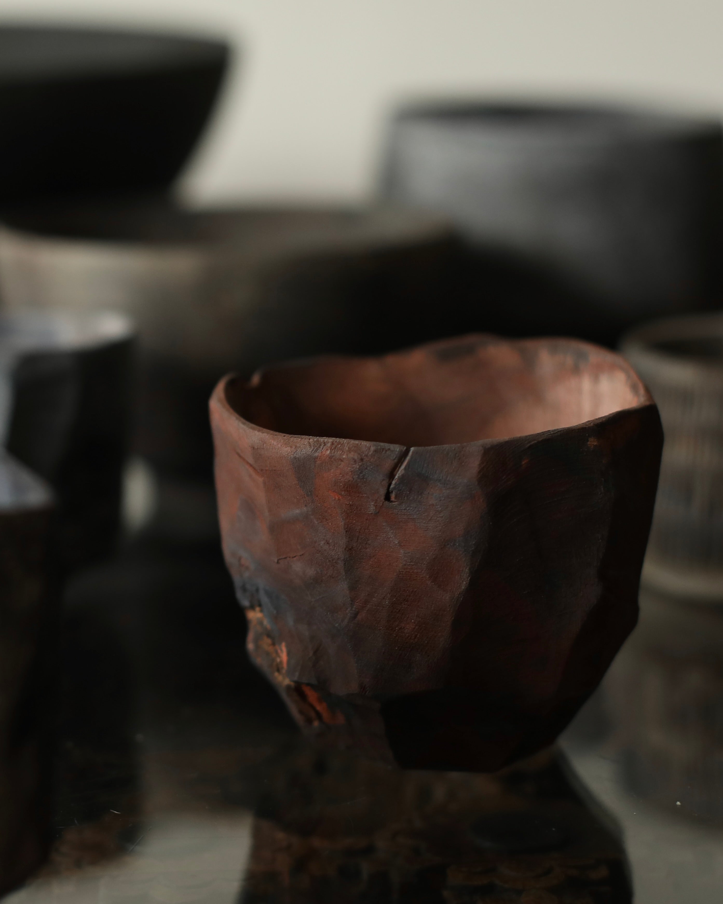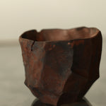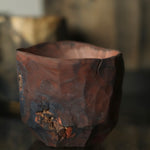 An organic cup form carved from sustainably sourced maple, with natural cracks and knots revealing the character of the wood. A dry finish of layered iron oxide and earth pigments gives an irregular dark undertone, accented with a deep red-pink. The organic silhouette, and soft, deep tone draw attention to subtle cracks, gaps and knots, fully embracing the thoughtfully selected material.
