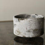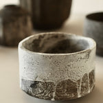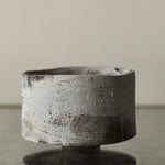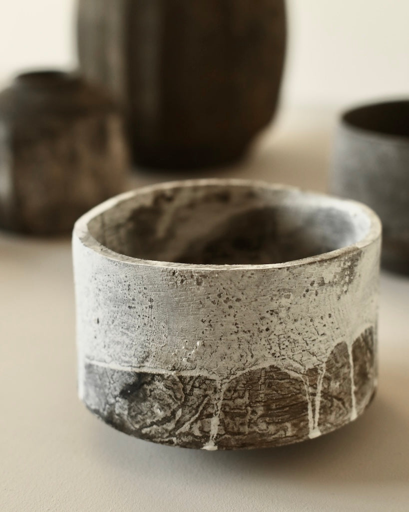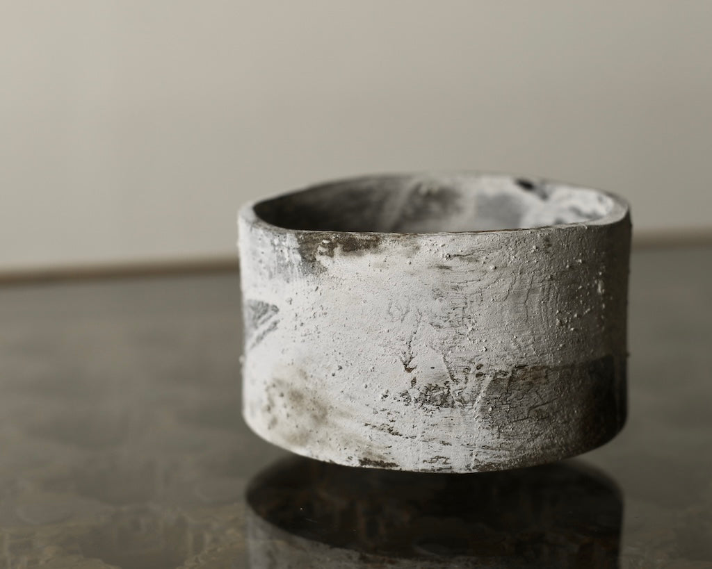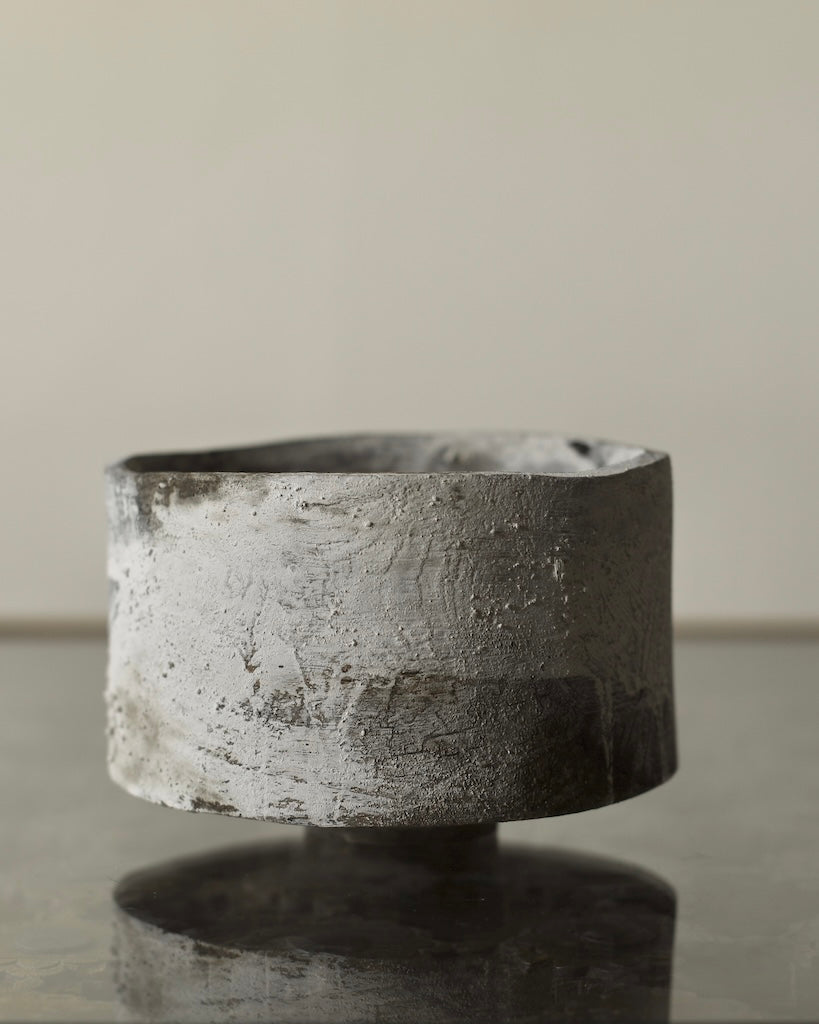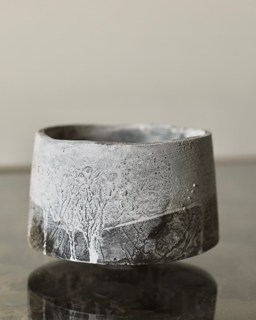 A large cup form is crafted from sustainably sourced oak, gently widening toward the base before resting on a small foot. Dark undertones are layered with local chalk pigments, creating drips and subtle veining across the surface. This layered finish alternately reveals and conceals the intricate textures and patterns of the oak. The lightness of the chalk, moving downward into the darkness of the wood and iron oxide, draws attention to the boldness of the form.