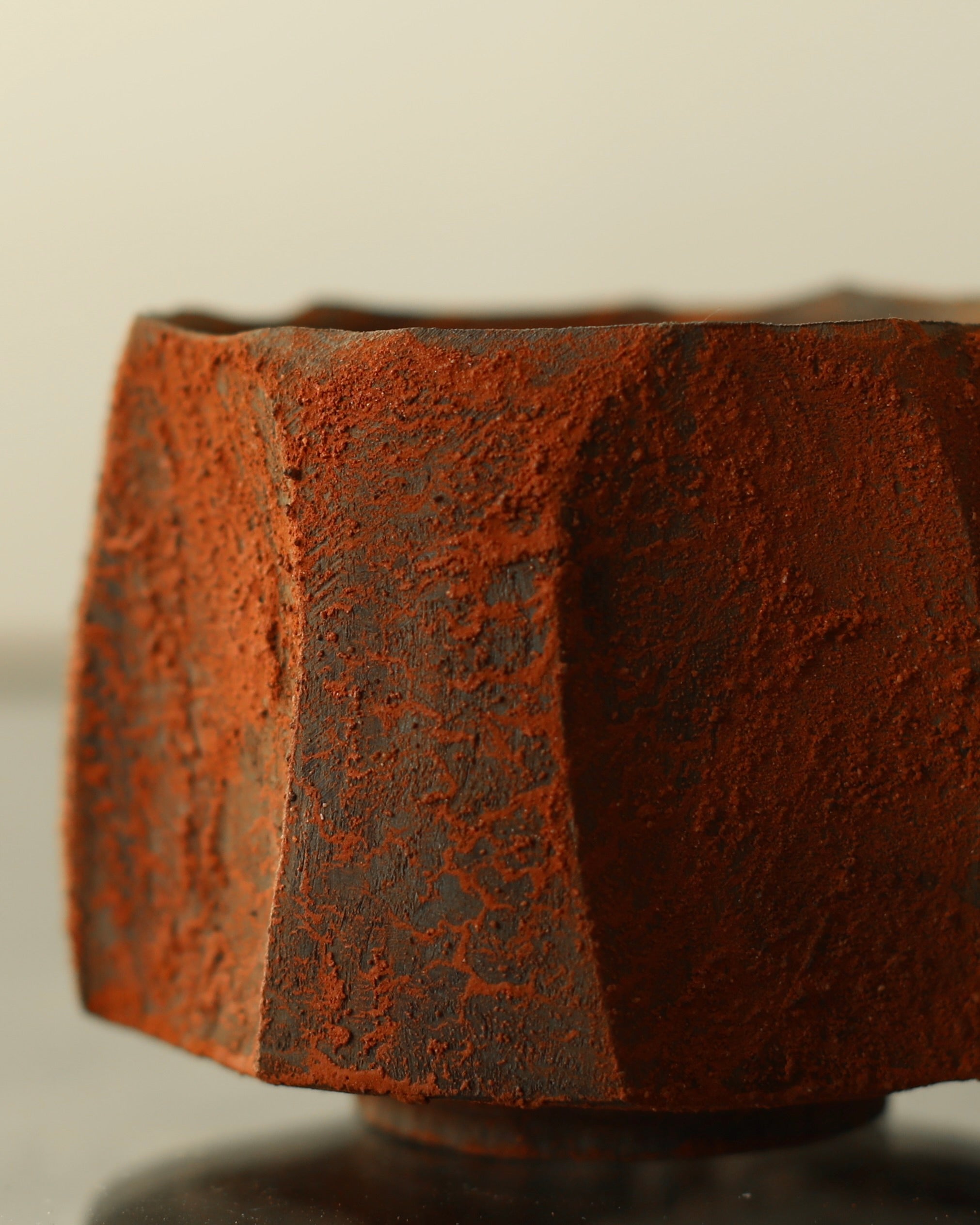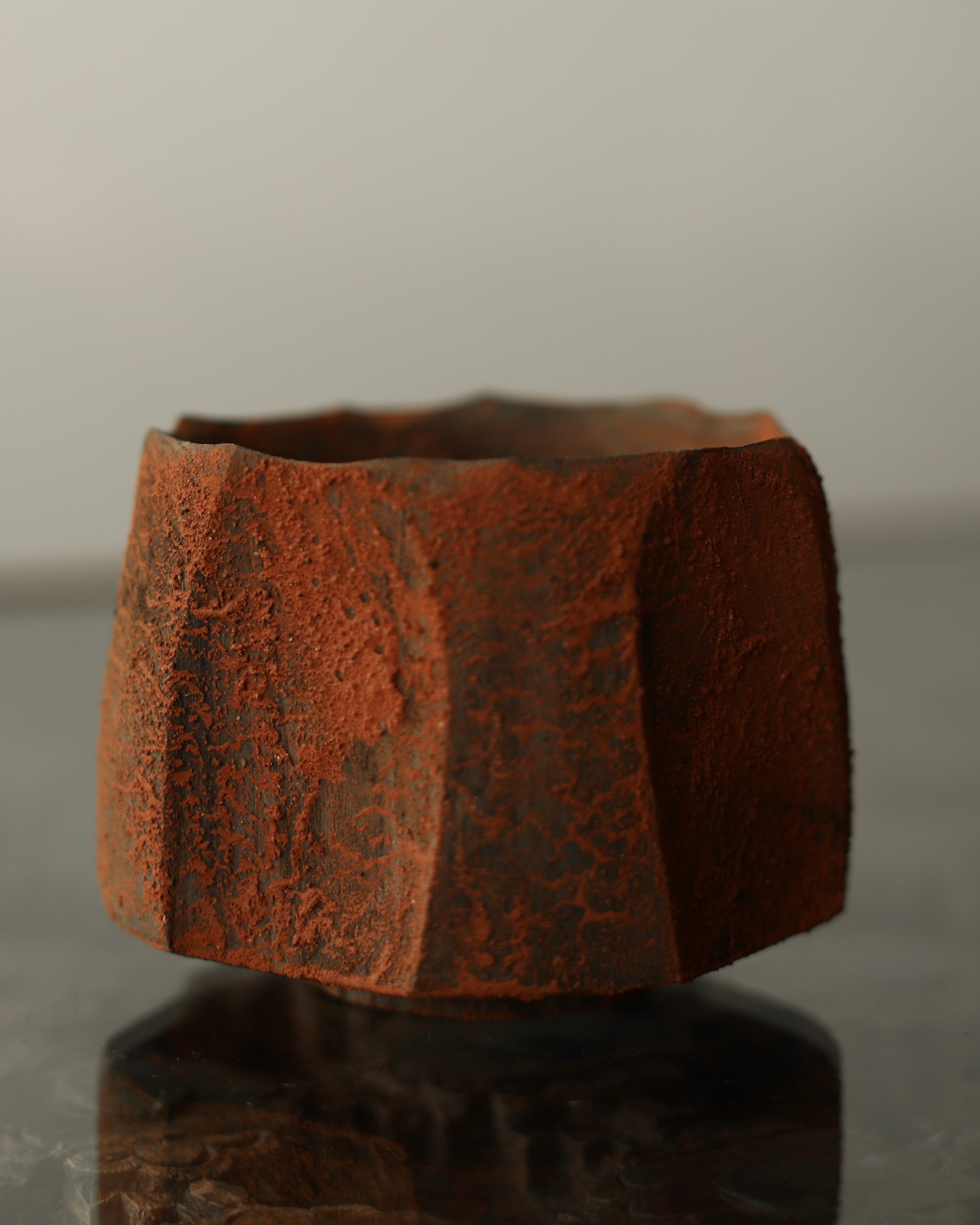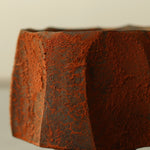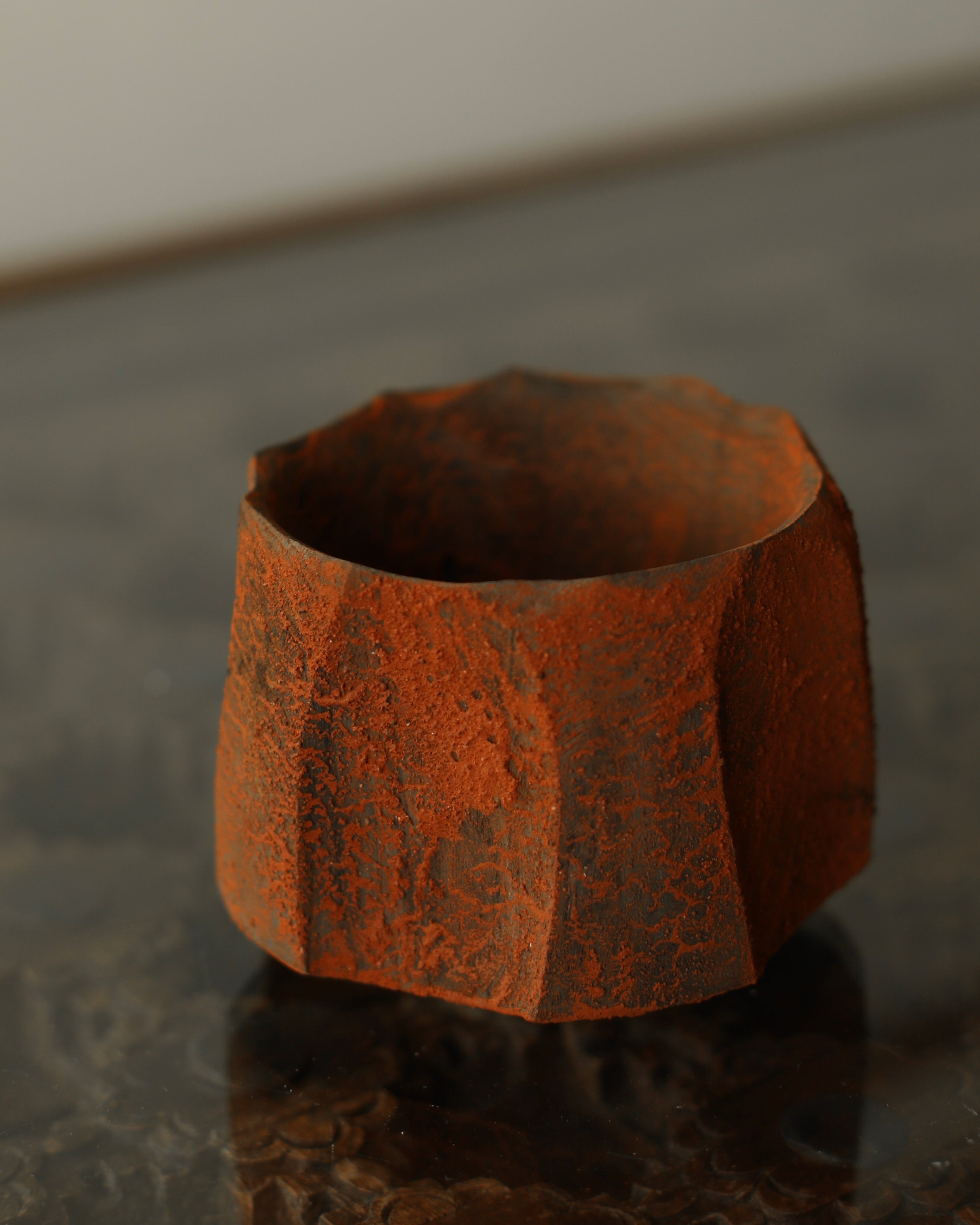 Hollowed from sustainably sourced oak, this cup features wide gauges running down the sides, creating a tactile surface that naturally invites the hand to settle into carved recesses. A short, rounded stand grounds the form, lending it a sculptural presence. Finished with iron oxide and locally gathered earth pigments, a bright umber-orange settles into the wood’s crevices and grain, evoking washed sand patterns against the depth of dark oak, while the surface retains a subtle, granular tactility. A single knot hole pierces the vessel, a reminder of the tree’s original life and the natural imperfections that define its character.