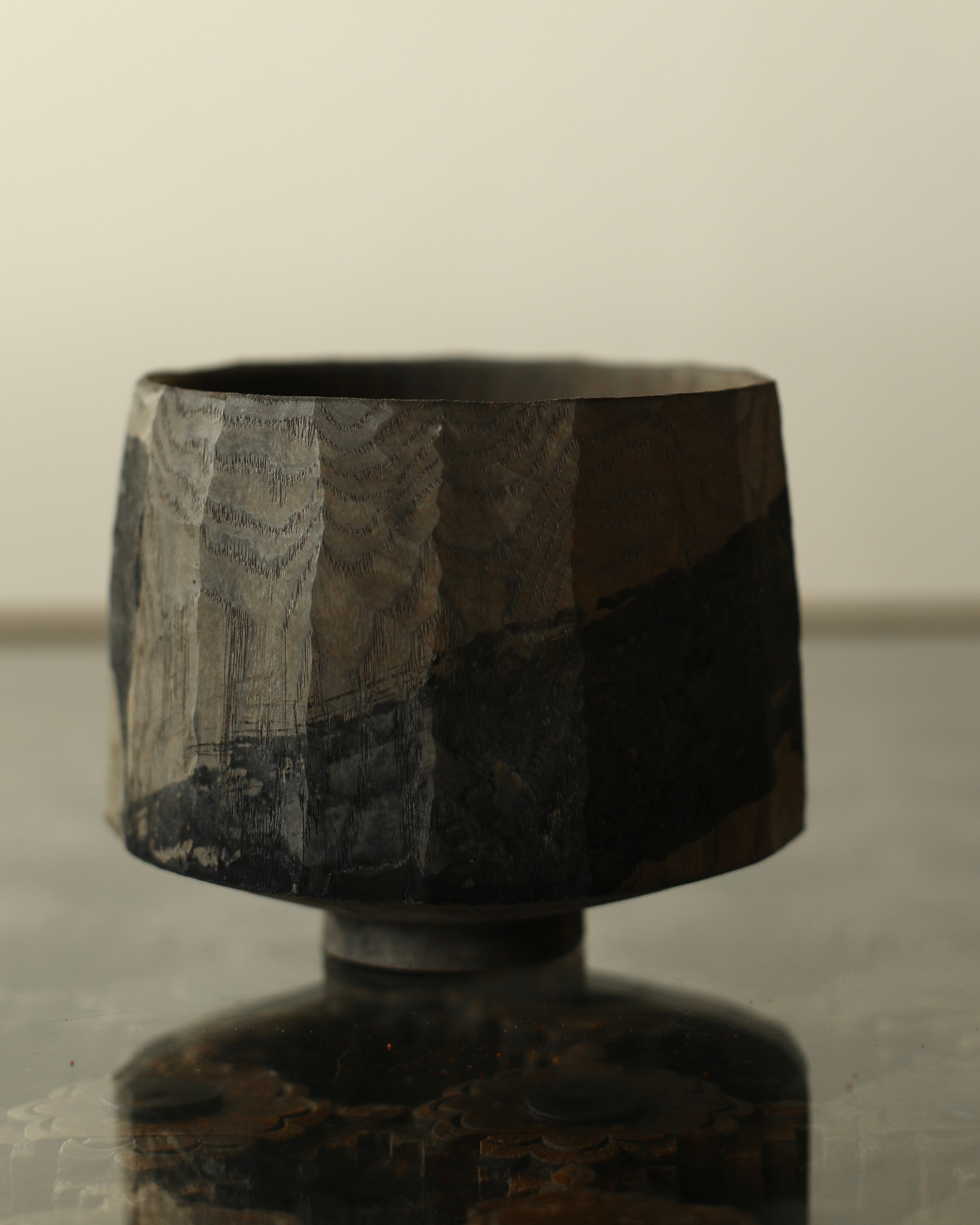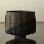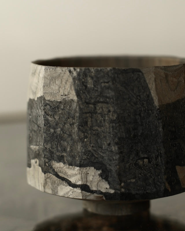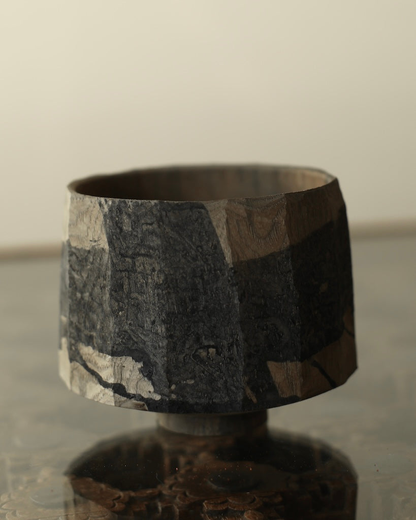 A wide cup form, made from sustainably sourced oak, resting on a small foot. Irregular vertical hand-carved facets run along the body, with a dry finish marked with an expressive graphic, broad stroked cross of iron oxide and oak gall dye. A pieces rich with contrasts, where light wood tones meet sooty blacks, organic carvings meet perfect balance and bold gestures meet intricate, natural patina.