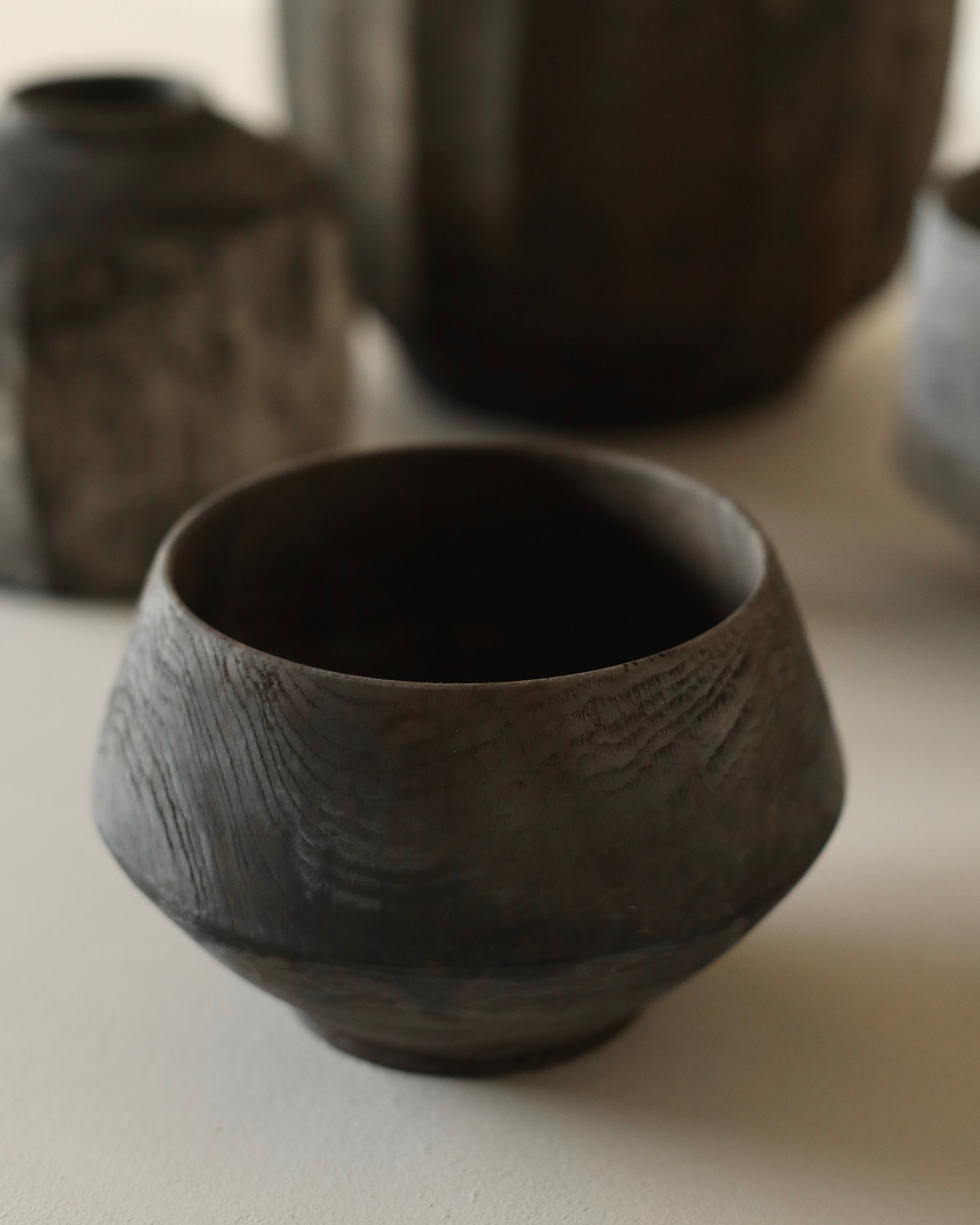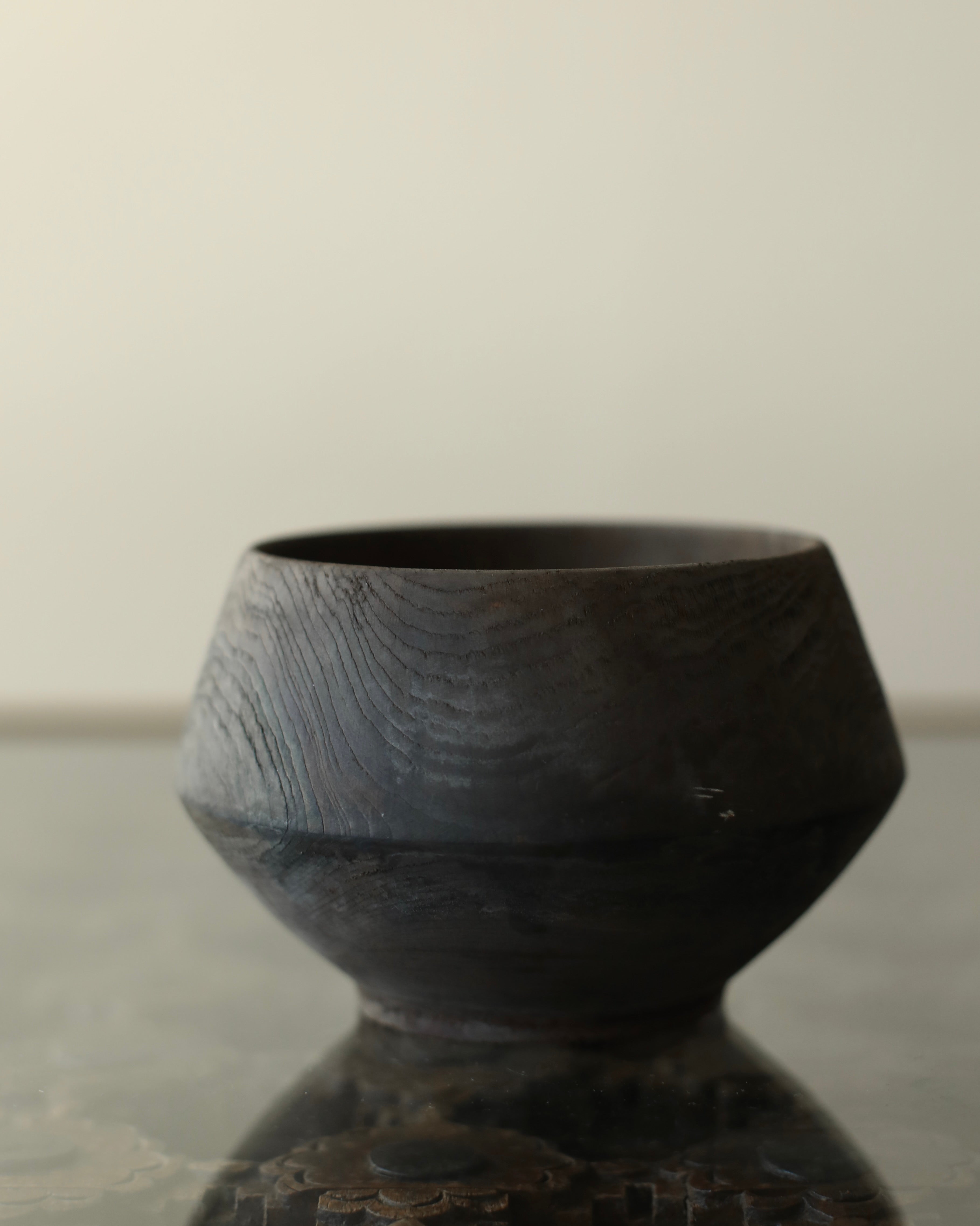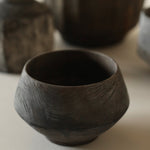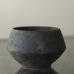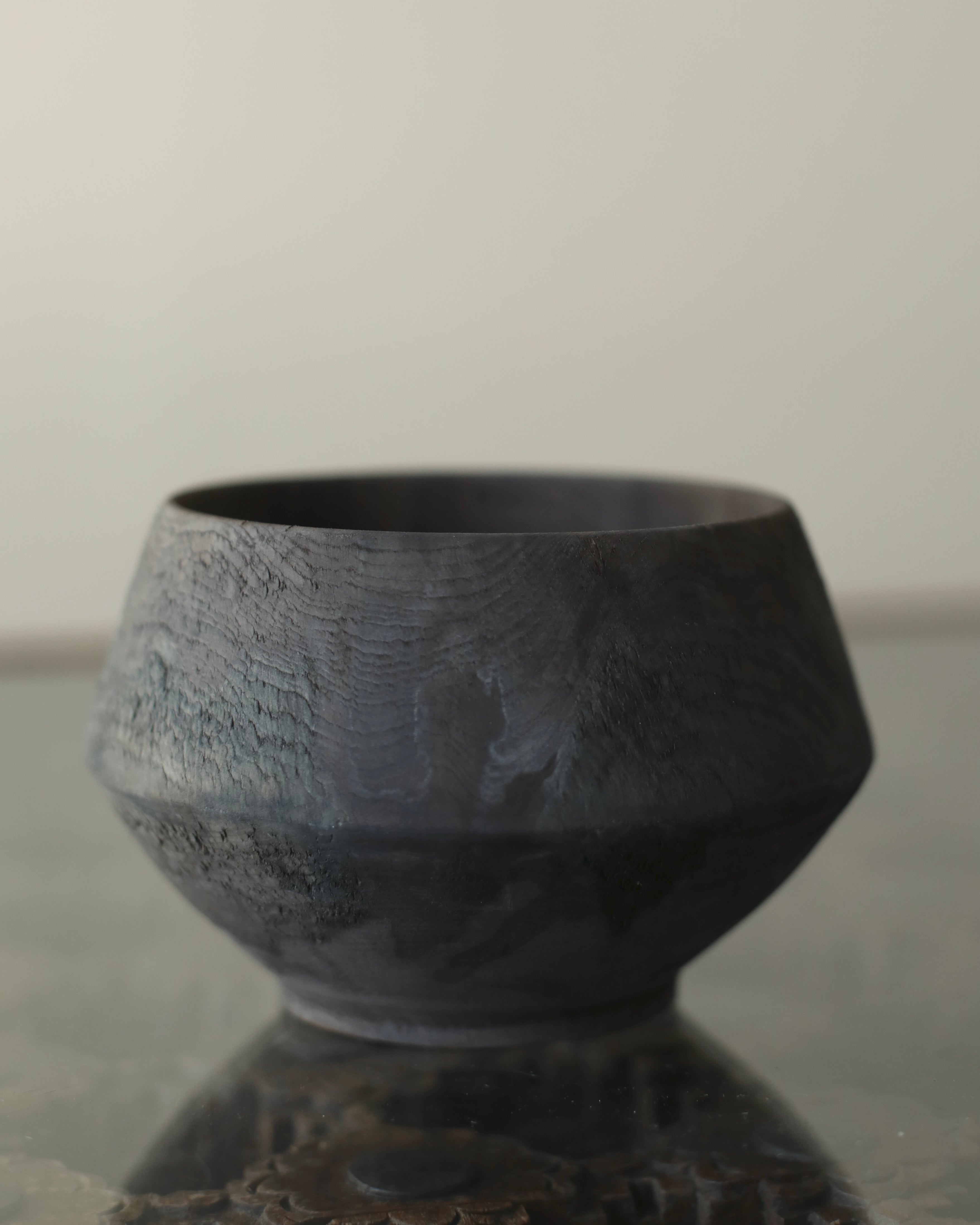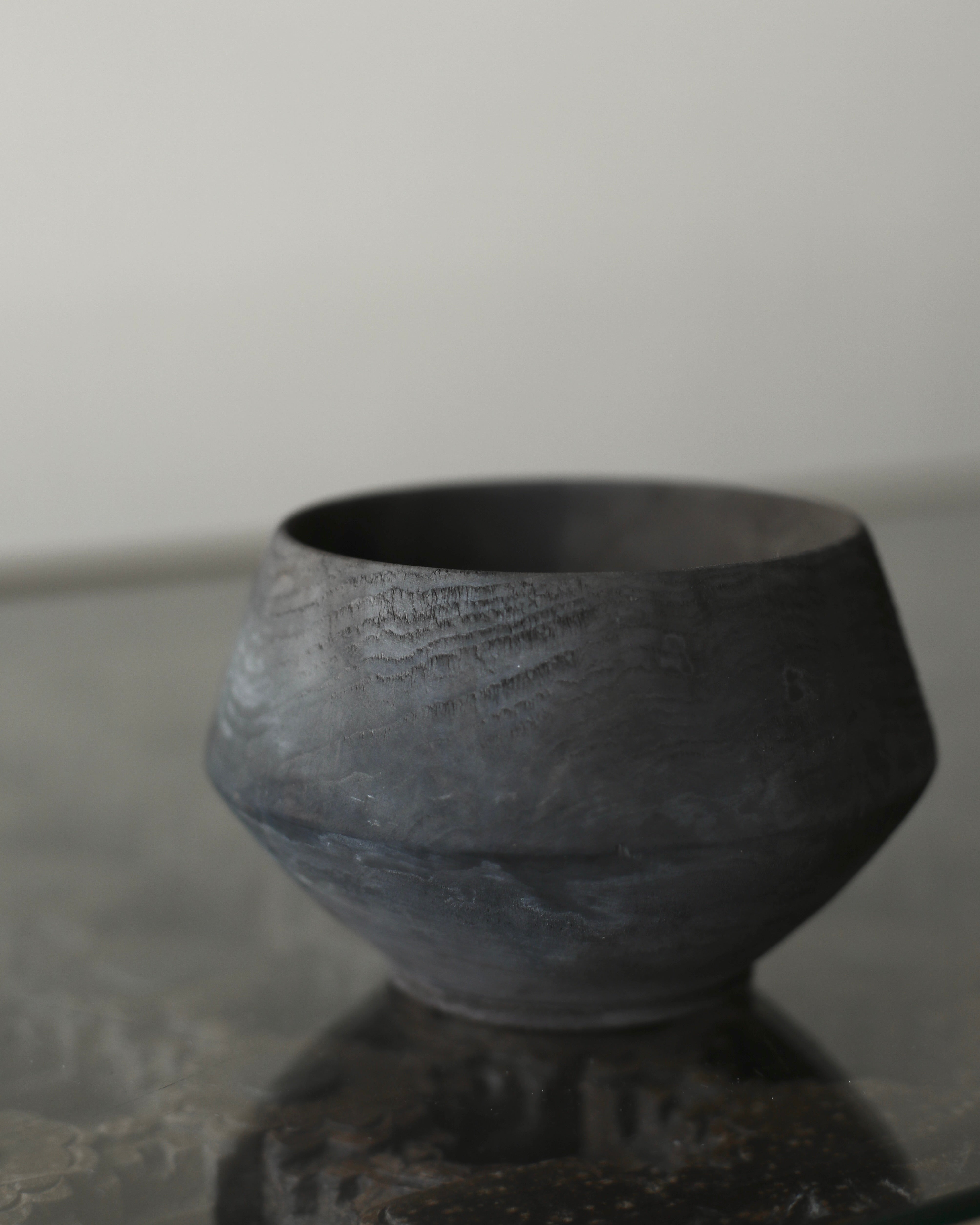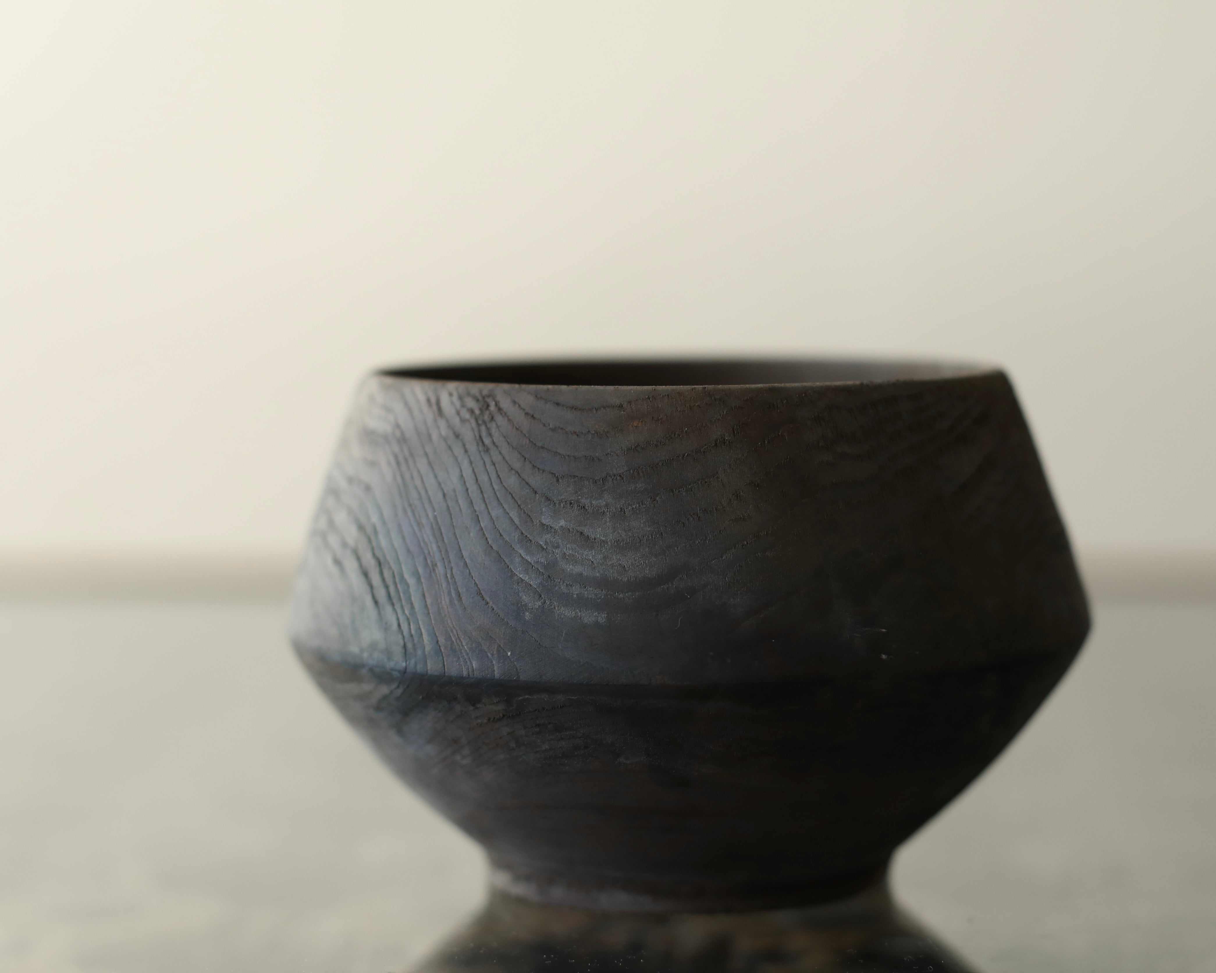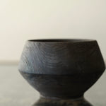 Cup made from sustainably sourced yew, resting on a small stand. The form widens to a sharply defined midpoint before tapering to a rounded opening. A dry surface carries varied tones from a tea and iron finish, highlighting the natural character of the wood.