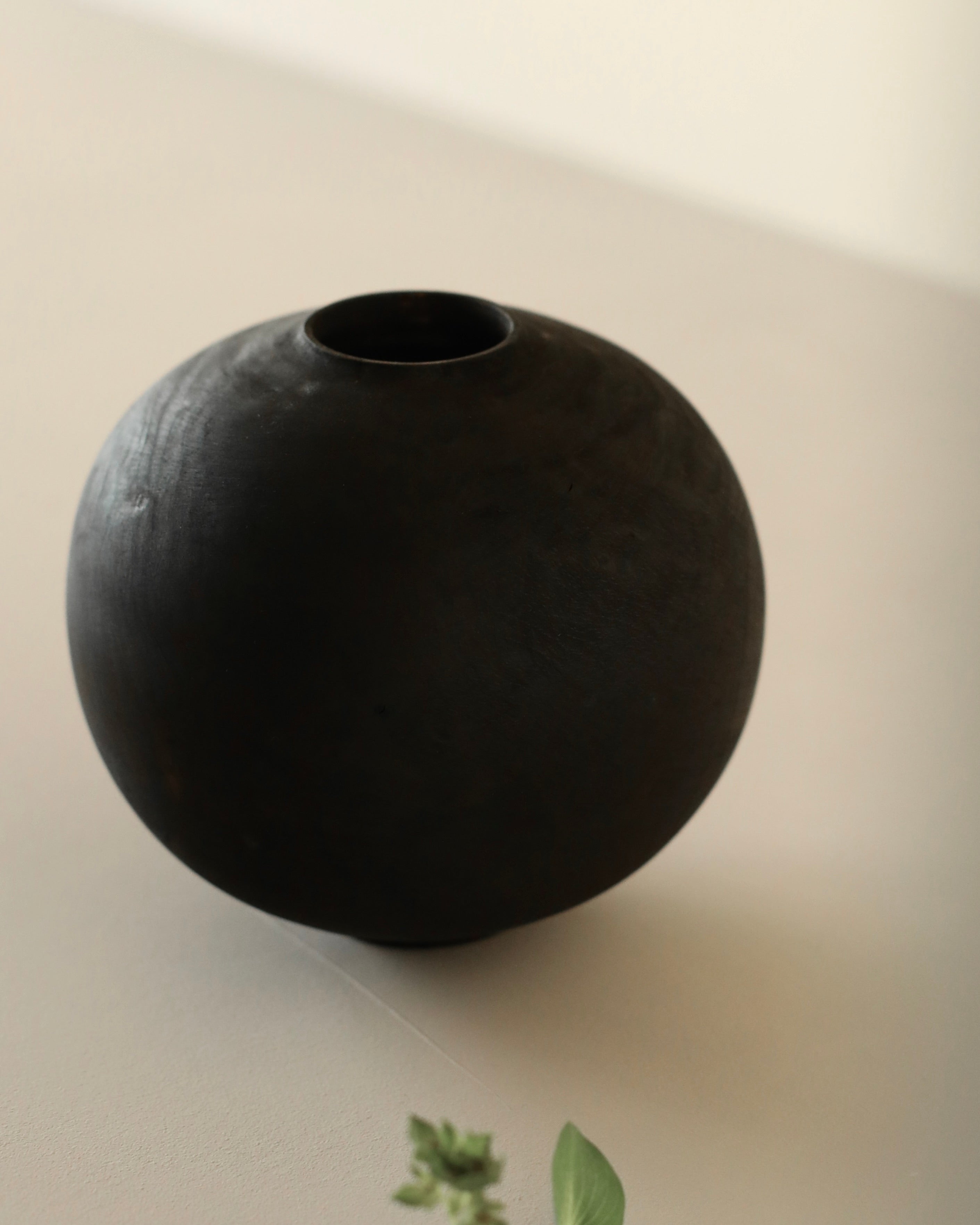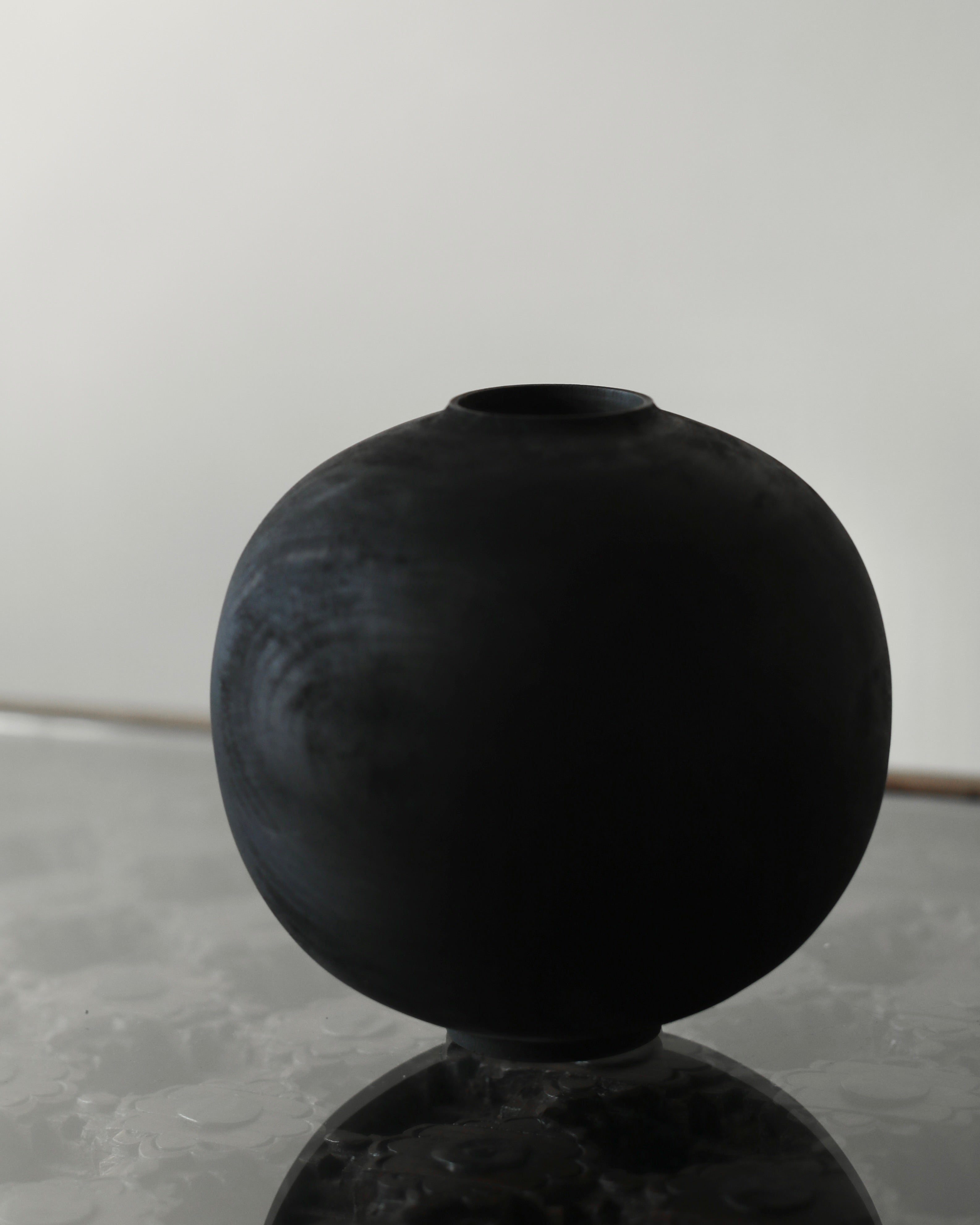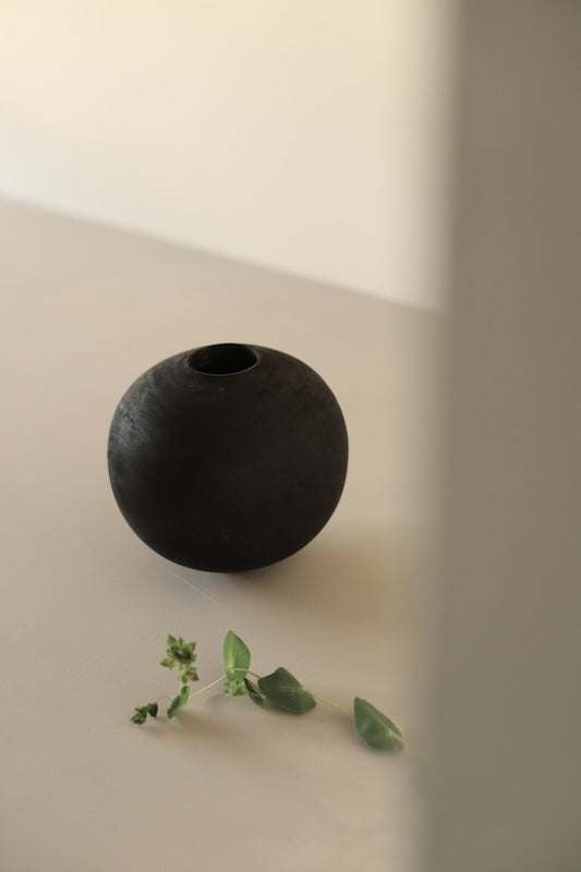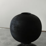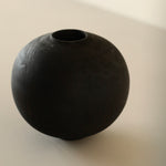 Moon jar form made from storm-fallen greengage. Dyed and scorched, the wood takes on a deep, dry tone. Mostly black with touches of reddish brown coming through the torched finish, natural lines and markings of wood are subtly visible beneath the otherwise smooth surface.