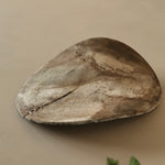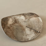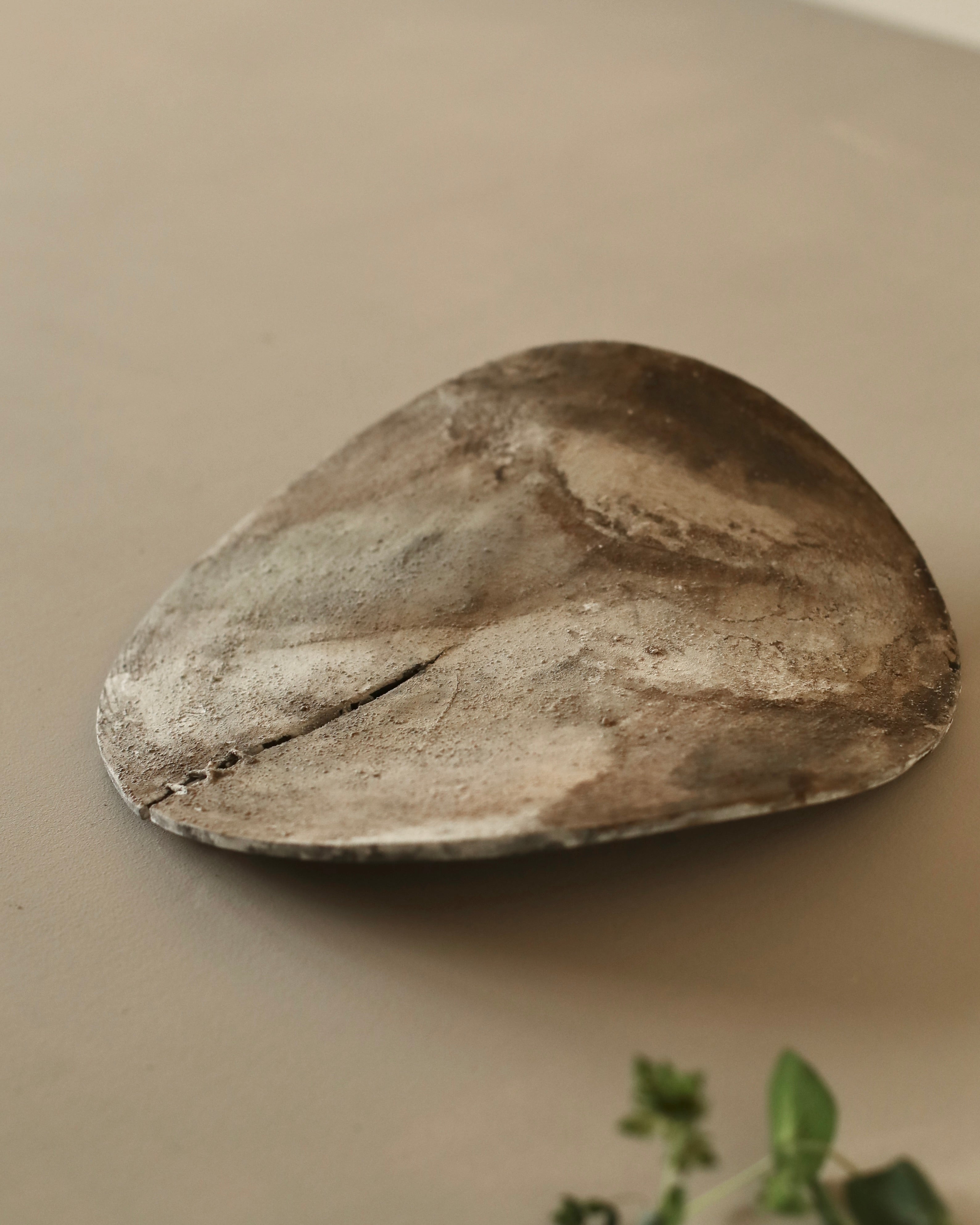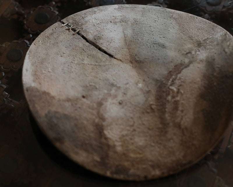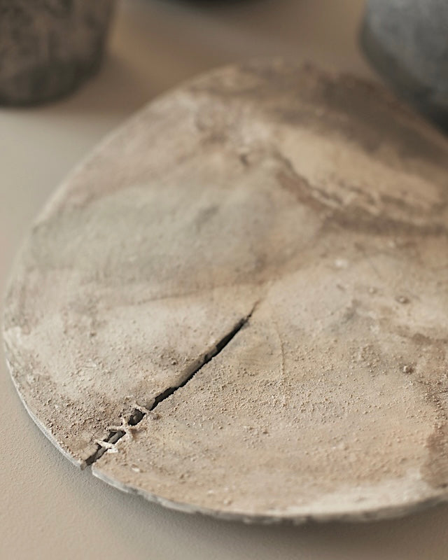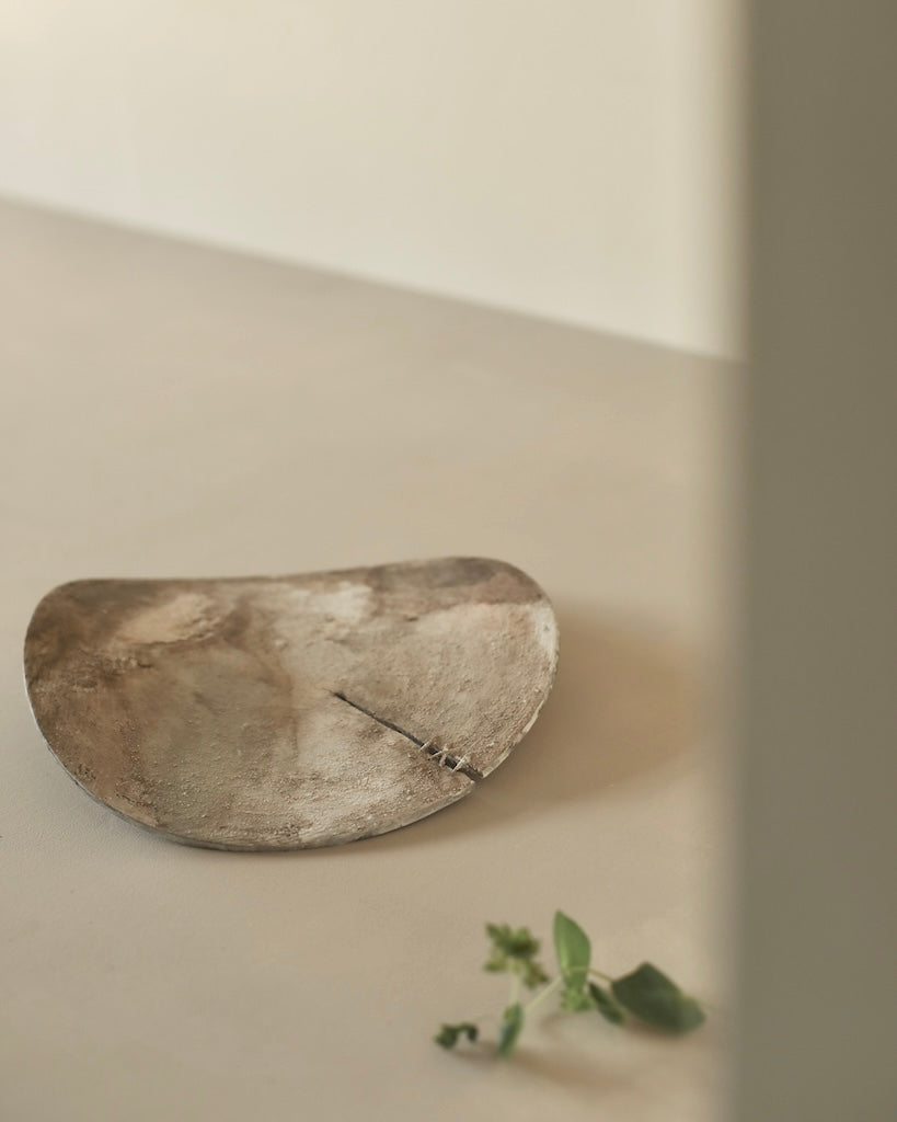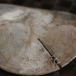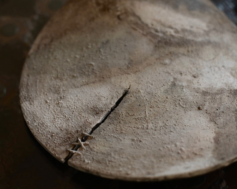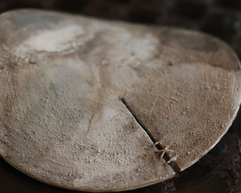 Made from sustainably sourced oak, this warped disc is shaped by the natural drying of the wood, allowing the form to gently distort over time. Finished with local botanical dyes and earth pigments, the surface has a dry, textured finish. Visible stitched knots mark points of repair, leaving traces of the maker’s hand. With both painterly and sculptural qualities, the piece can be exhibited on a wall or placed on a surface.