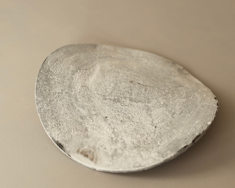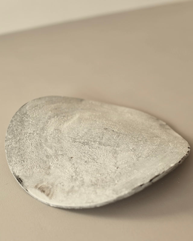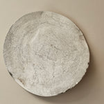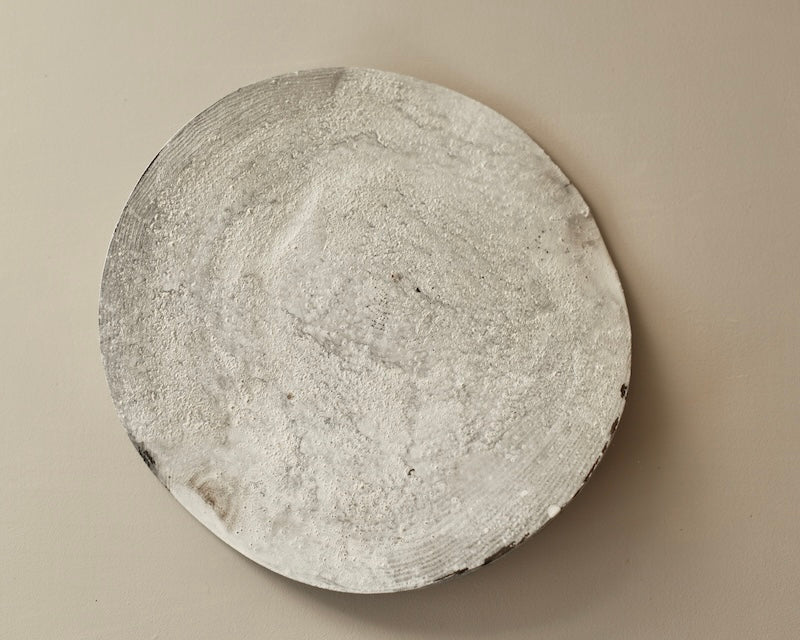 Made from sustainably sourced oak, this warped disc is shaped by the natural drying of the wood, allowing the form to gently distort over time. A local chalk pigment finish creates a washed, white surface with a dry, grainy texture. Combining painterly and sculptural qualities, the piece can be exhibited on a wall or placed on a surface.