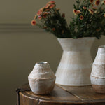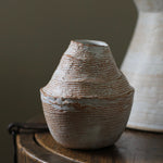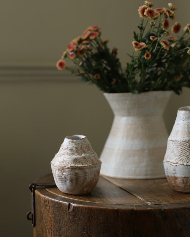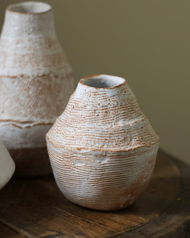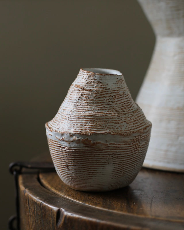 This vessel is coated with a smooth opaque satin white glaze, with the incised pattern breaking into a brighter white. The marks on the surface of this vessel embody the energy of making and emphasise the dramatic, angular form.