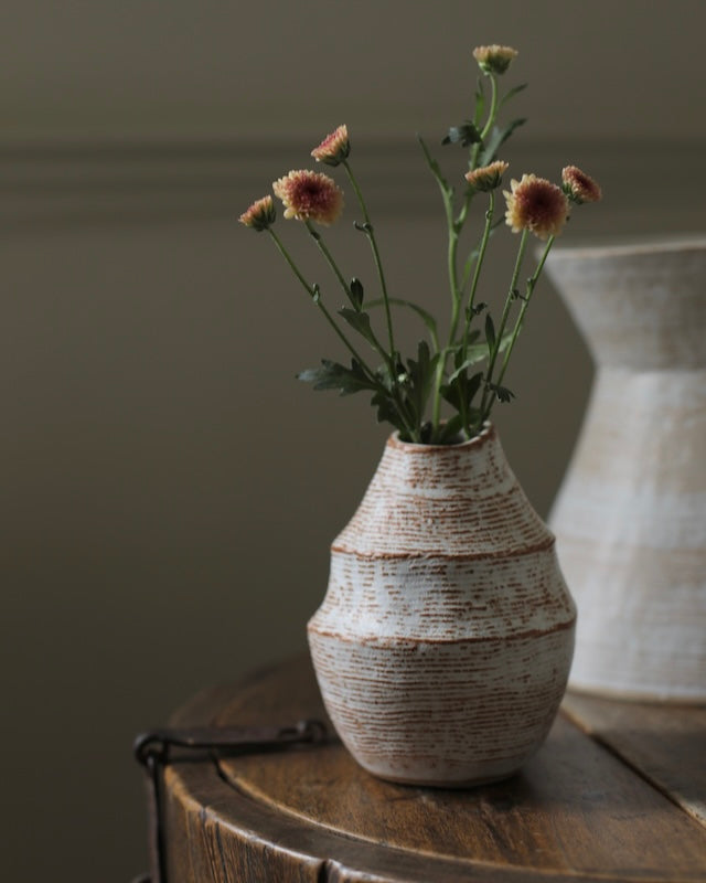 This vessel is coated with a smooth opaque satin white glaze, with the incised pattern breaking into a brighter white. The marks on the surface of this vessel embody the energy of making and emphasise the dramatic, angular form.