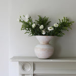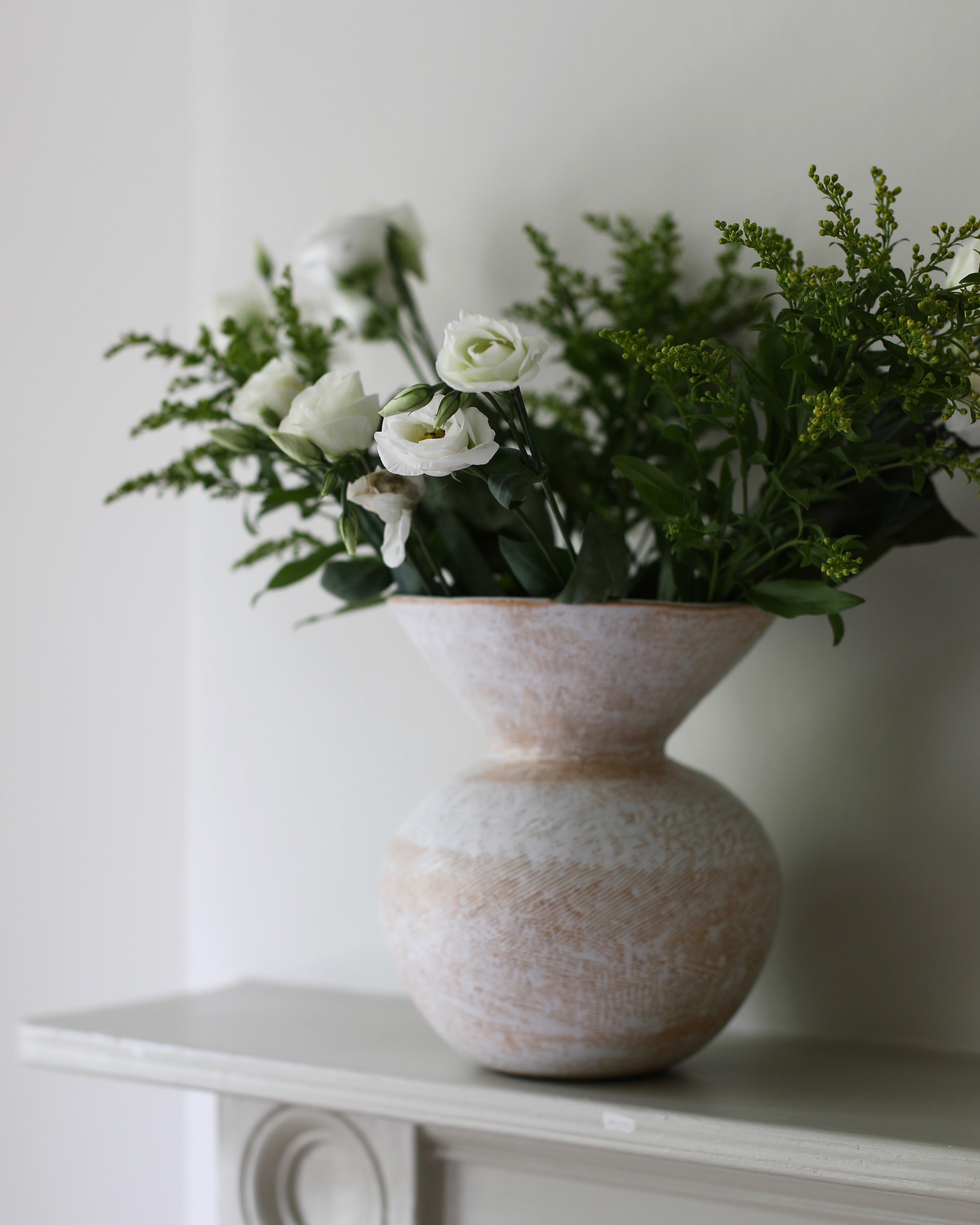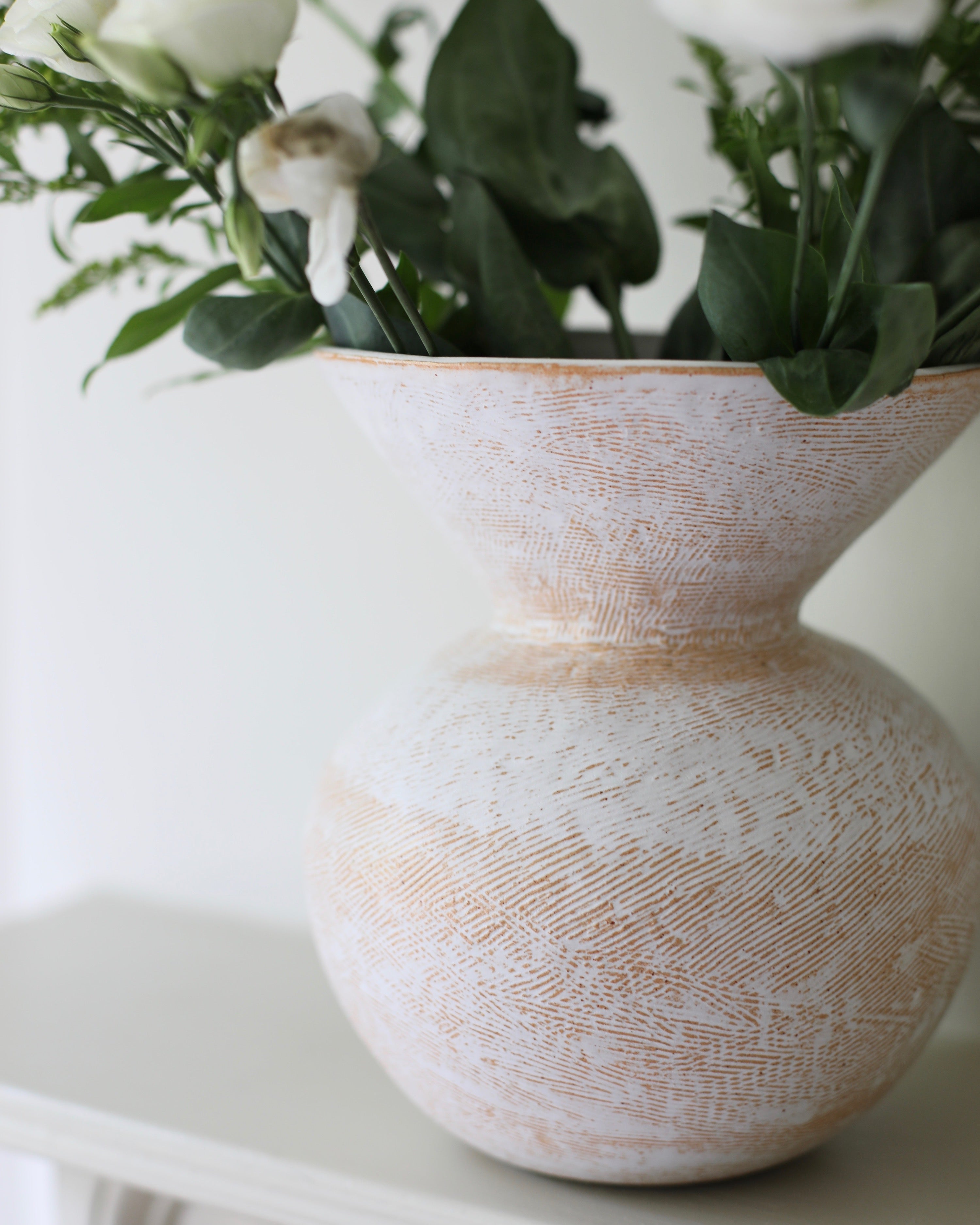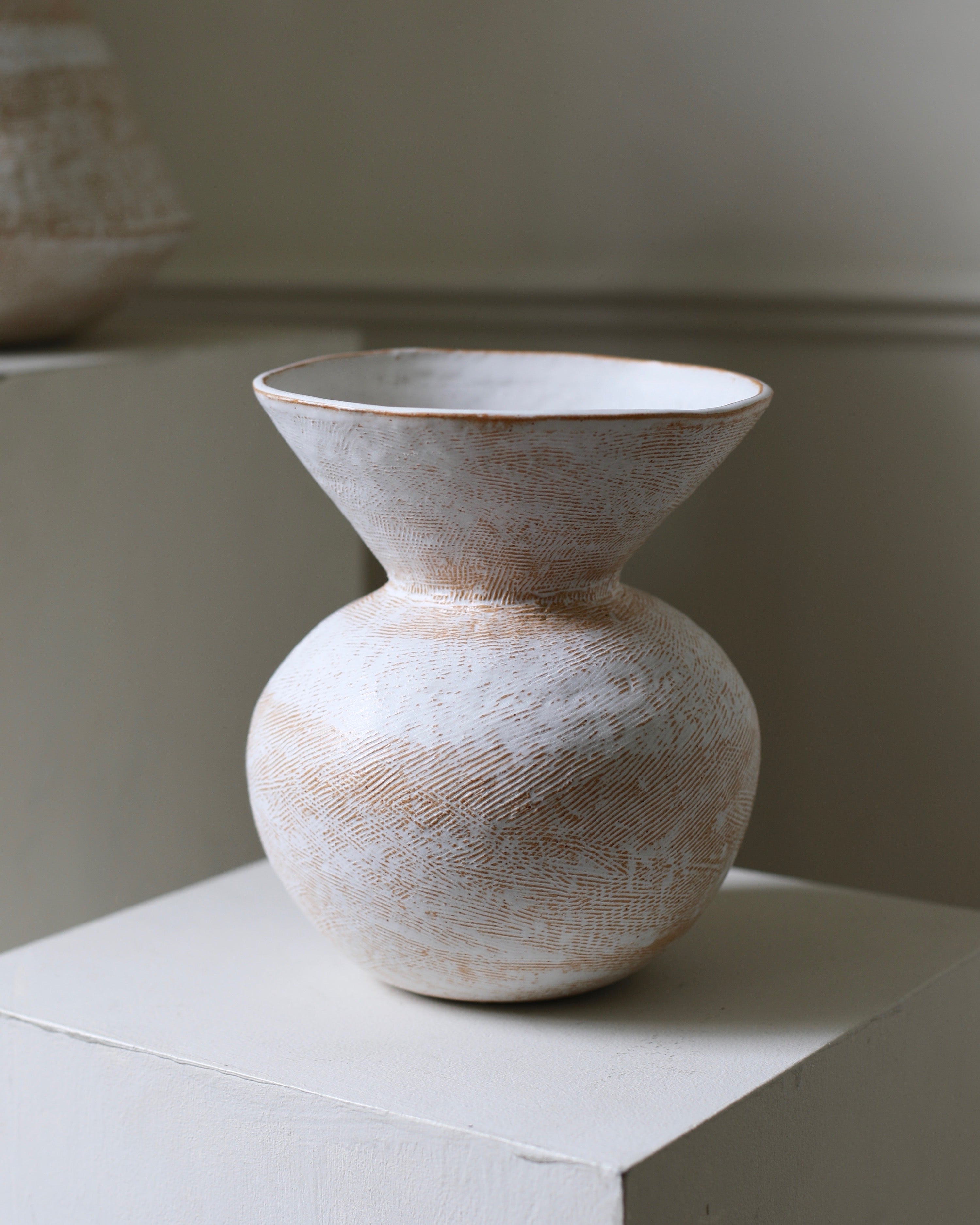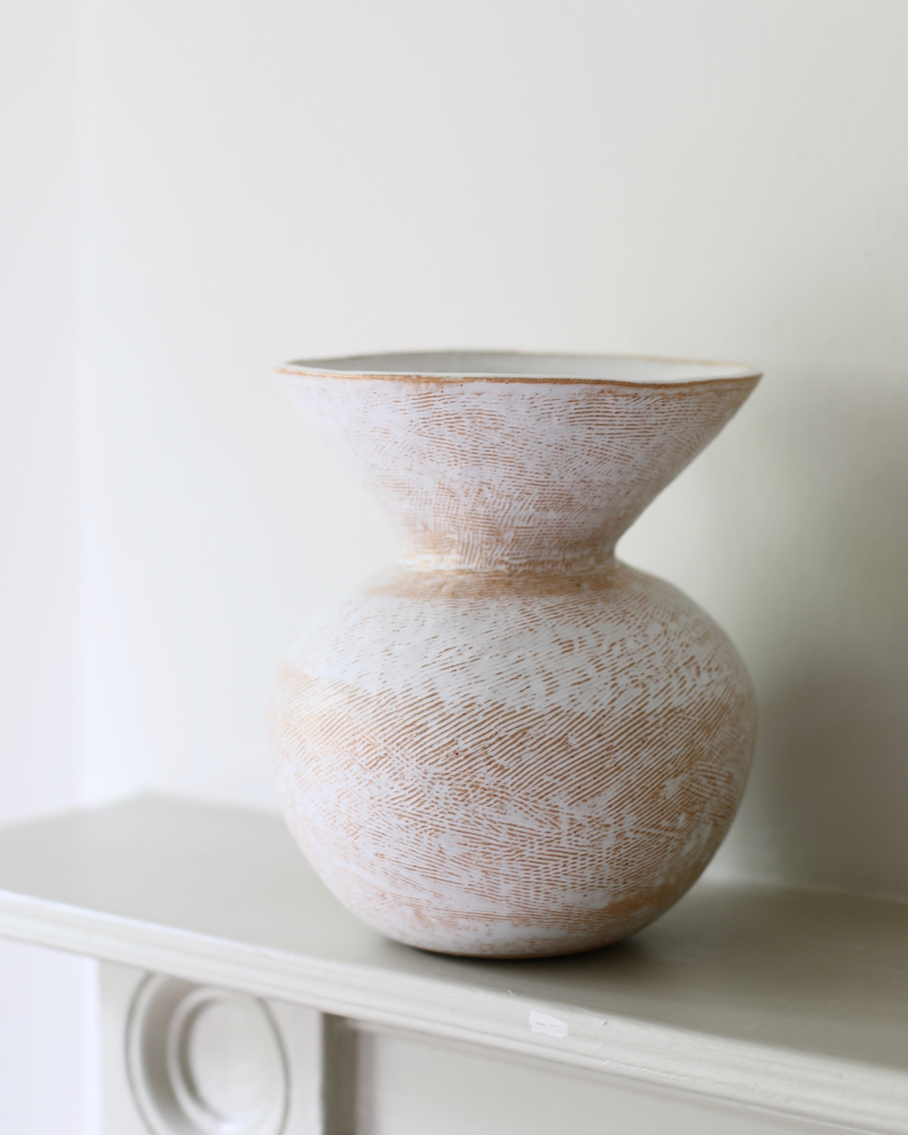 This vessel is coated with a smooth opaque satin white glaze, with the incised pattern breaking into a brighter white. The marks on the surface of this vessel embody the energy of making and emphasise the dramatic, angular form.