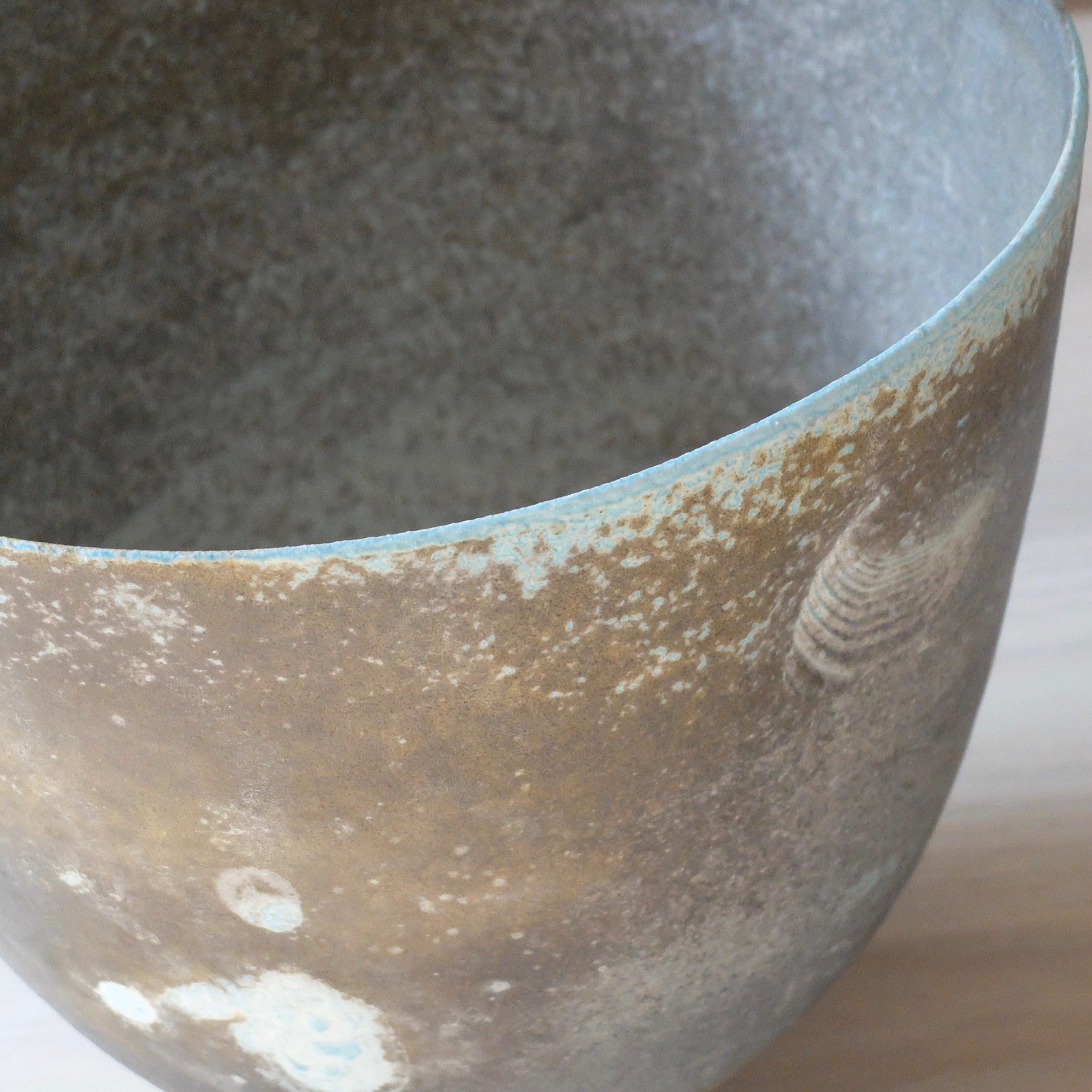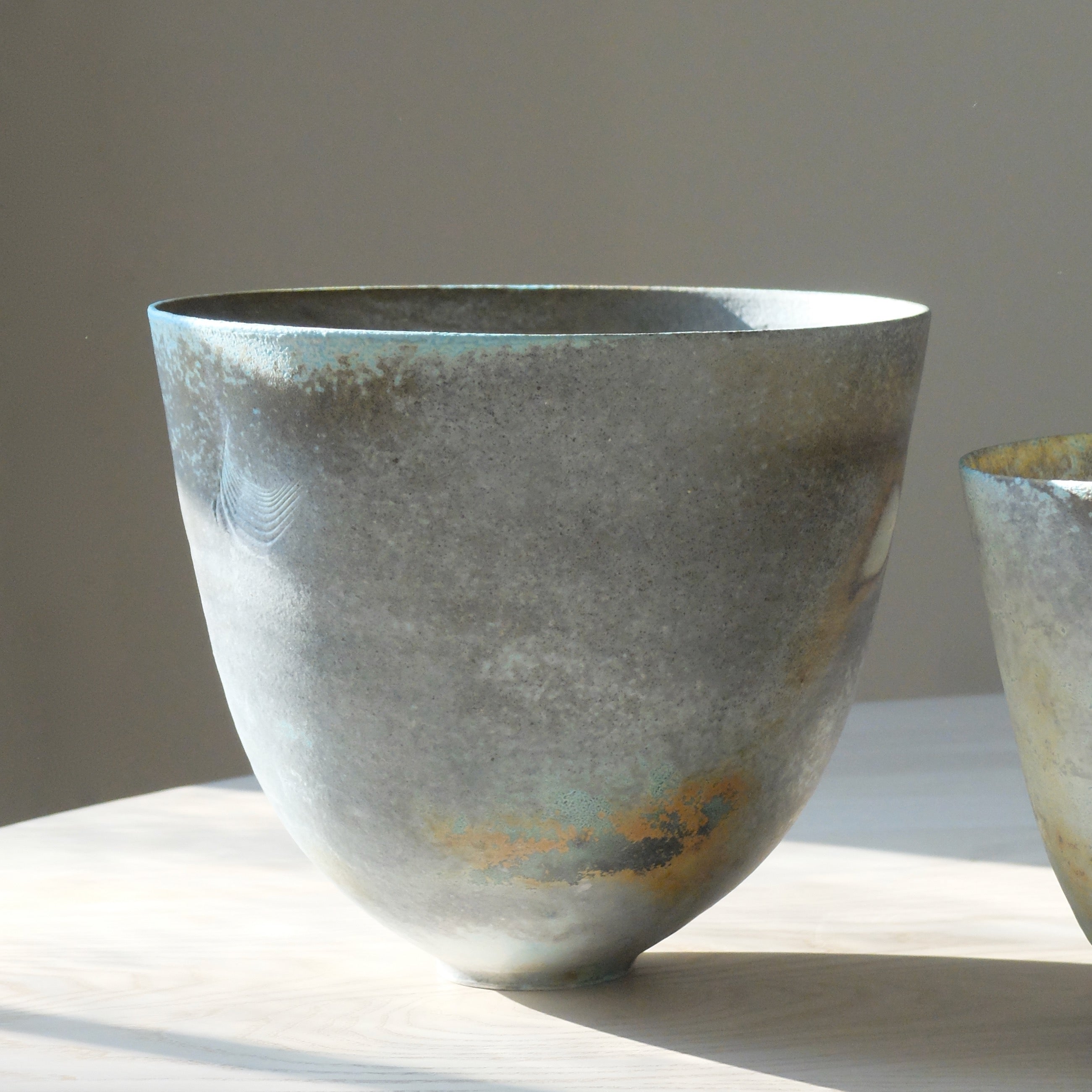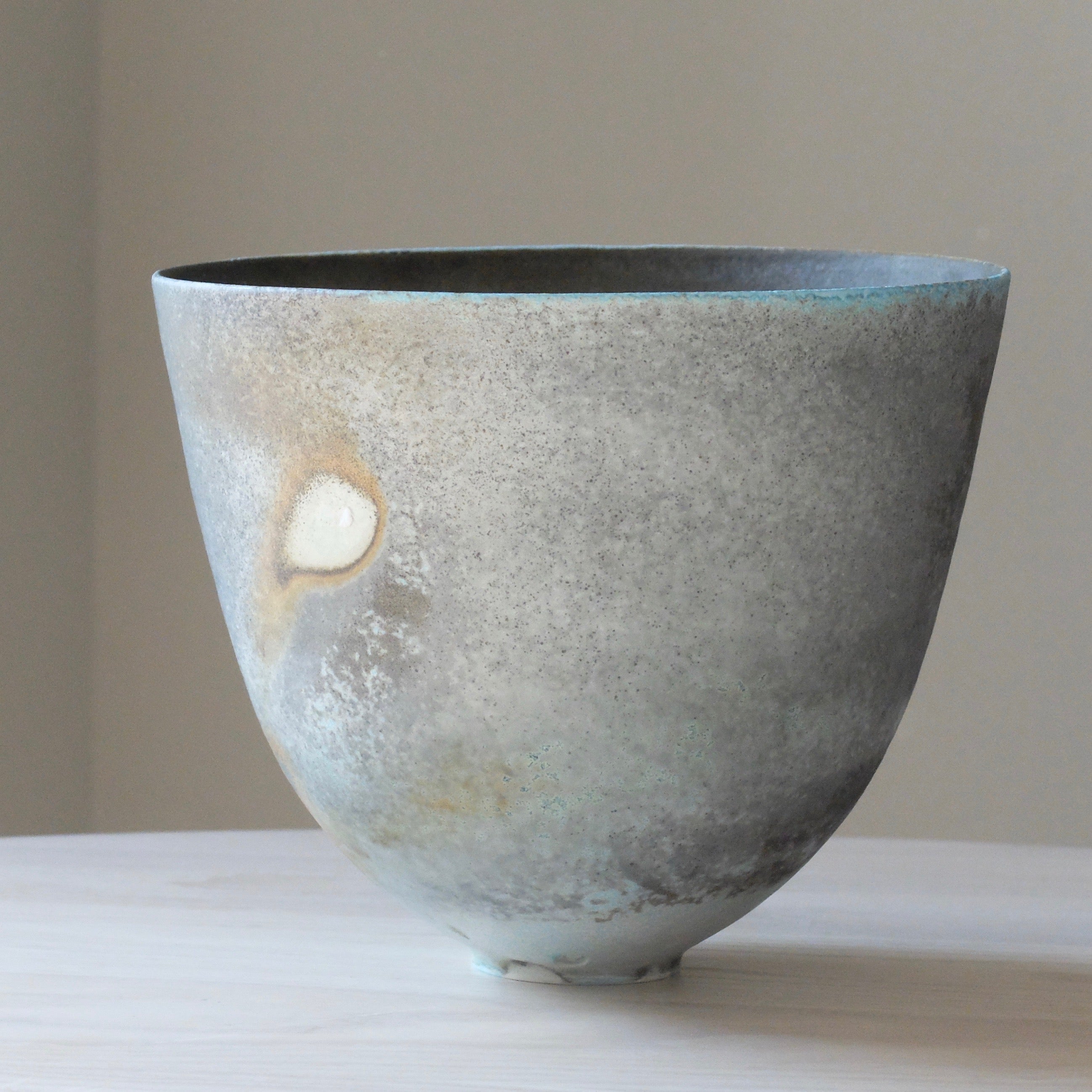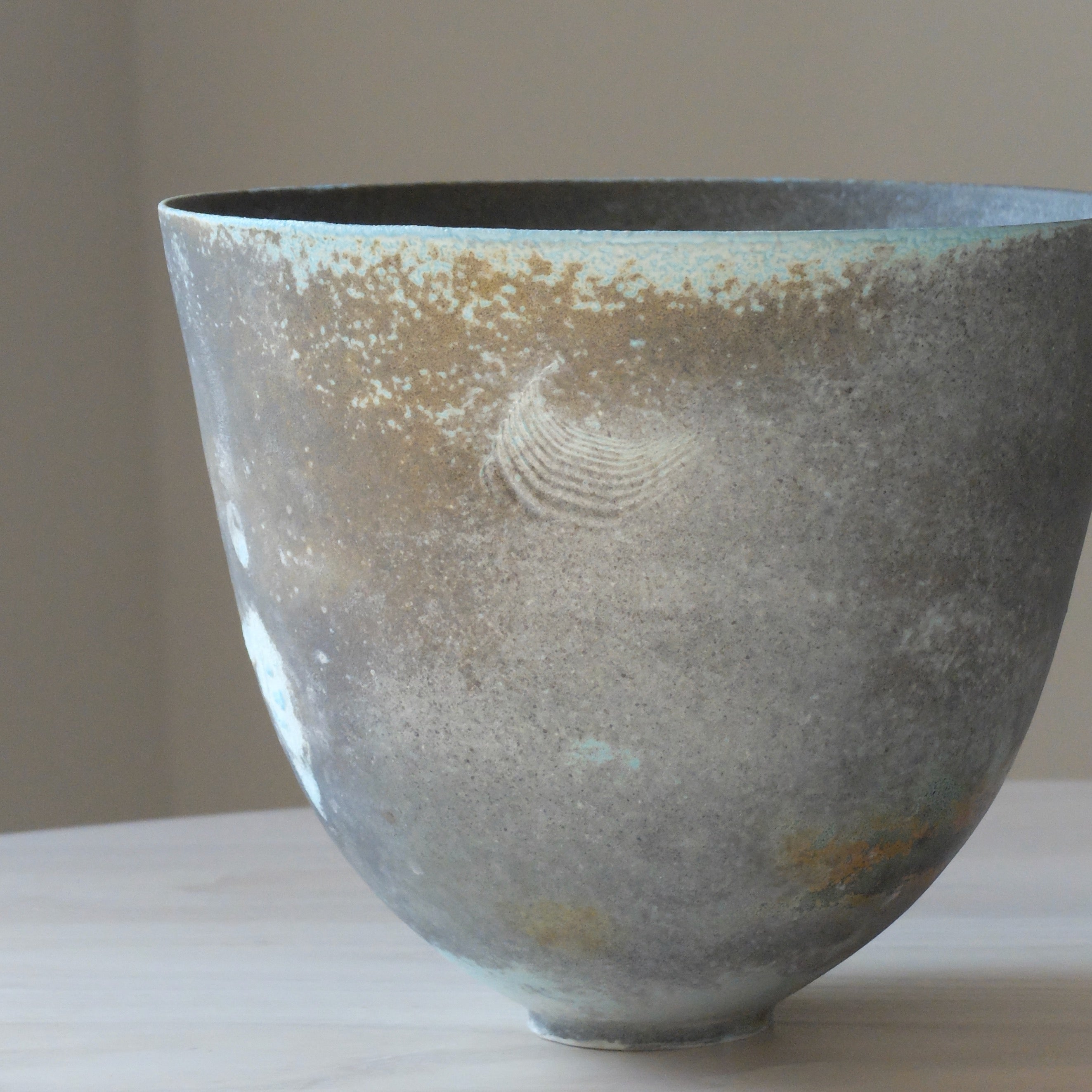 Monumental in form and stature, this sublime conical vessel exhibits an exterior surface of smokey, dark greys marked with an intricate lichen-like patterning of cyan blues and soft ochres. Its interior displays a stark cool blue base - drawing the eye in. A softly dimpled imprint of the artist’s hand and delicately carved splices that appear like gills feature on the vessel’s surface.