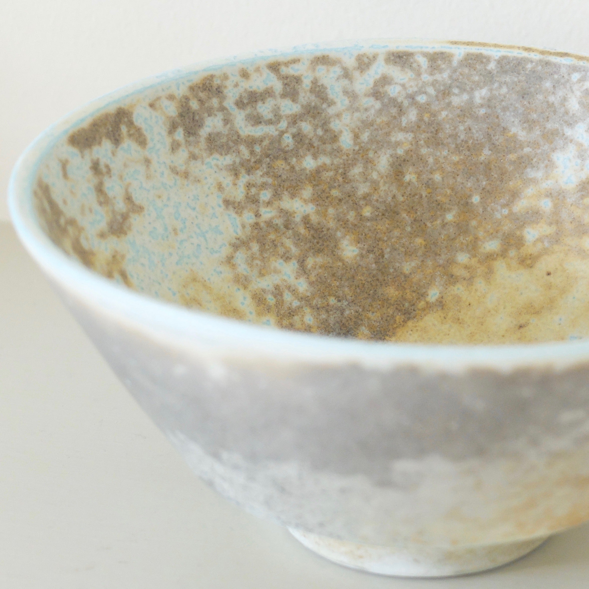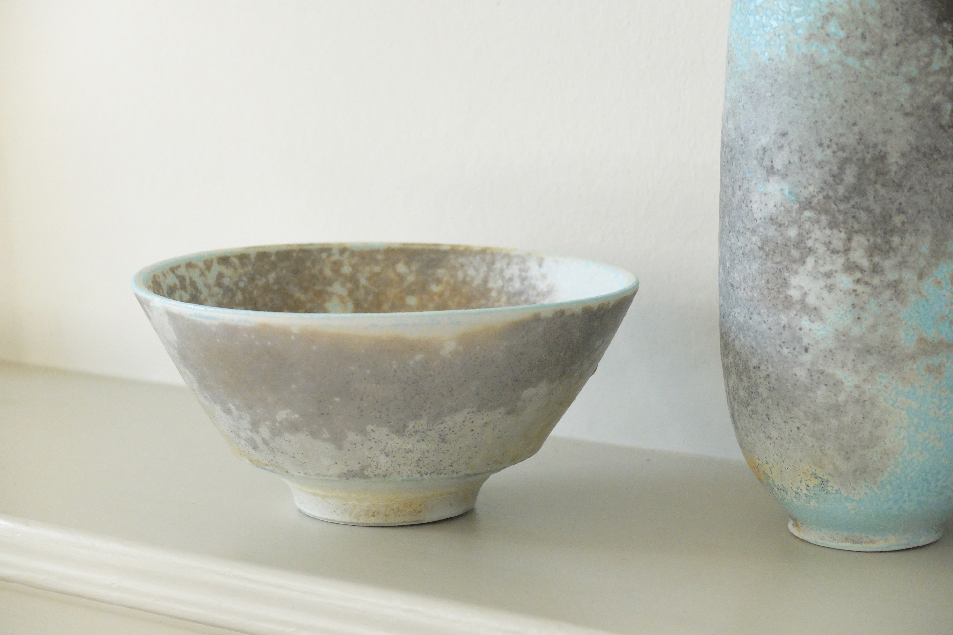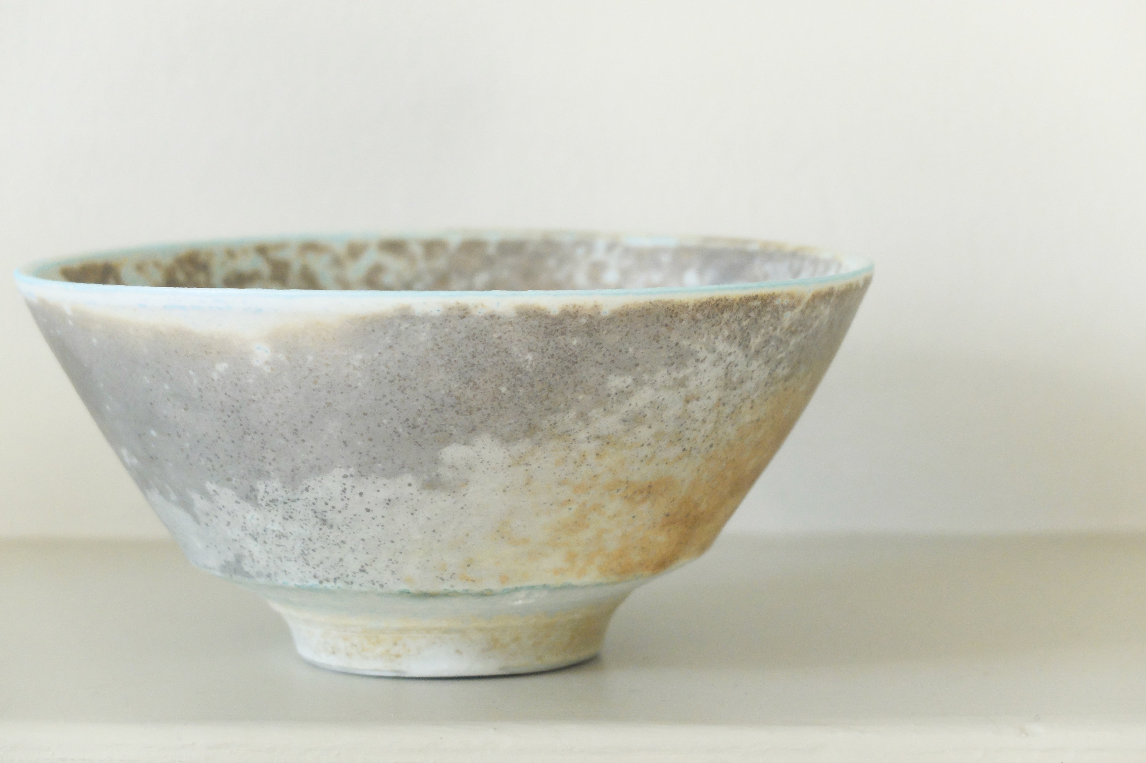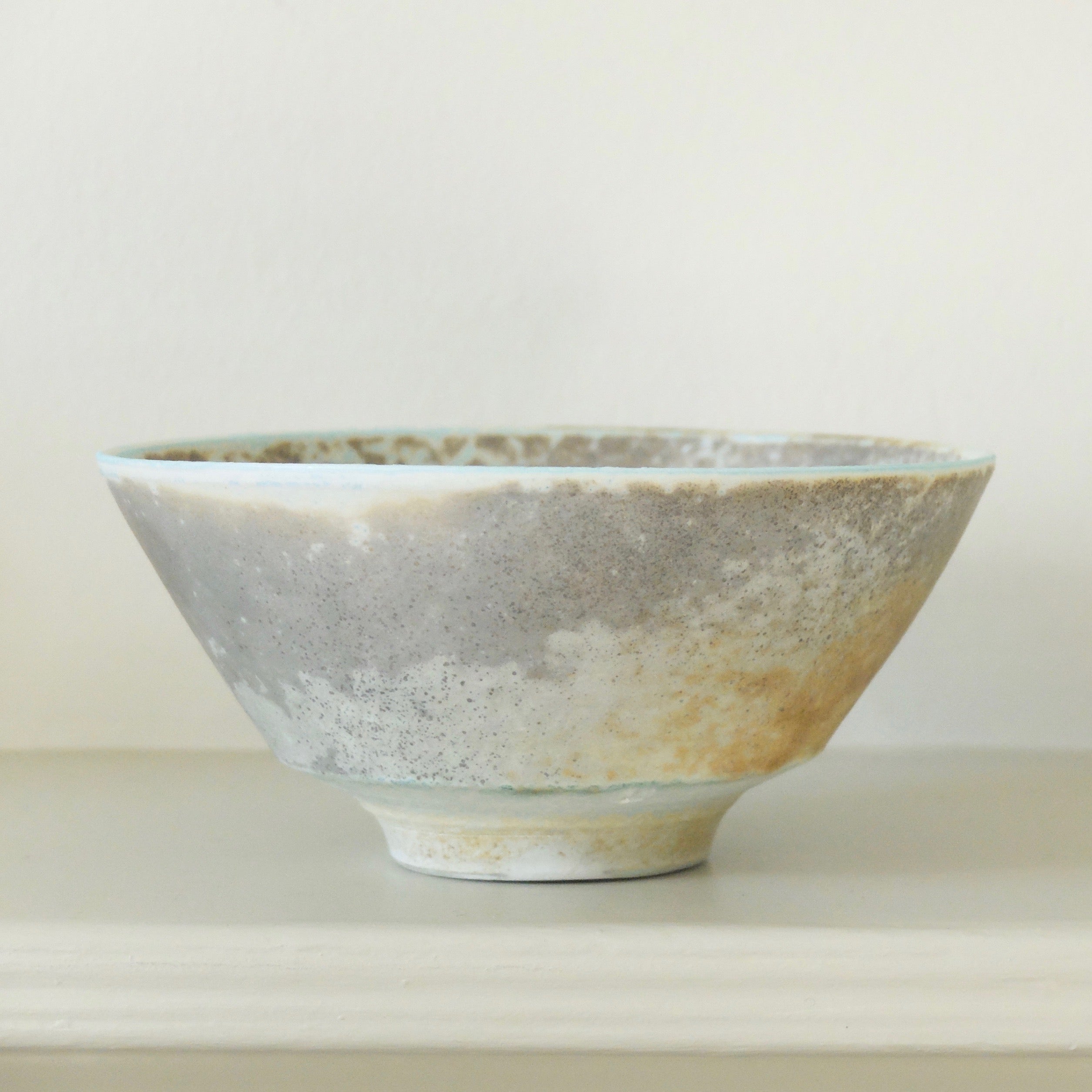 This piece, aptly named the summer tea bowl, exhibits an intricate lichen-like patterning of soft ochres and cool, grey blues - as if recalling the sky on a hazy, sun-soaked day. The bowl’s base is masterfully turned and curved, finished with the maker’s mark.