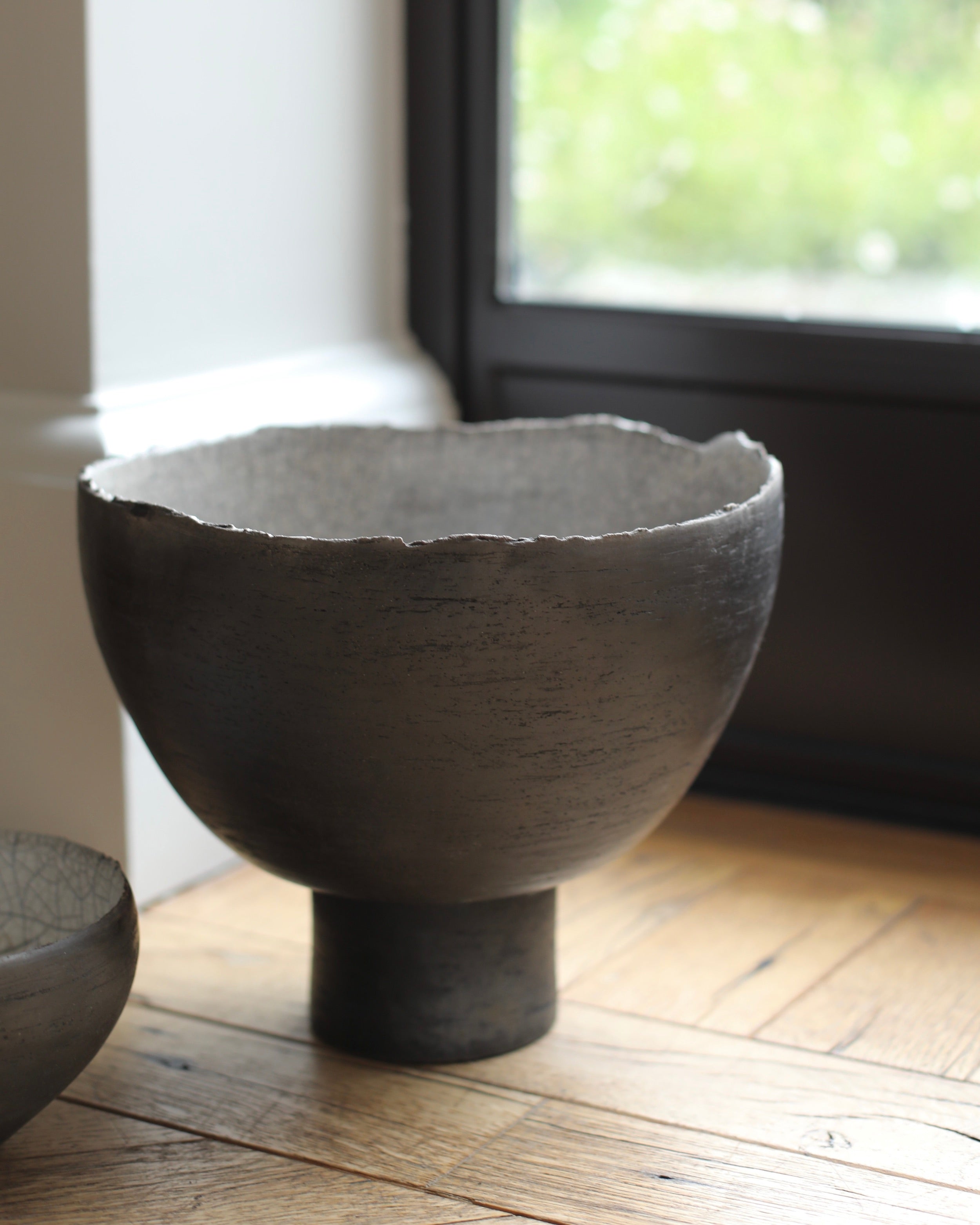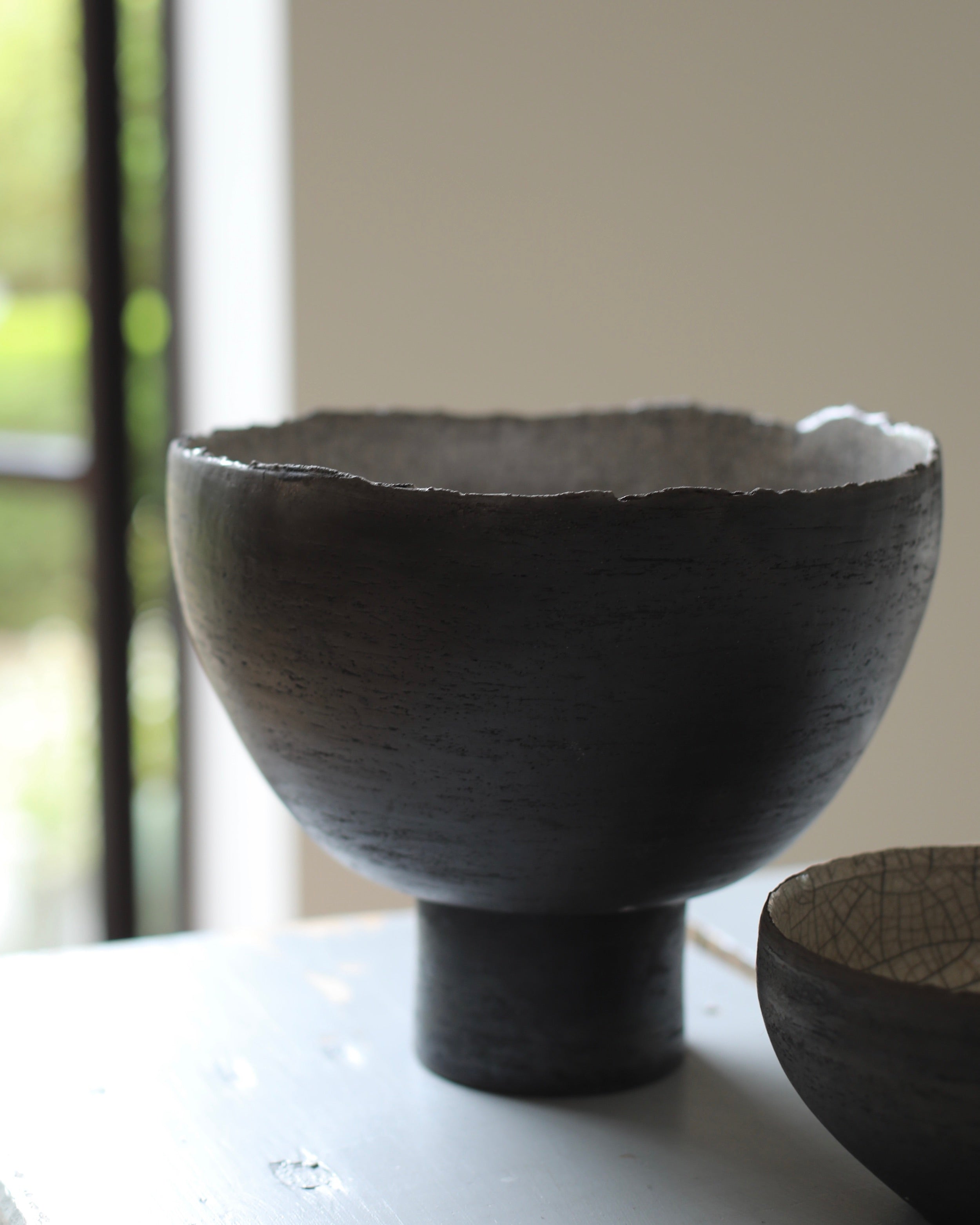 These hand-built vessels explore contrast through surface and form. The dark, reduction-fired exteriors are paired with raku-glazed interiors, revealing contrast between crackled texture and refined glaze. Torn and irregular rims speak to the physicality of making, while the surfaces retain the trace of intense thermal shifts.