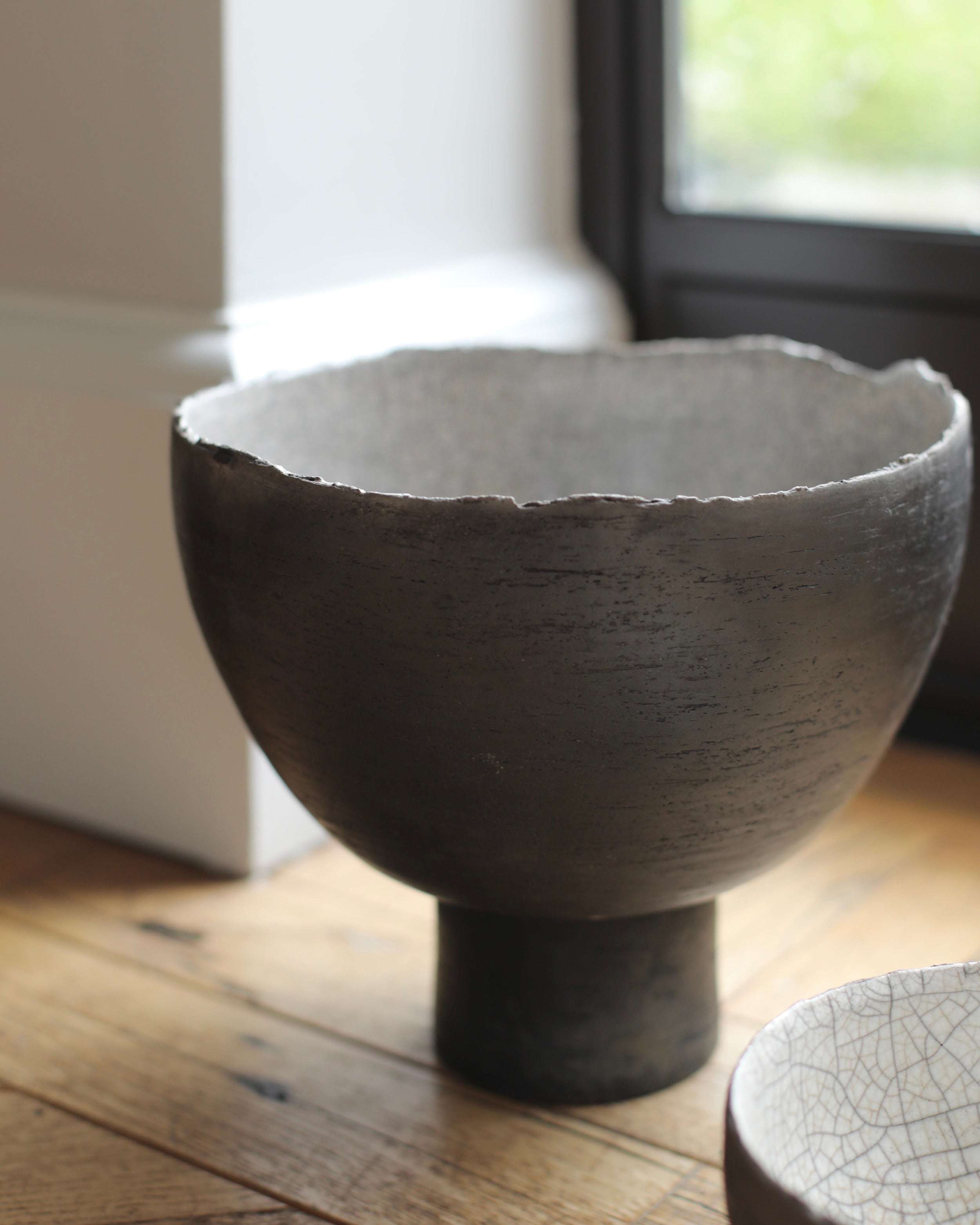 Material: Stoneware with a white crackled interior and smoke fired exterior