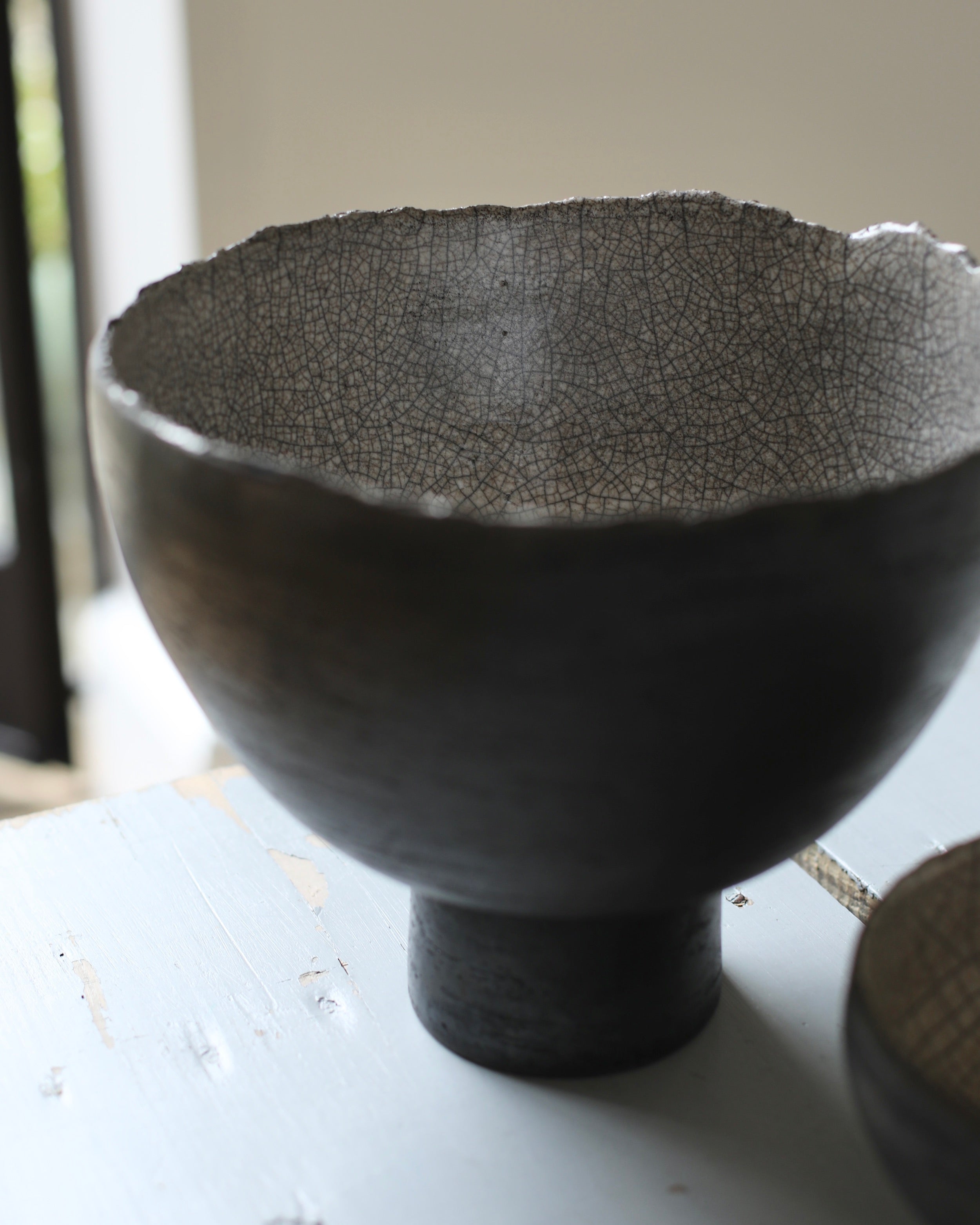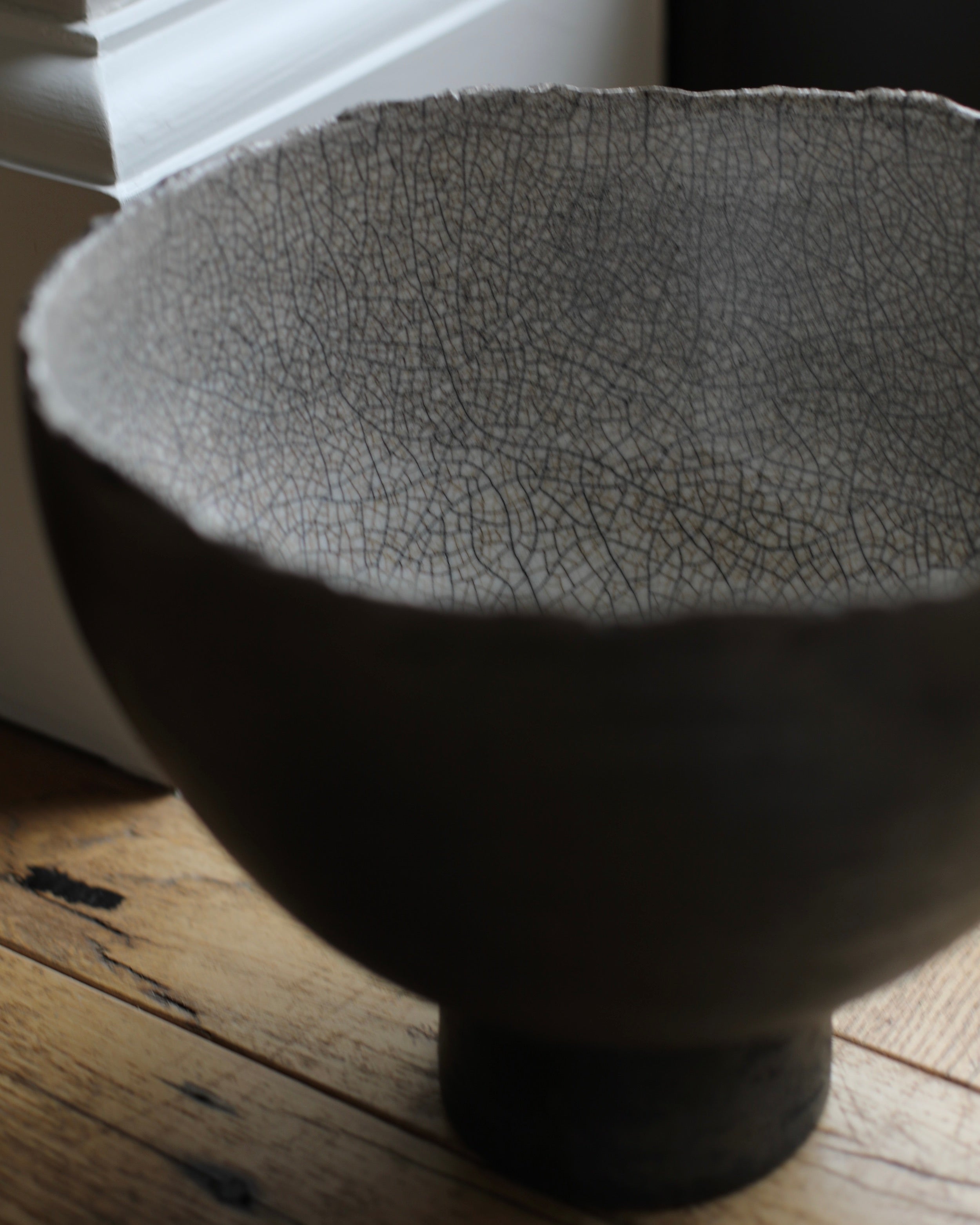 Jennifer Morris 'Large Raku pedestal bowl with a white crackle glaze'